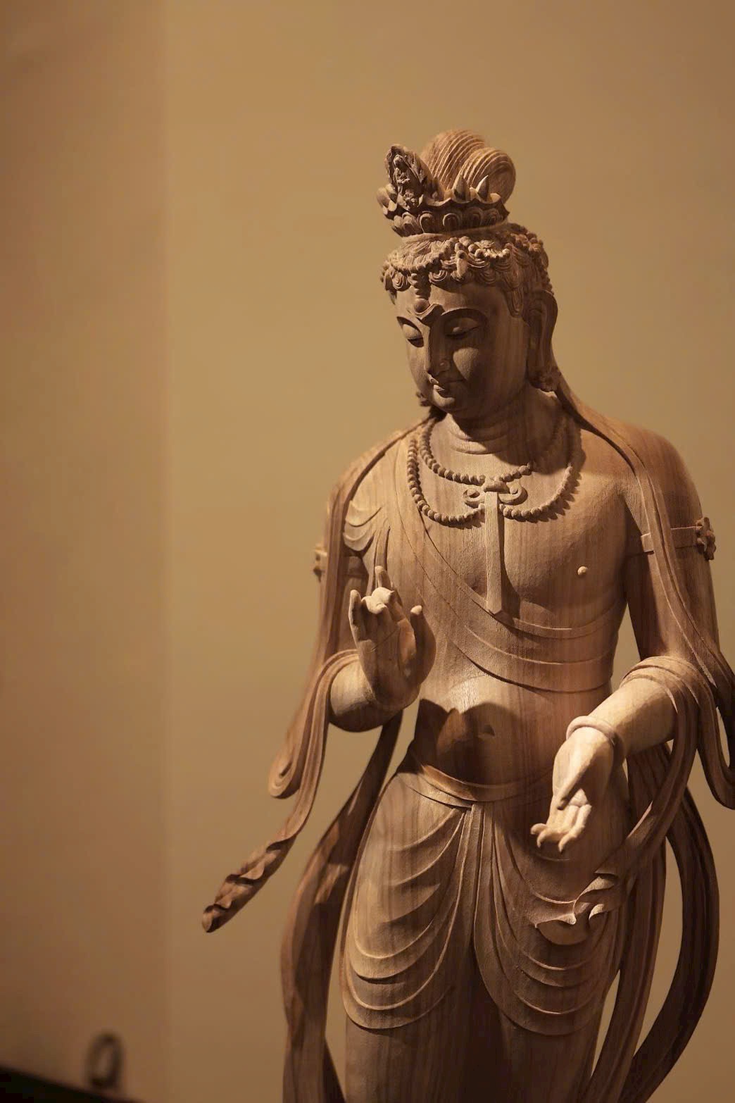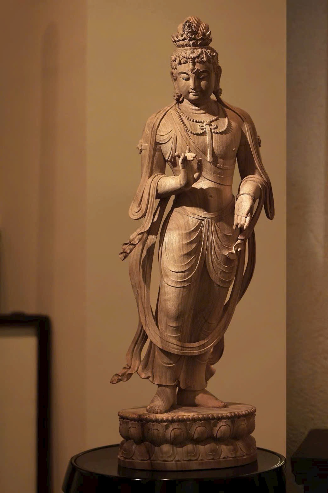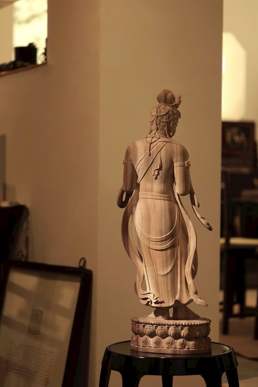 Nguyên mẫu lấy từ tượng Quan Âm tại quần thể hang đá Thiên Long Sơn. Chất liệu gỗ long não trăm năm tuổi, hương gỗ thanh khiết. Tác phẩm được chạm khắc tinh xảo, pháp y của Quan Âm tung bay mềm mại, dáng người uyển chuyển, thân thái tự nhiên thư giãn. Tạo hình đoan trang, thần thái an nhiên trầm tĩnh, hiền từ mà trang nghiêm. Quan Âm đứng chân trần trên đài sen, toát lên vẻ thanh tịnh và từ bi.