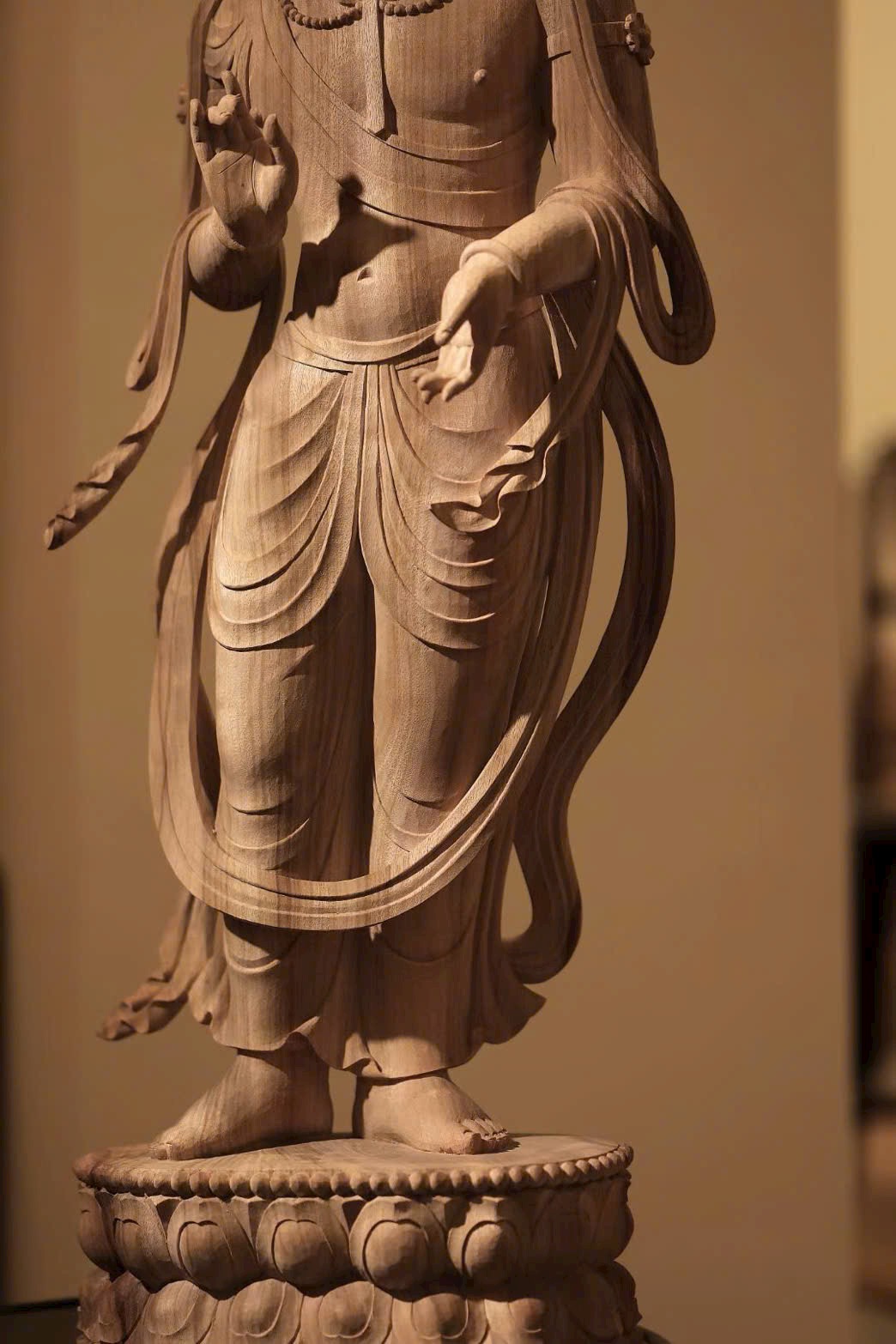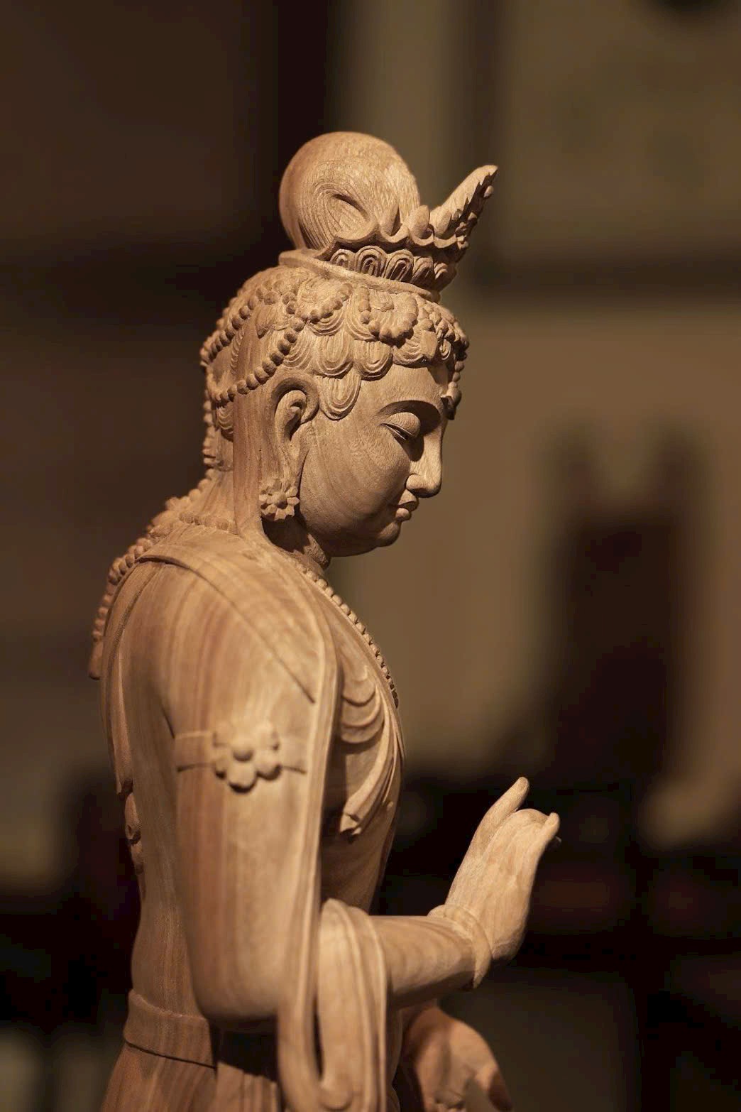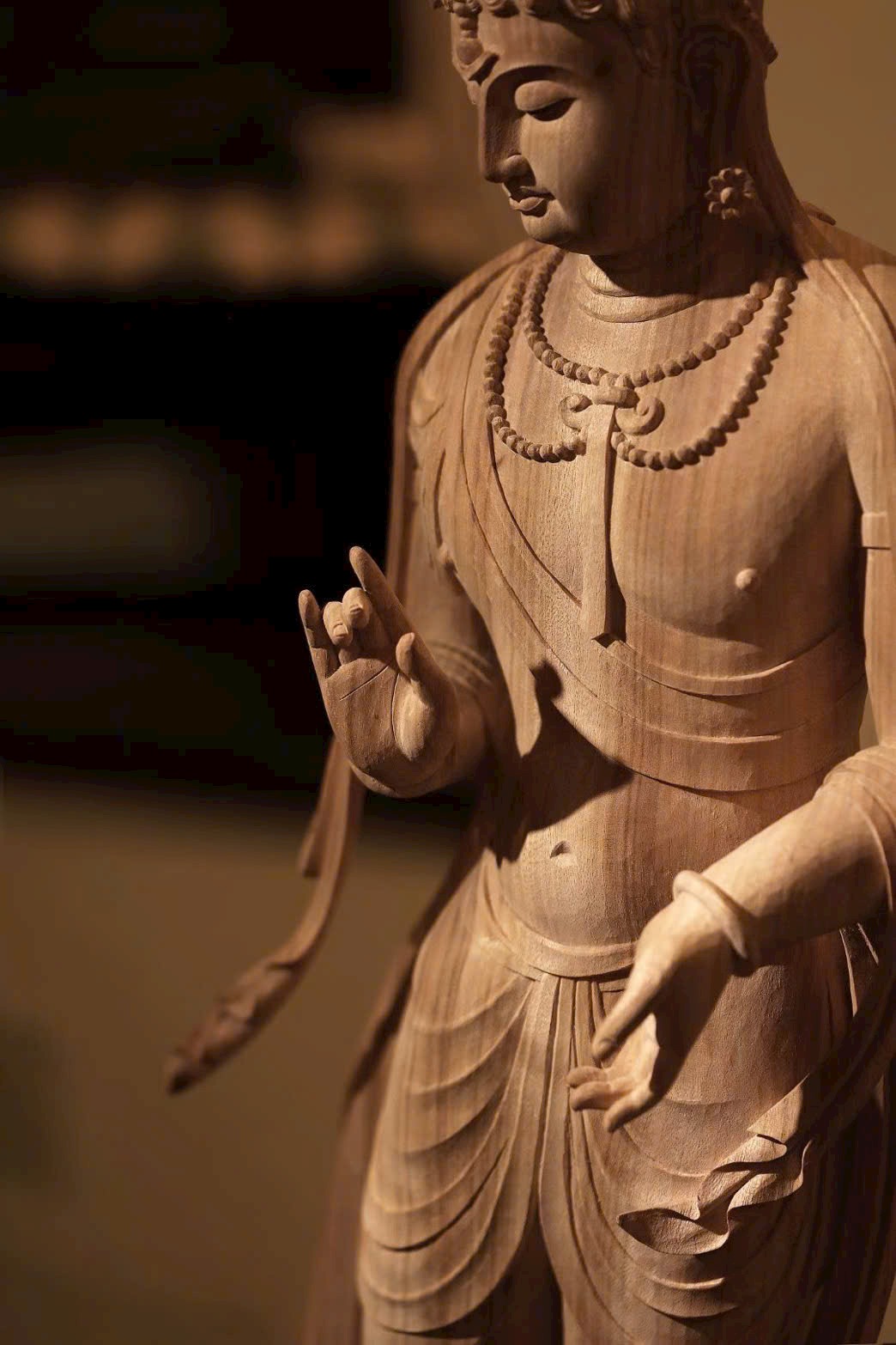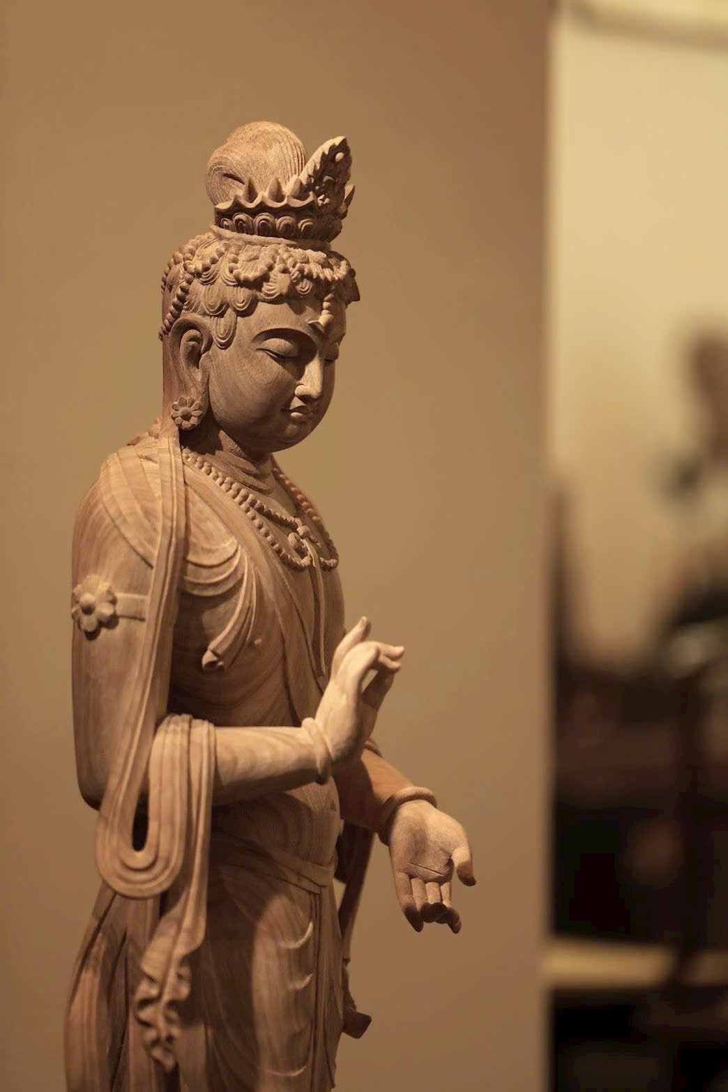 Nguyên mẫu lấy từ tượng Quan Âm tại quần thể hang đá Thiên Long Sơn. Chất liệu gỗ long não trăm năm tuổi, hương gỗ thanh khiết. Tác phẩm được chạm khắc tinh xảo, pháp y của Quan Âm tung bay mềm mại, dáng người uyển chuyển, thân thái tự nhiên thư giãn. Tạo hình đoan trang, thần thái an nhiên trầm tĩnh, hiền từ mà trang nghiêm. Quan Âm đứng chân trần trên đài sen, toát lên vẻ thanh tịnh và từ bi.
