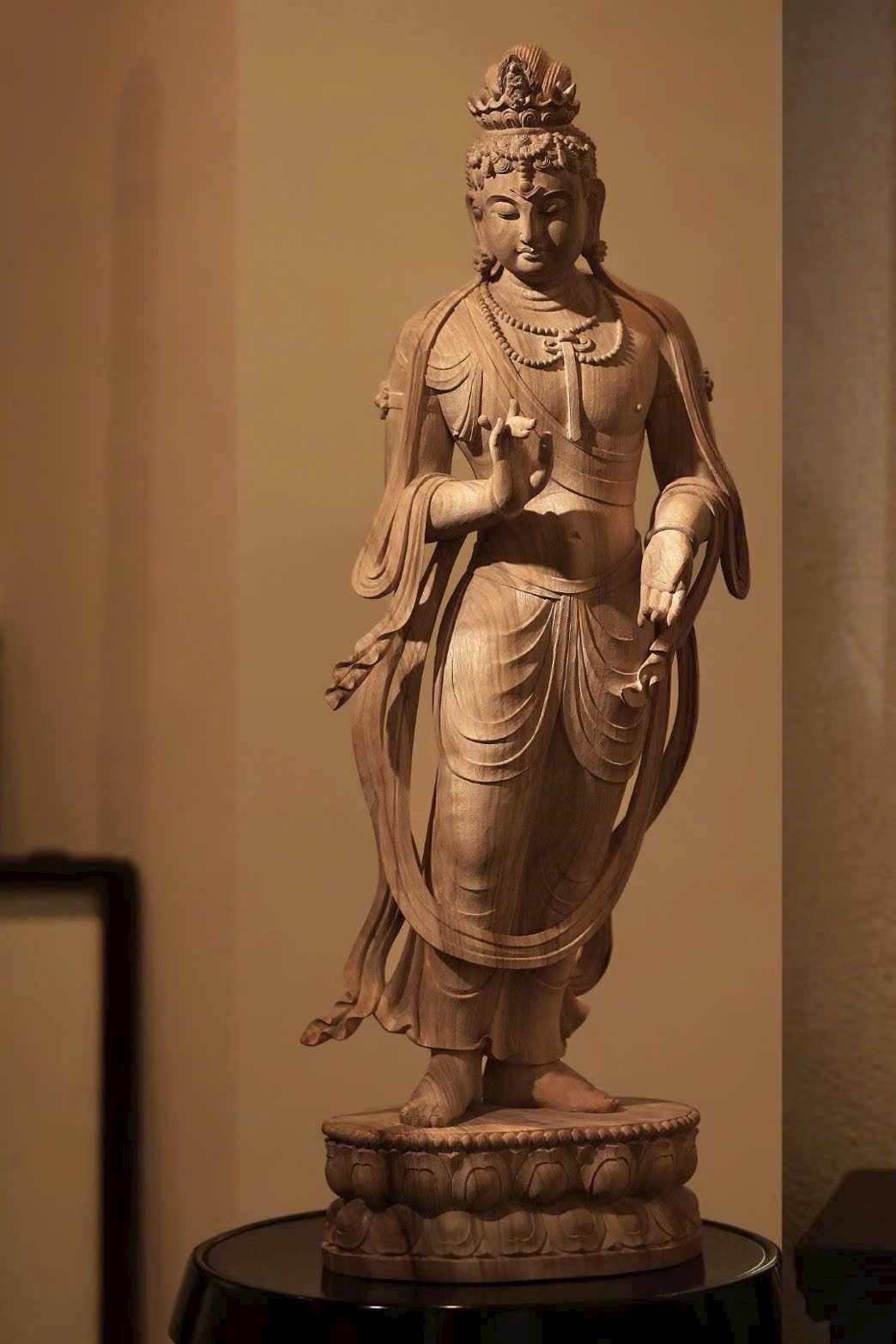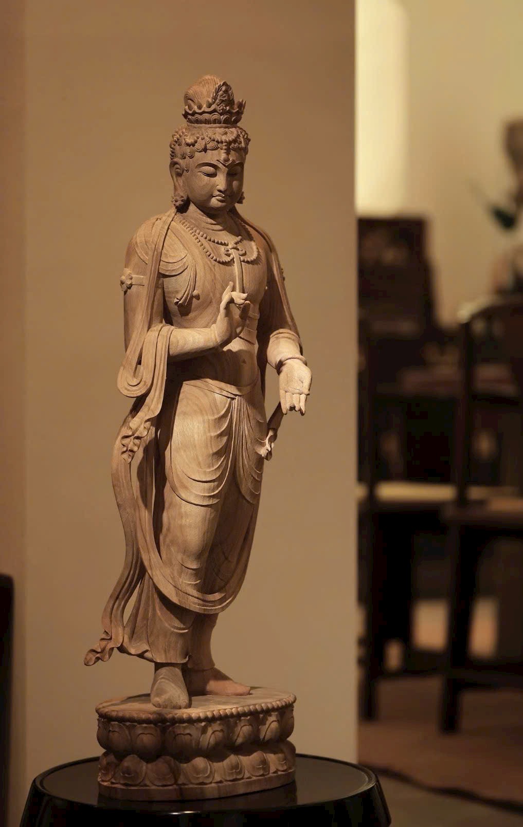 Nguyên mẫu lấy từ Quan Âm trong hang đá Thiên Long Sơn, dùng gỗ trăm năm chế tác. Điêu khắc tinh xảo, y phục Quan Âm bay bổng, dáng vẻ mềm mại uyển chuyển, thân hình tự nhiên thư thái. Tạo hình trang nghiêm, nét mặt bình hòa, từ bi trang trọng, chân trần đứng trên tòa sen bảo tọa.
