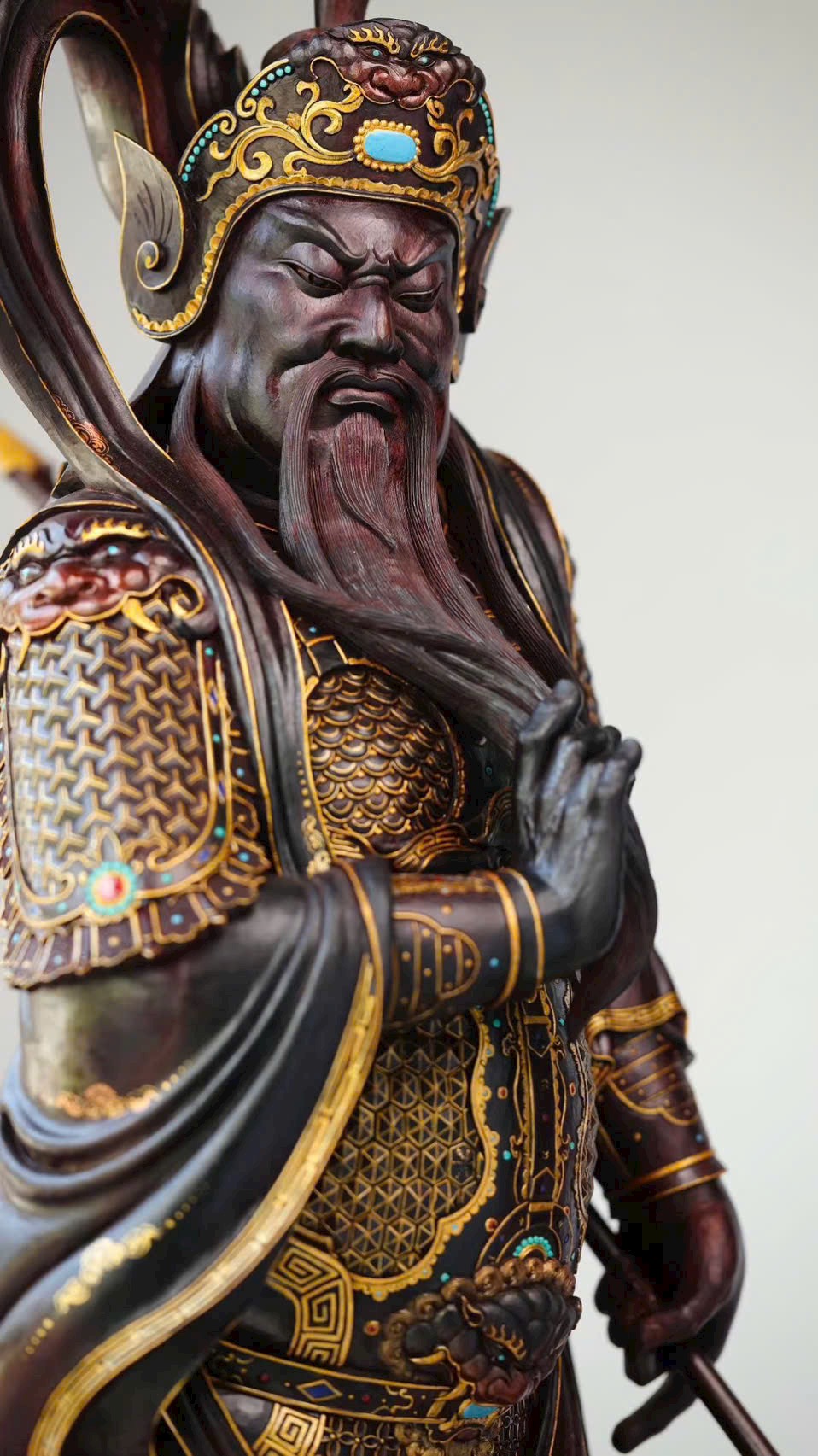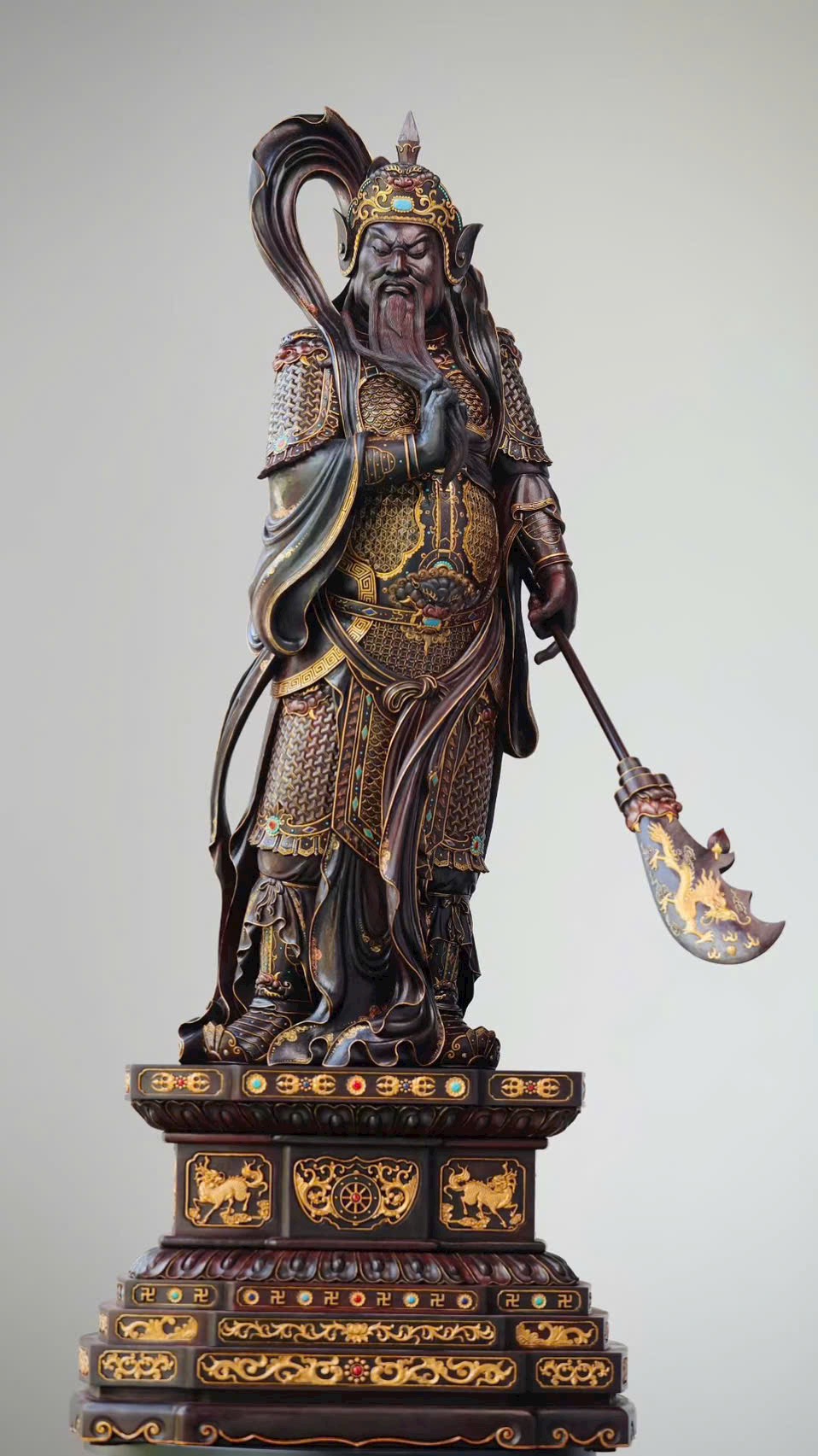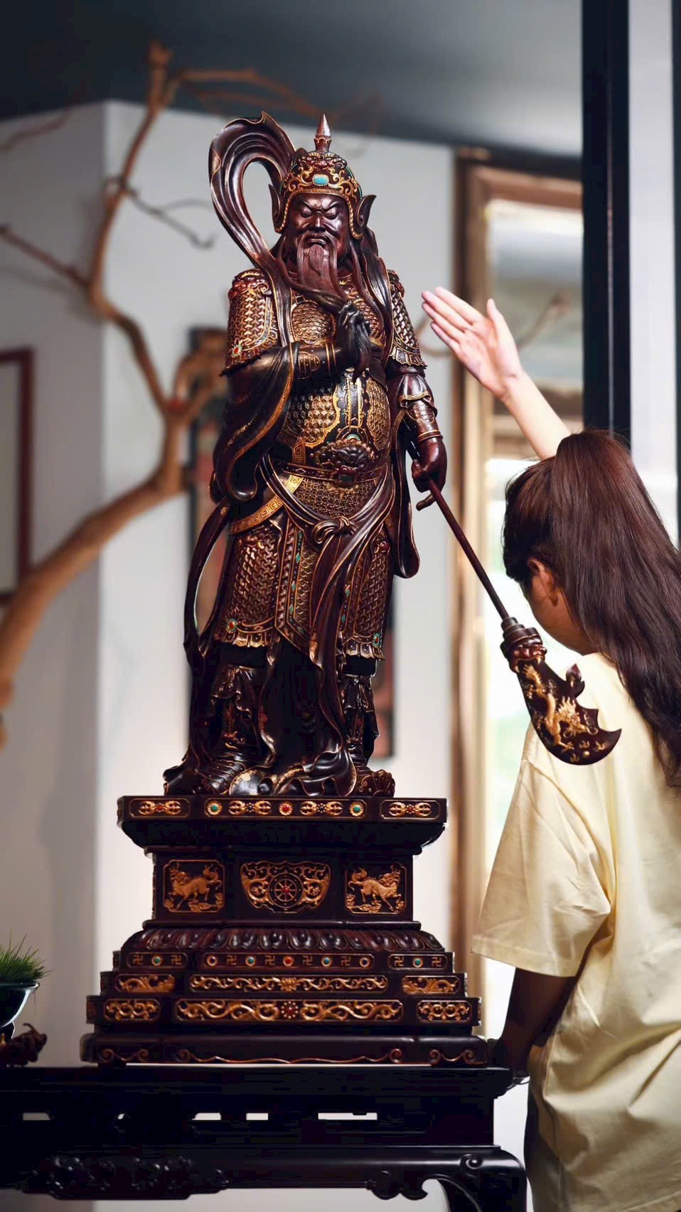 Tuyển chọn gỗ tử đàn Ấn Độ rừng già, lão liệu dày dặn, sắc gỗ trầm mặc cổ nhã. Tượng tròn chạm khắc toàn thân, đường đao tinh tế sinh động, nếp áo uyển chuyển như gió. Quan Đế tay ngang đao vuốt râu, giáp trụ hiên ngang tỏa uy, áo bào tung bay tạo thế, khí tượng võ thánh hùng vĩ hiện rõ. Hàm ý trấn giữ bình an, nạp phúc tụ tài, là điển tàng cát tường kết hợp văn – võ, tài – đức.