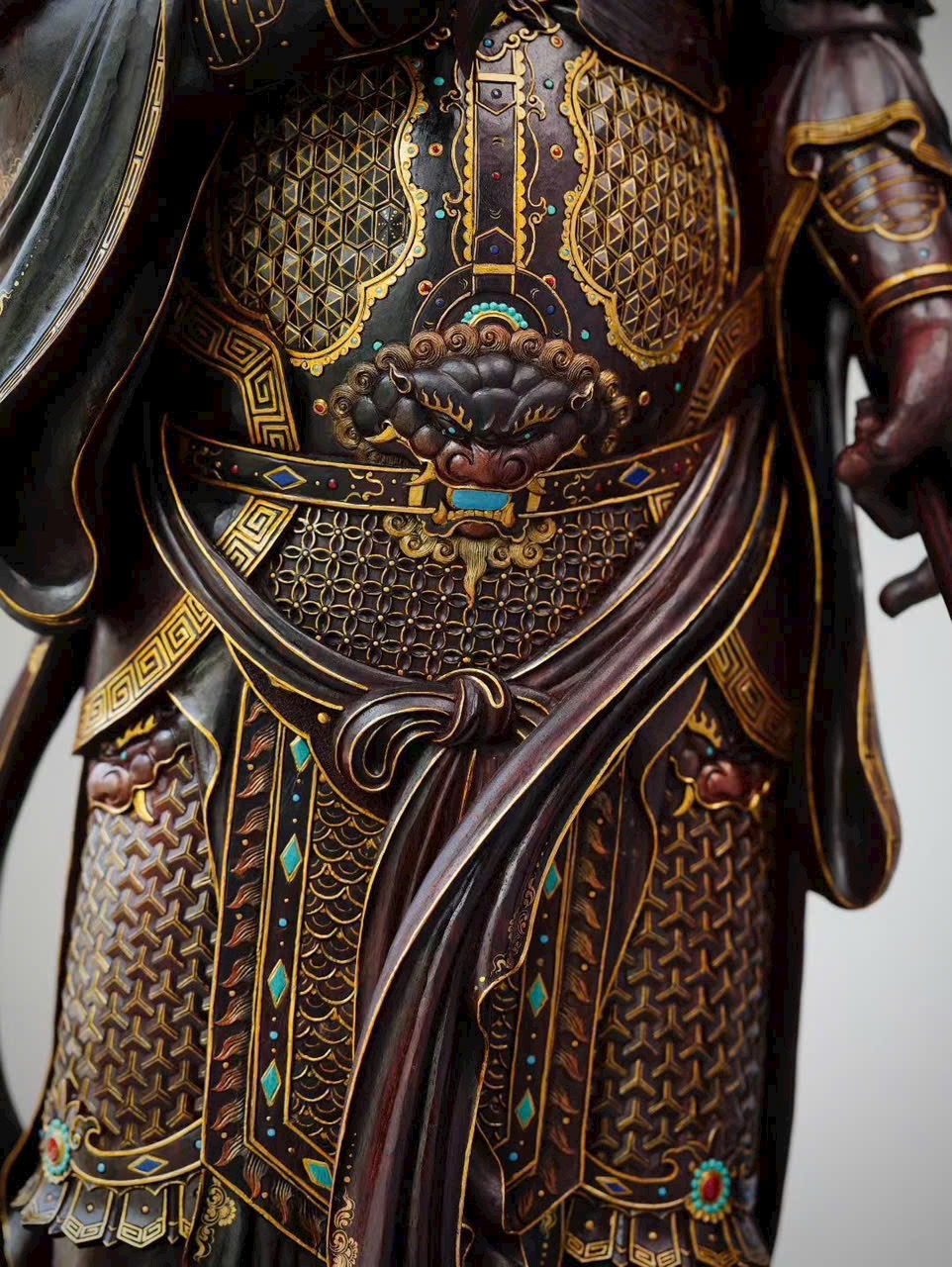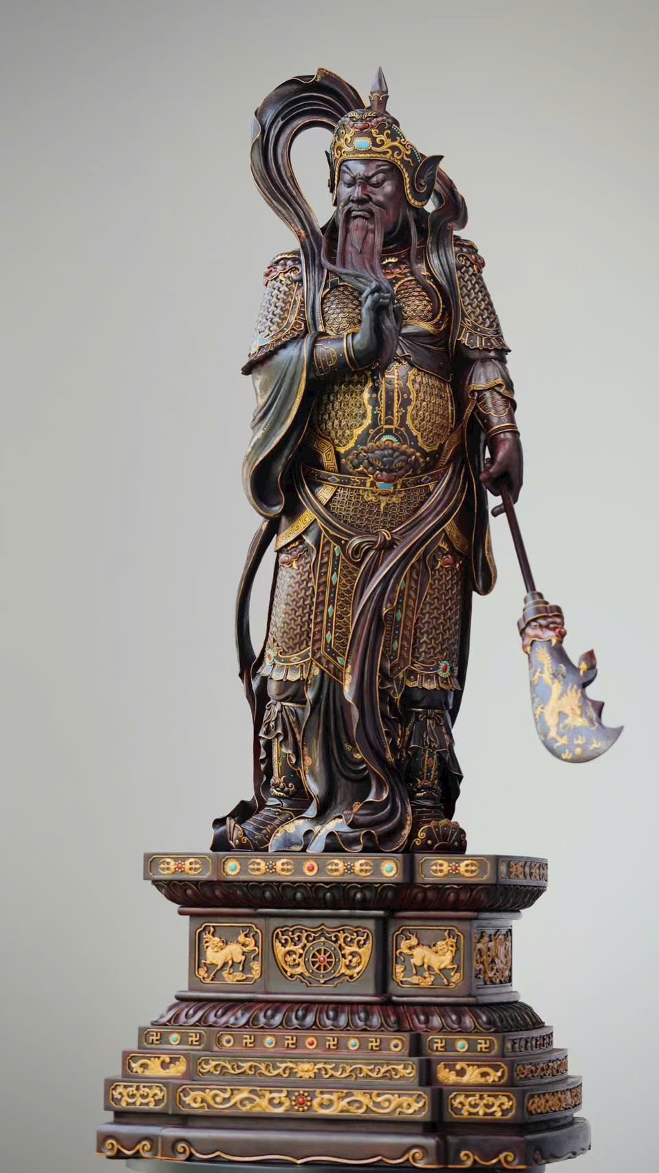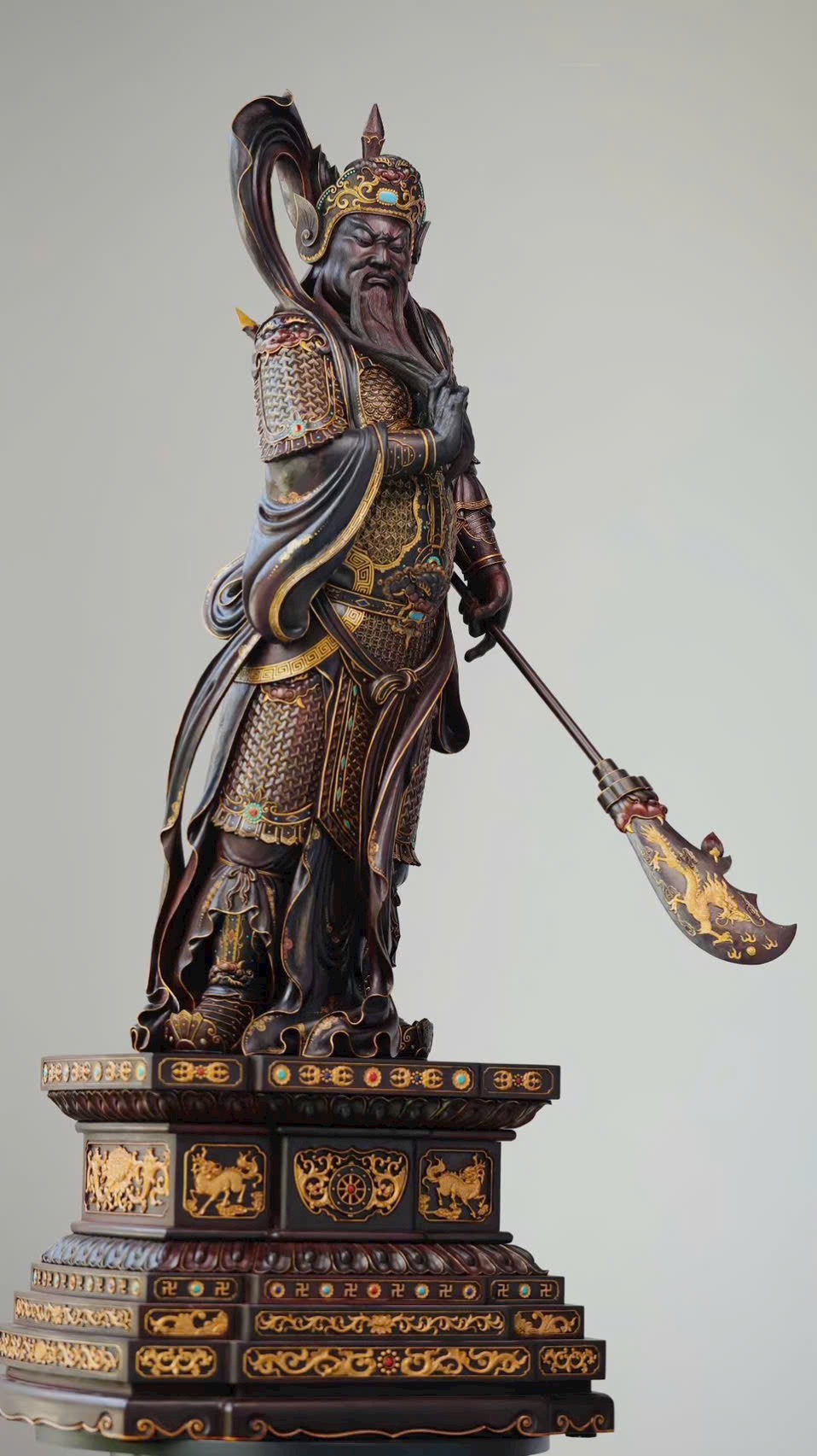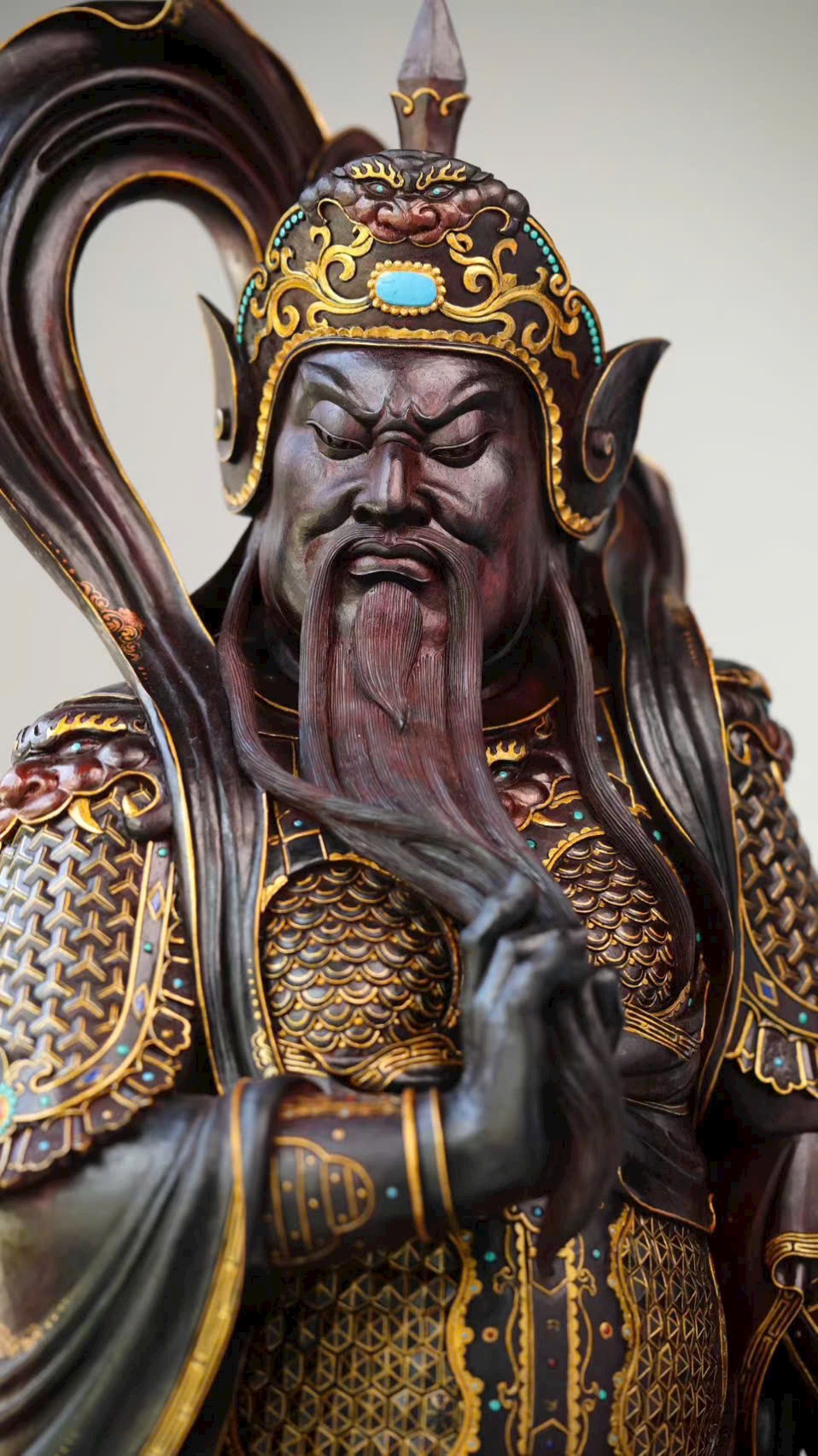 Tuyển chọn gỗ tử đàn Ấn Độ rừng già, lão liệu dày dặn, sắc gỗ trầm mặc cổ nhã. Tượng tròn chạm khắc toàn thân, đường đao tinh tế sinh động, nếp áo uyển chuyển như gió. Quan Đế tay ngang đao vuốt râu, giáp trụ hiên ngang tỏa uy, áo bào tung bay tạo thế, khí tượng võ thánh hùng vĩ hiện rõ. Hàm ý trấn giữ bình an, nạp phúc tụ tài, là điển tàng cát tường kết hợp văn – võ, tài – đức.