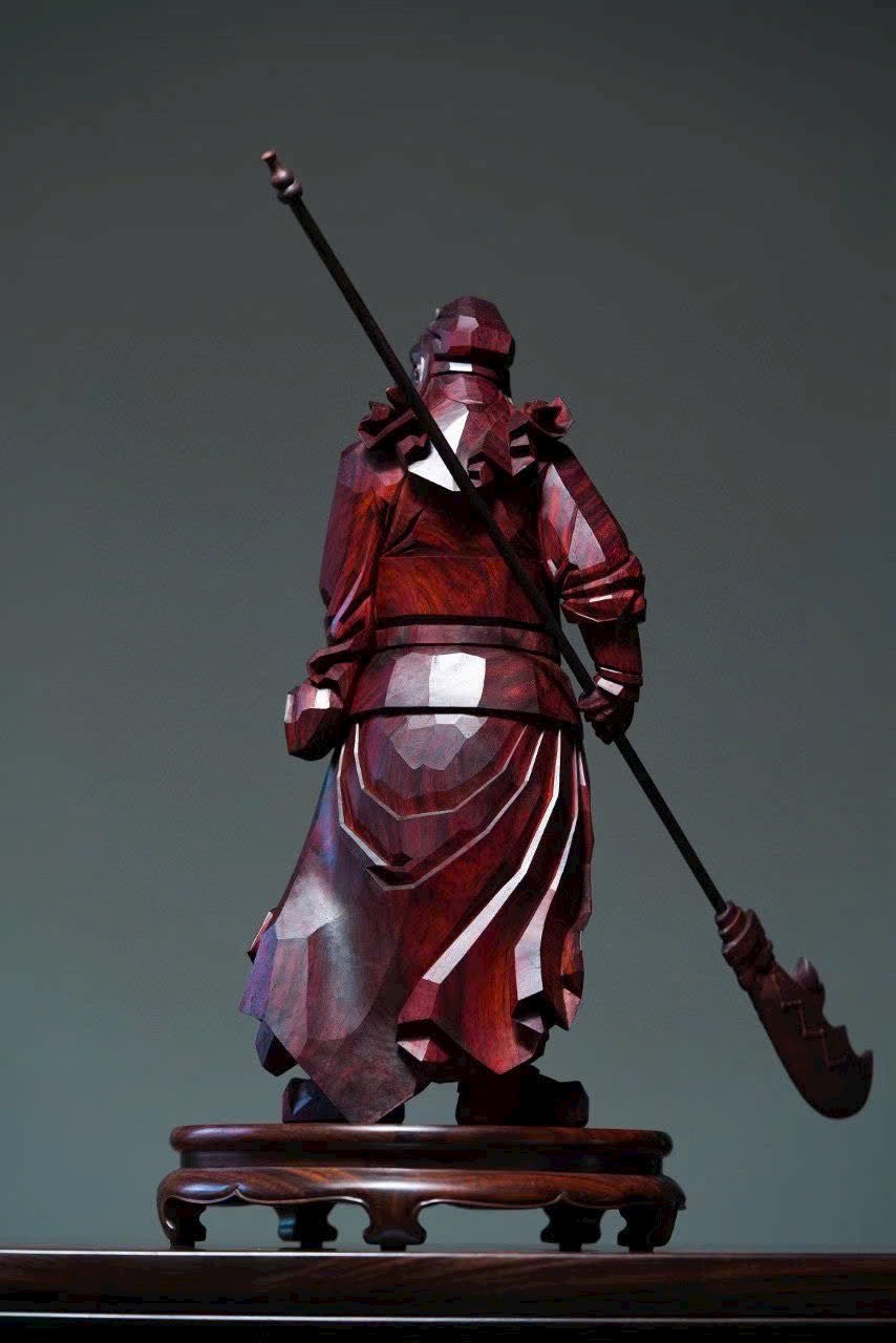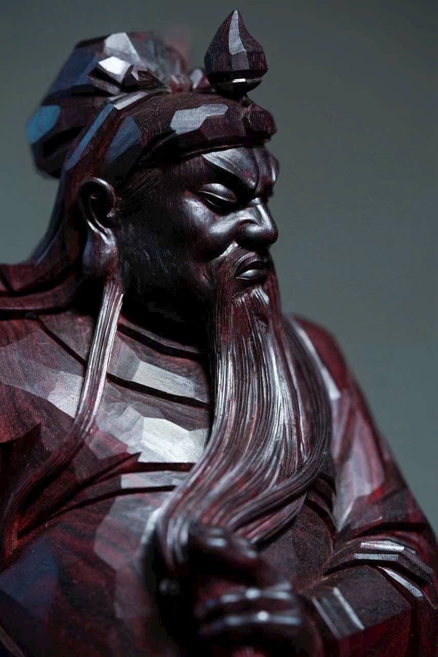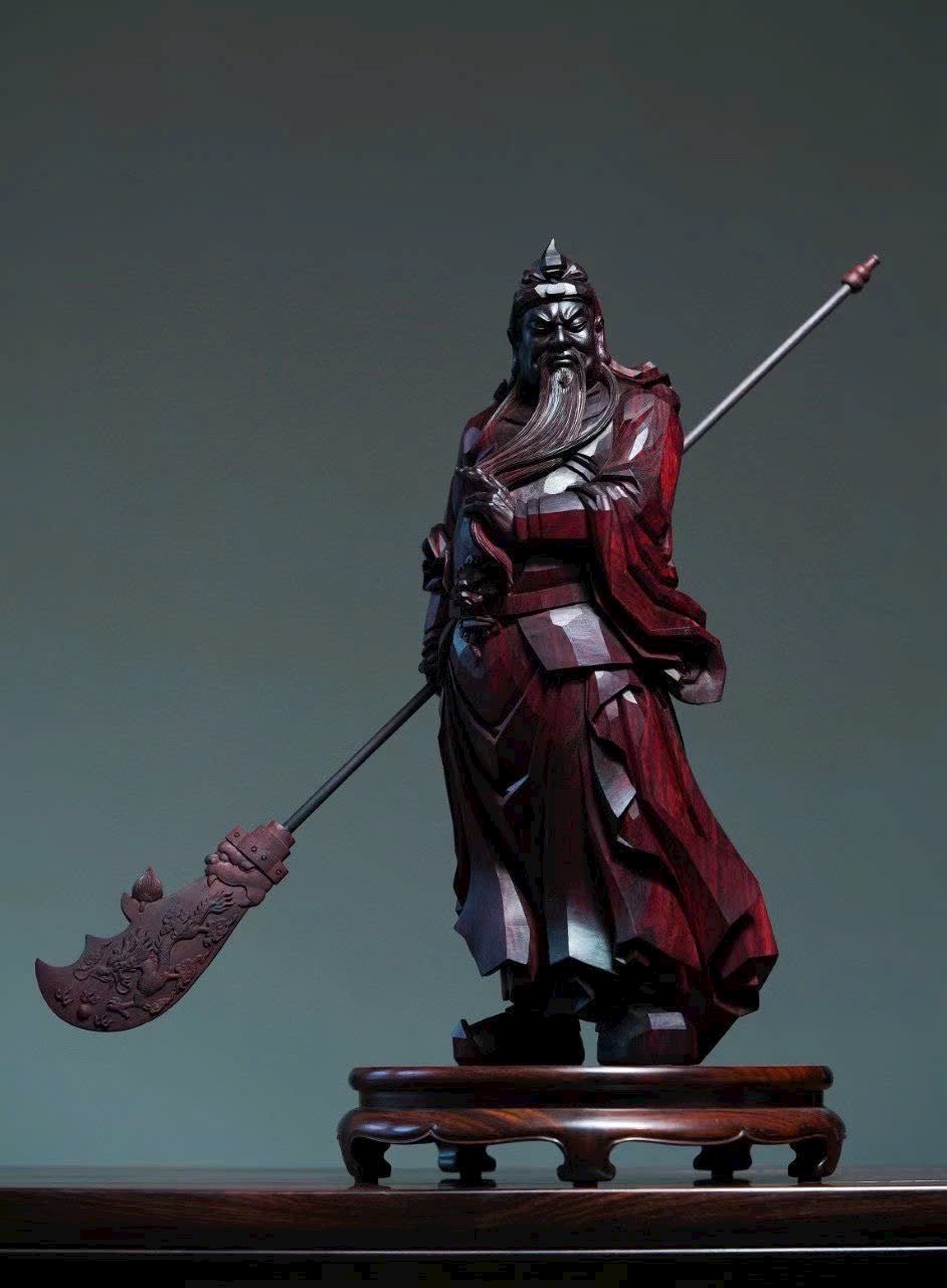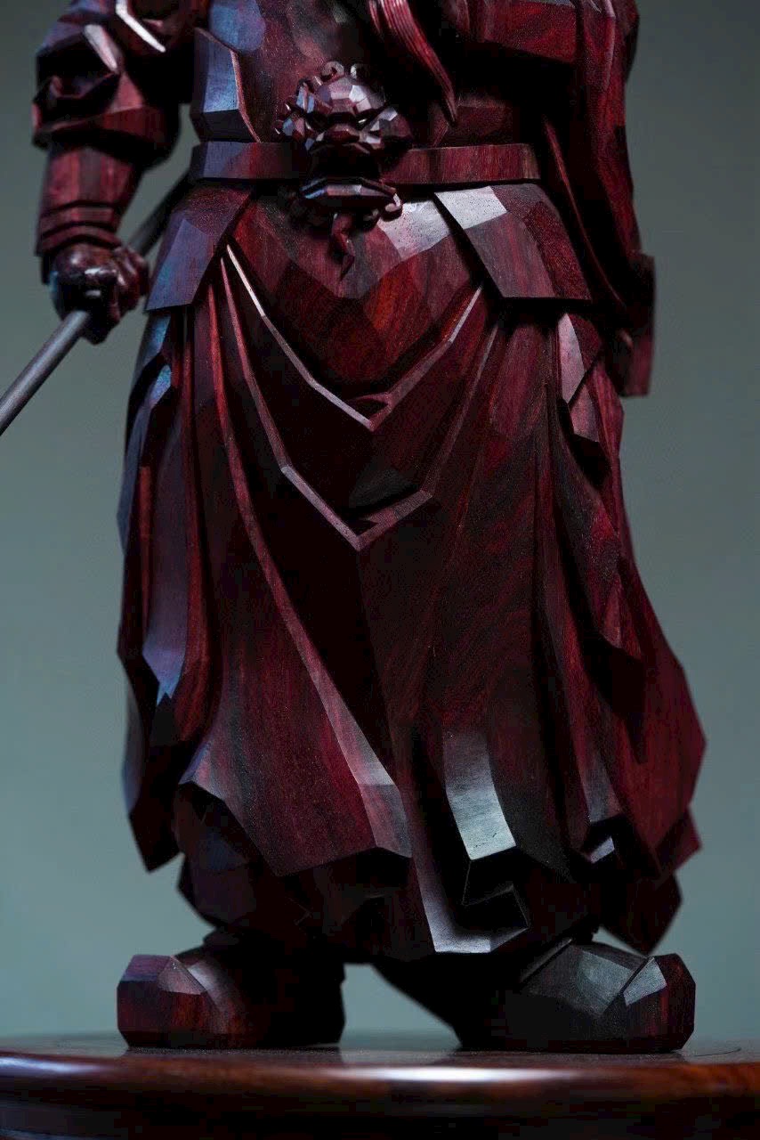 Chọn lão liệu rắn chắc, chạm khắc thủ công bằng đao pháp tinh tế, tỉ mỉ. Gần ngắm thấy rõ hoa văn giáp trụ, bảo đới tung bay sinh động. Hình tượng thần thái tràn đầy, Quan Công ngang đao vuốt râu, đứng vững như Thái Sơn, khí thế trấn sơn hà.