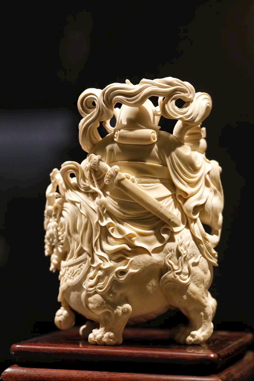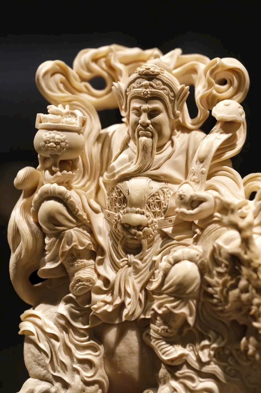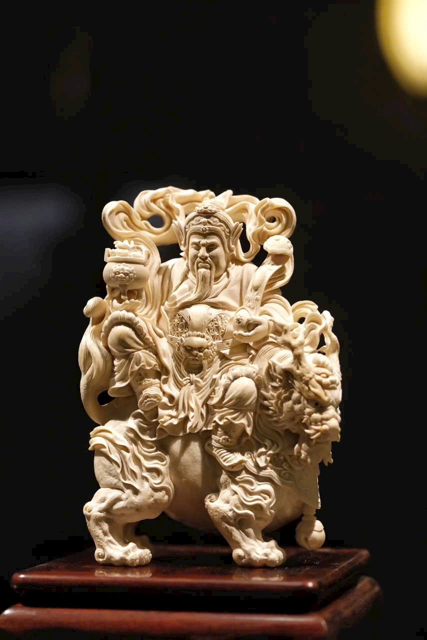 Được chạm khắc thủ công từ một khối gỗ liền mạch, với kỹ thuật điêu luyện và đường dao tinh tế. Võ Thần Tài an tọa uy nghi trên lưng Thụy Thú, tay cầm bảo lư và như ý, tà áo tung bay như mây trôi.