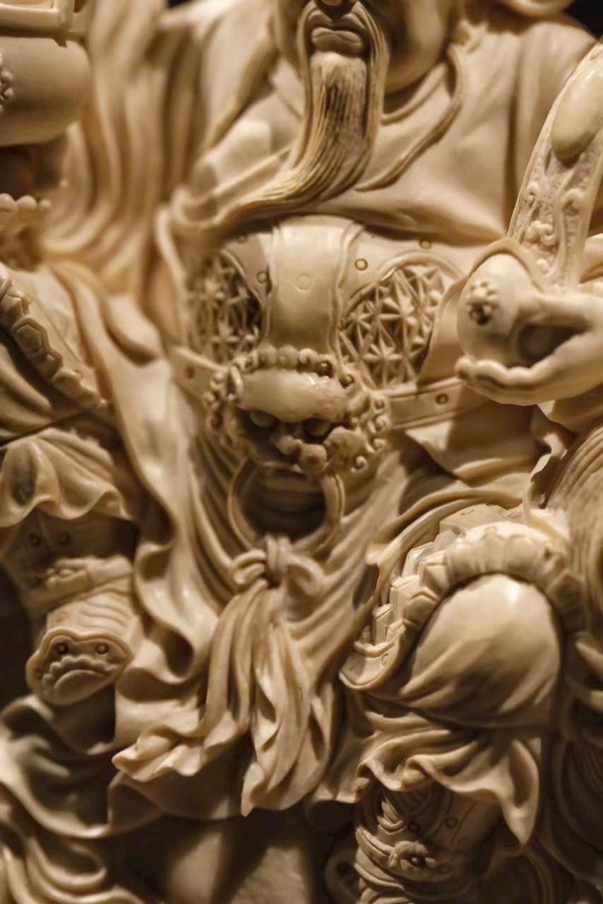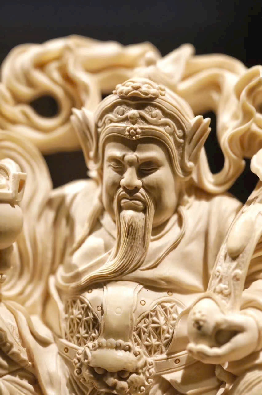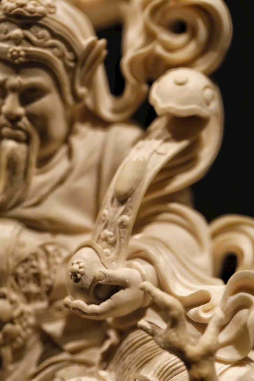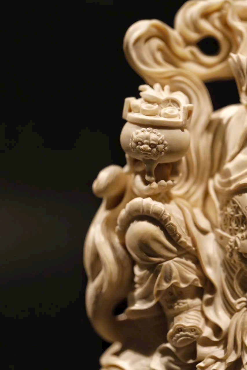 Được chạm khắc thủ công từ một khối gỗ liền mạch, với kỹ thuật điêu luyện và đường dao tinh tế. Võ Thần Tài an tọa uy nghi trên lưng Thụy Thú, tay cầm bảo lư và như ý, tà áo tung bay như mây trôi.