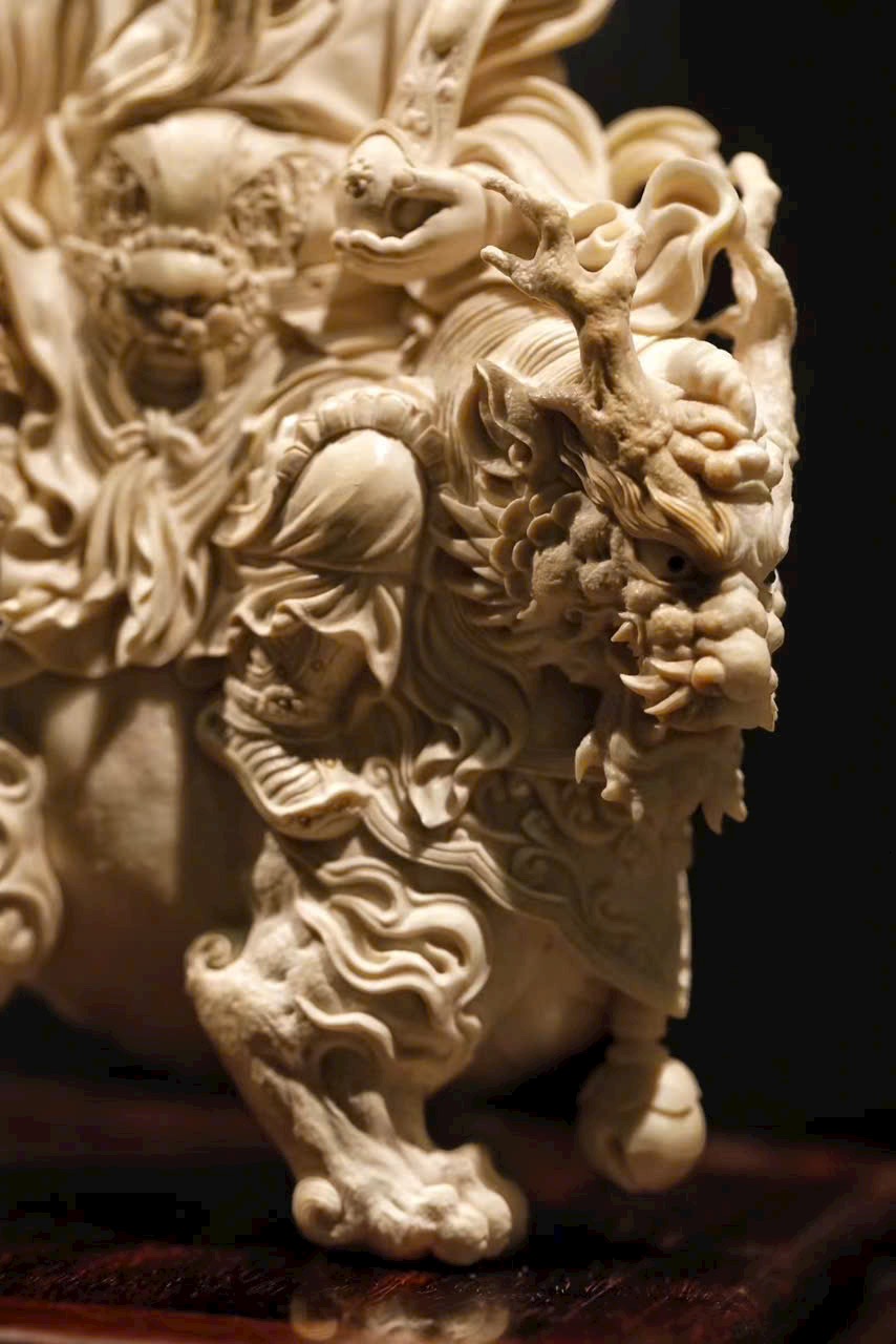 Thụy Thú oai phong, linh hoạt, bờm xoăn mềm mại như cuộn sóng. Tài Thần có gương mặt hiền hòa, râu dài rủ trước ngực, giáp phục trang trí cầu kỳ, tinh xảo. Tác phẩm toát lên vẻ trang nghiêm, tao nhã – là lựa chọn tuyệt vời cho cả việc trưng bày lẫn thờ phụng.