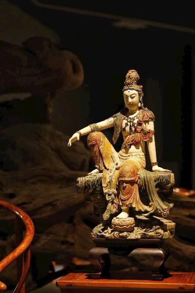 Lấy gỗ chương mộc làm phôi, khoáng trang trí thân, phục chế theo hình tượng kinh điển Quán Thế Âm Thủy Nguyệt. Thần thái Ngài an hòa, tà áo uyển chuyển như sóng nước, sắc màu khoáng vật theo năm tháng càng thêm cổ nhã. Tượng tái hiện cảnh giới “Thủy Nguyệt thiền tâm”, vừa trang nghiêm thánh khiết, vừa thấm đượm thi vị Phật tượng.
