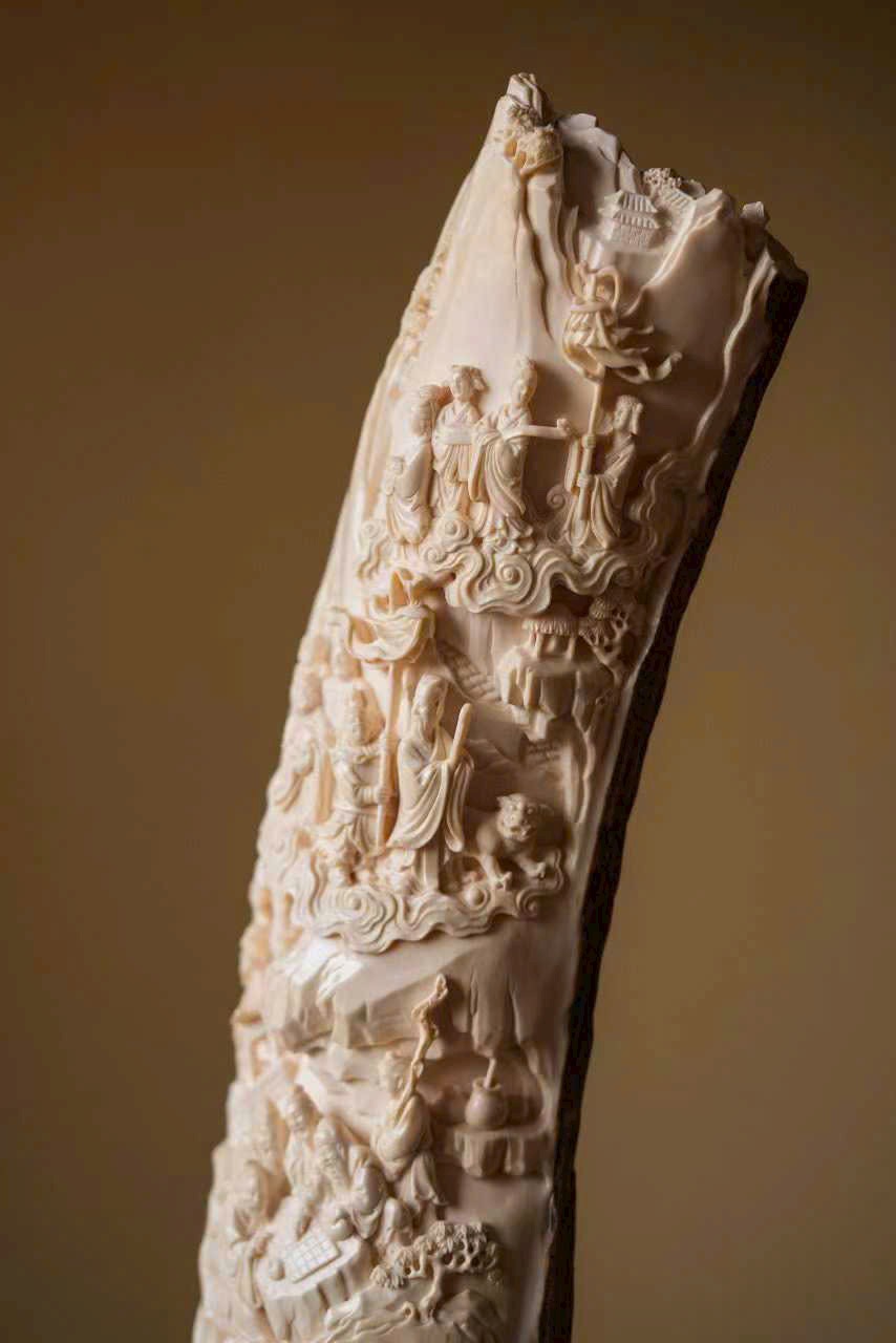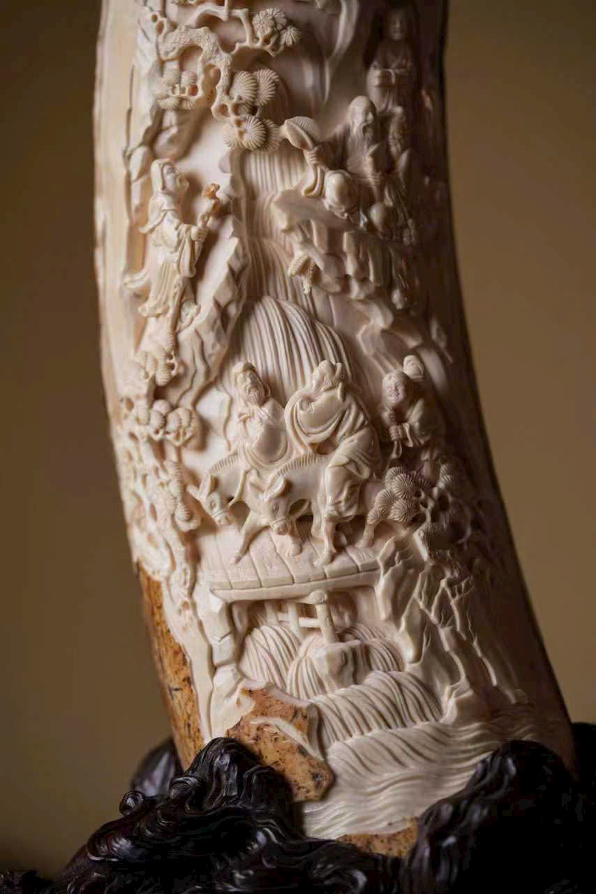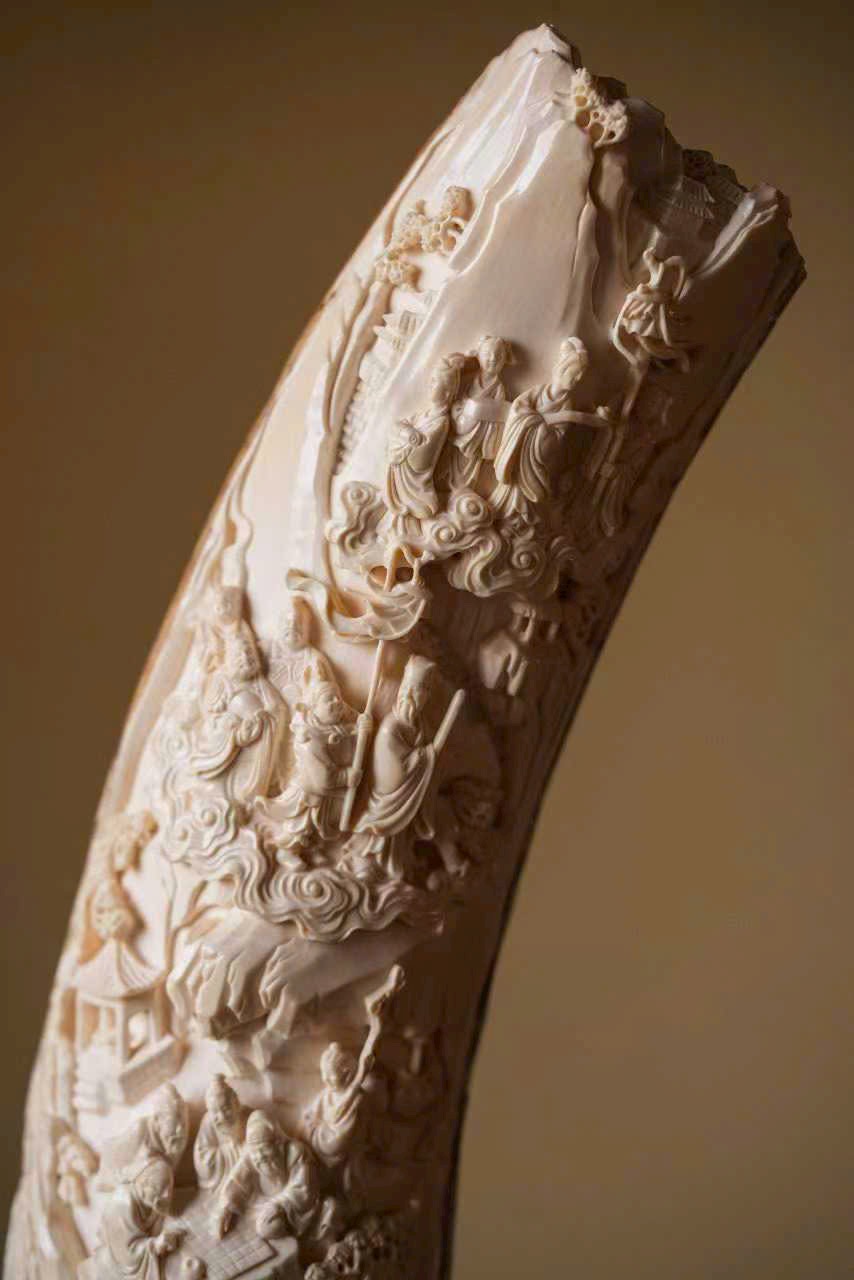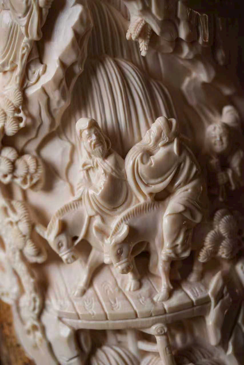 Sắc n.gà trắng ngần như tuyết tụ, trên đó chạm khắc cảnh chư tiên đến Dao Trì. Tà áo rộng vờn mây, bước chân sinh hoa sen; chuỗi anh lạc nhẹ bay, mang theo ánh ráng chiều.