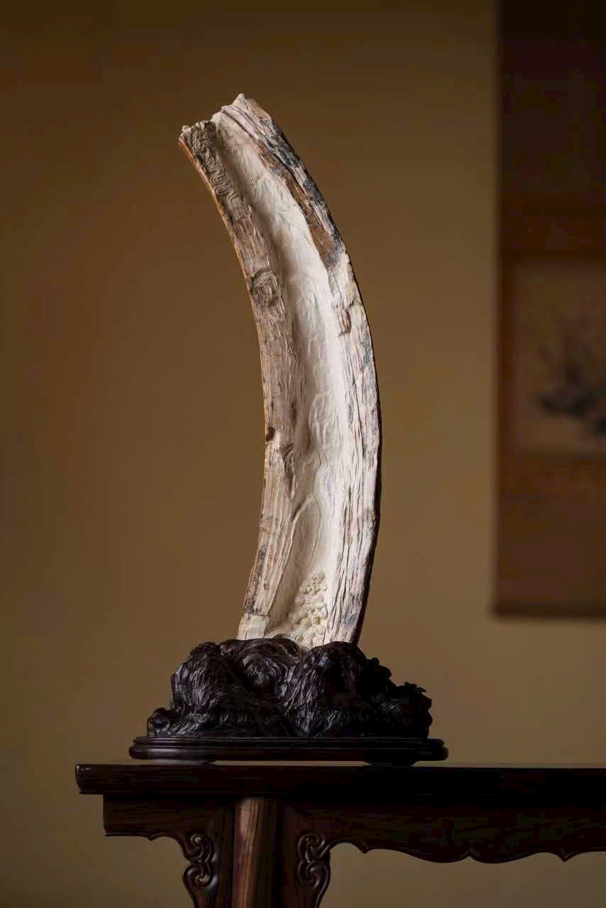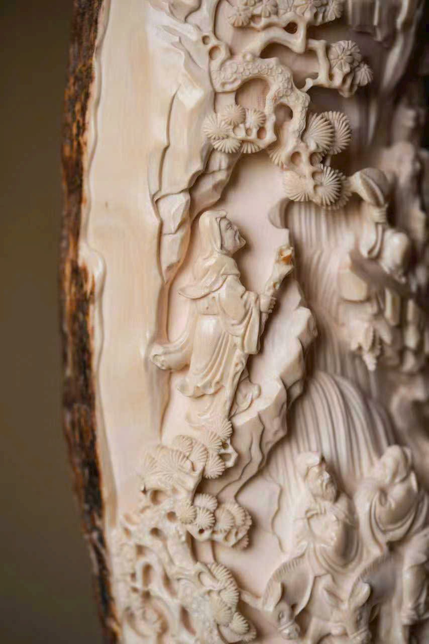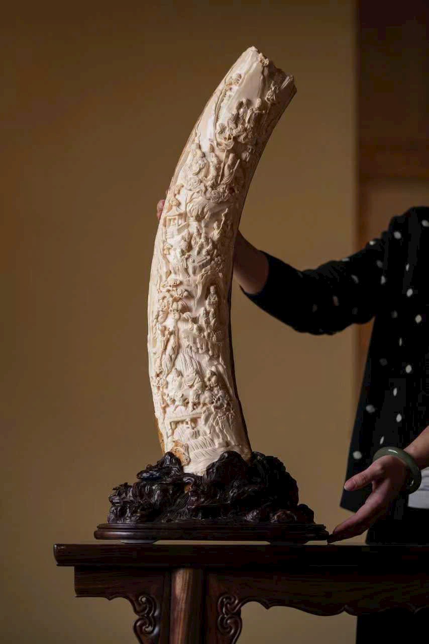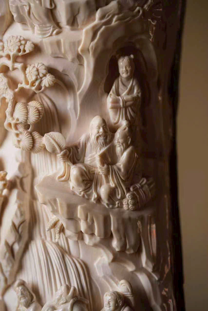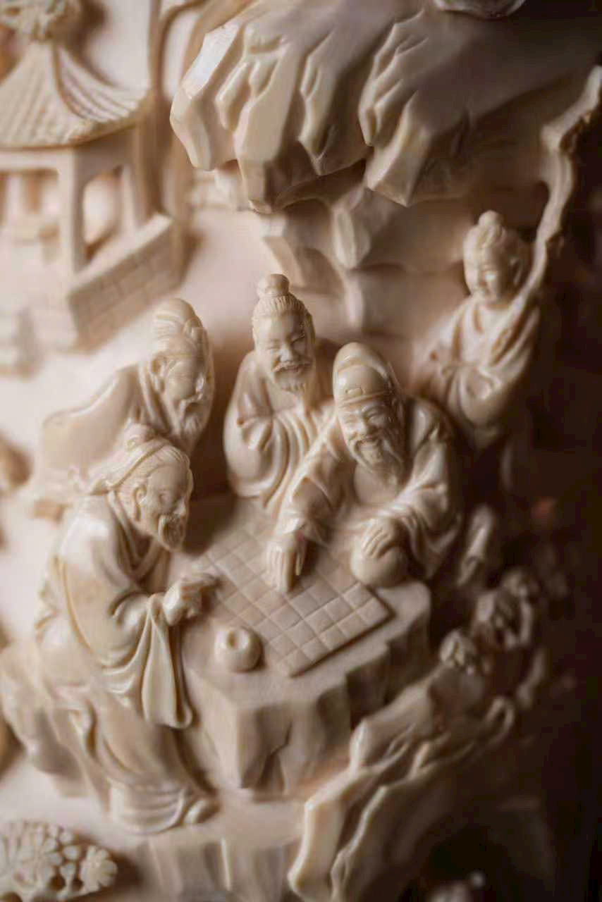 Sắc n.gà trắng ngần như tuyết tụ, trên đó chạm khắc cảnh chư tiên đến Dao Trì. Tà áo rộng vờn mây, bước chân sinh hoa sen; chuỗi anh lạc nhẹ bay, mang theo ánh ráng chiều.