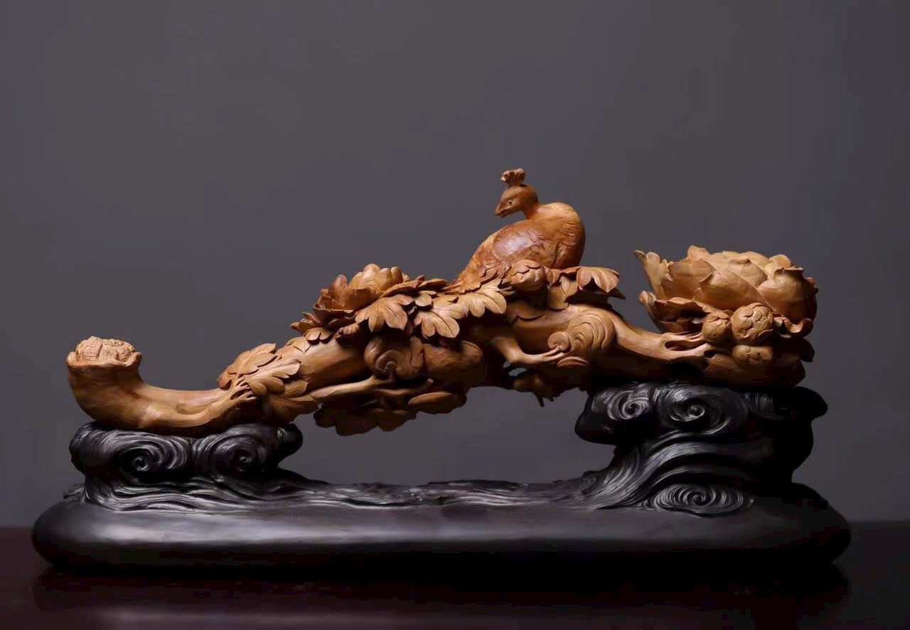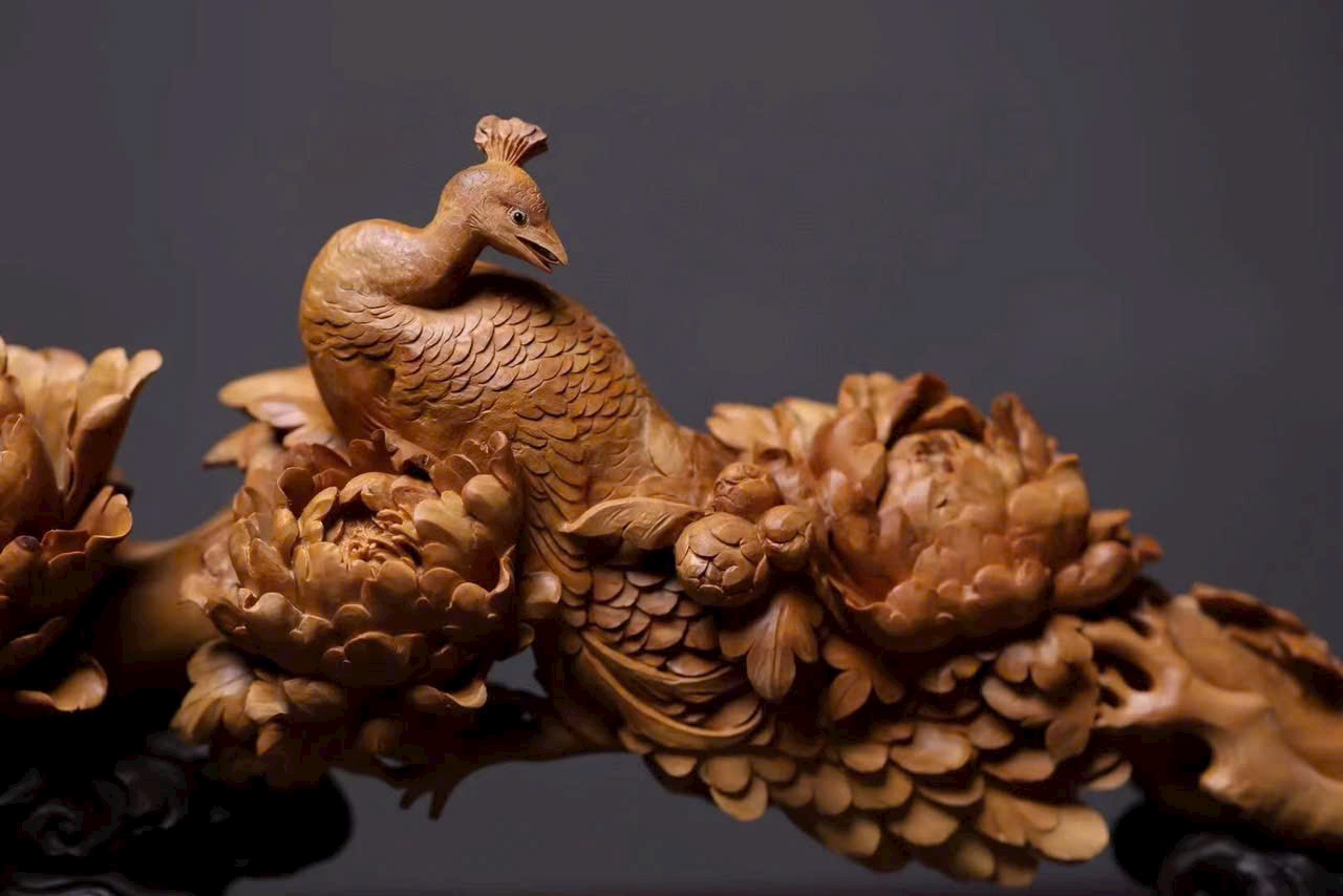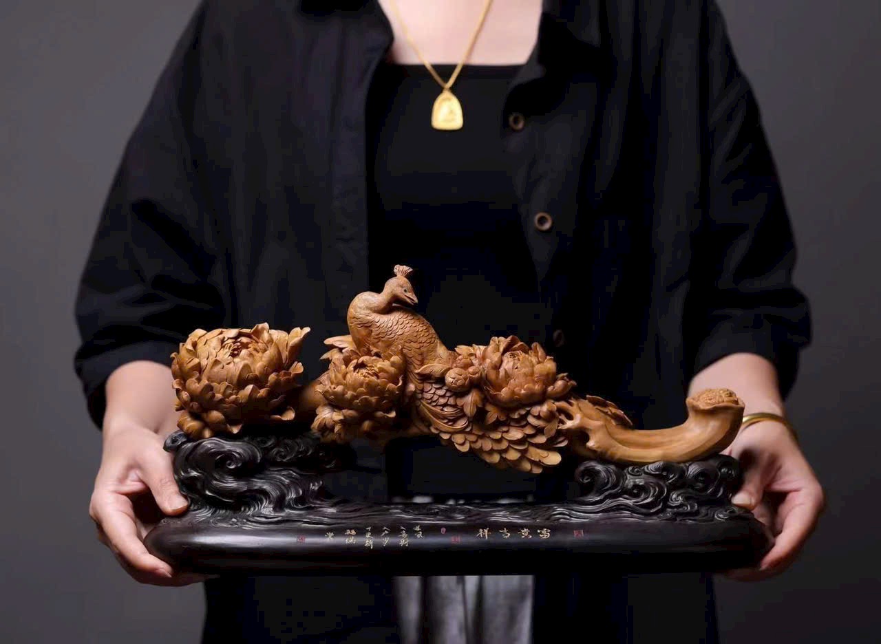 Công khắc tinh xảo: đôi công kiêu sa, lông vũ sắc nét, kết hợp cùng mẫu đơn nở rộ nhiều lớp, tượng trưng cho vẻ đẹp cao quý và phú quý viên mãn.