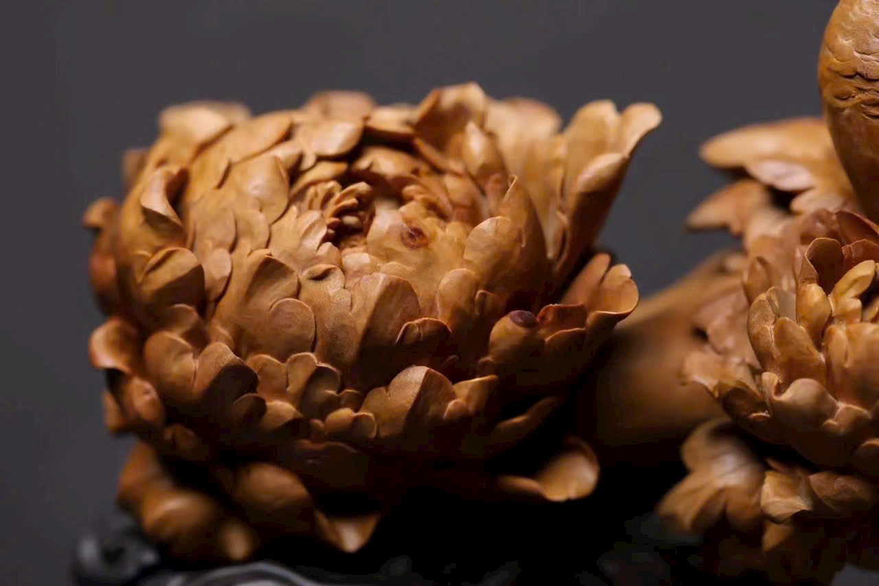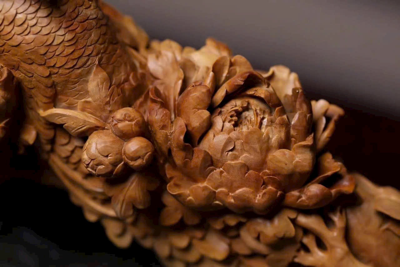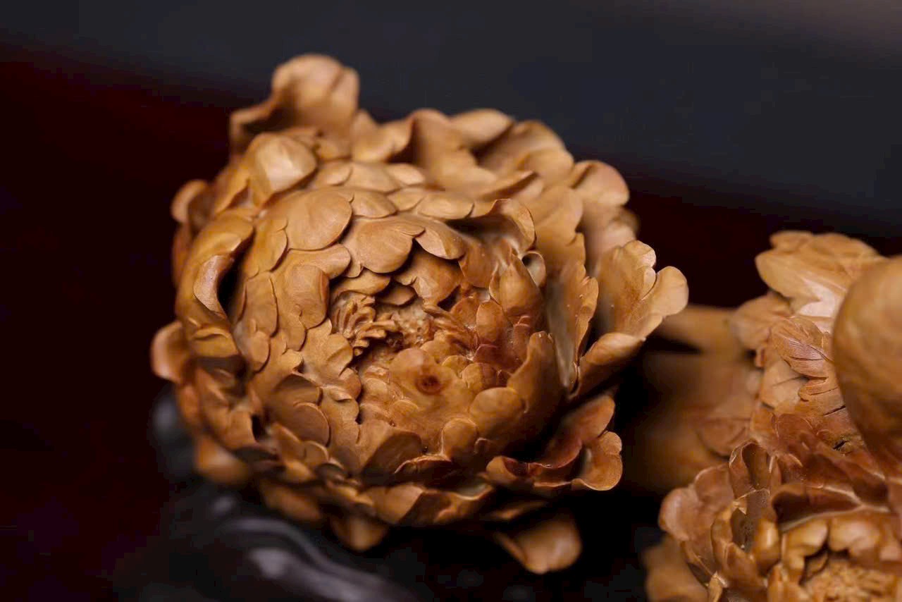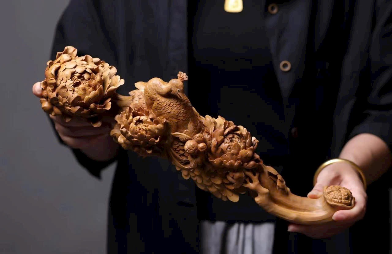 Công khắc tinh xảo: đôi công kiêu sa, lông vũ sắc nét, kết hợp cùng mẫu đơn nở rộ nhiều lớp, tượng trưng cho vẻ đẹp cao quý và phú quý viên mãn.