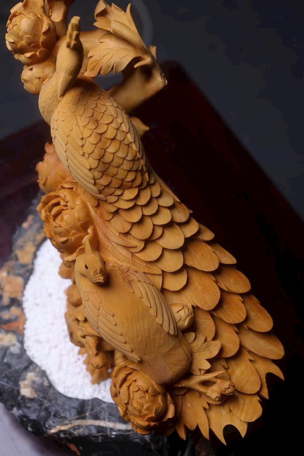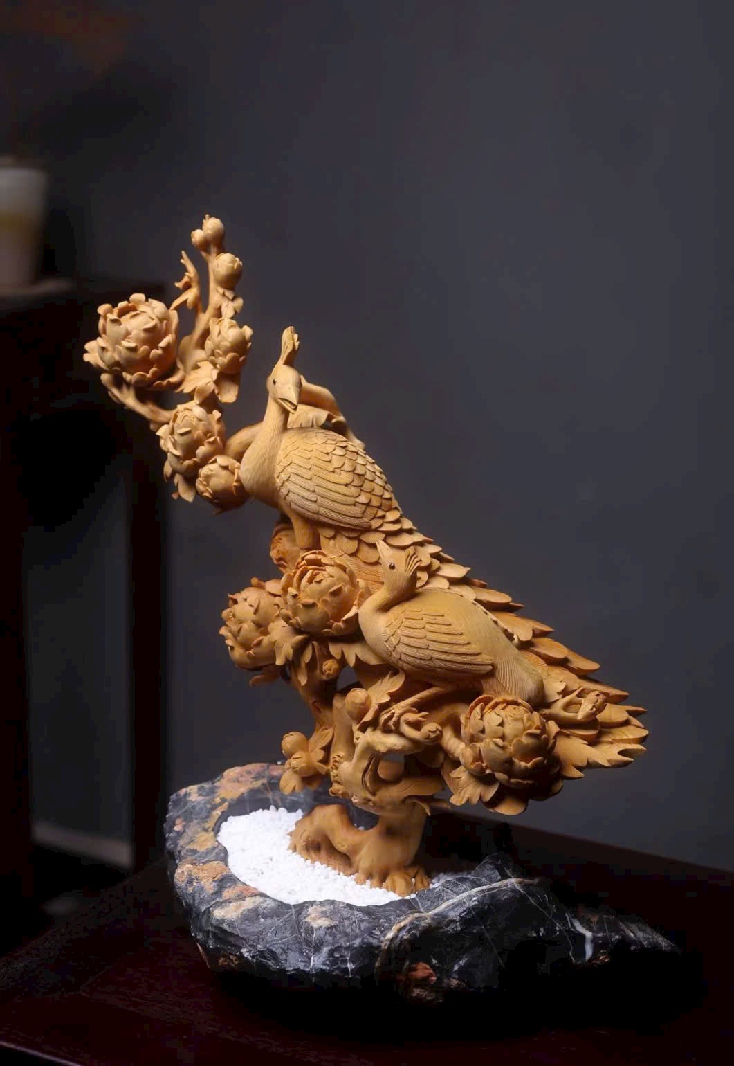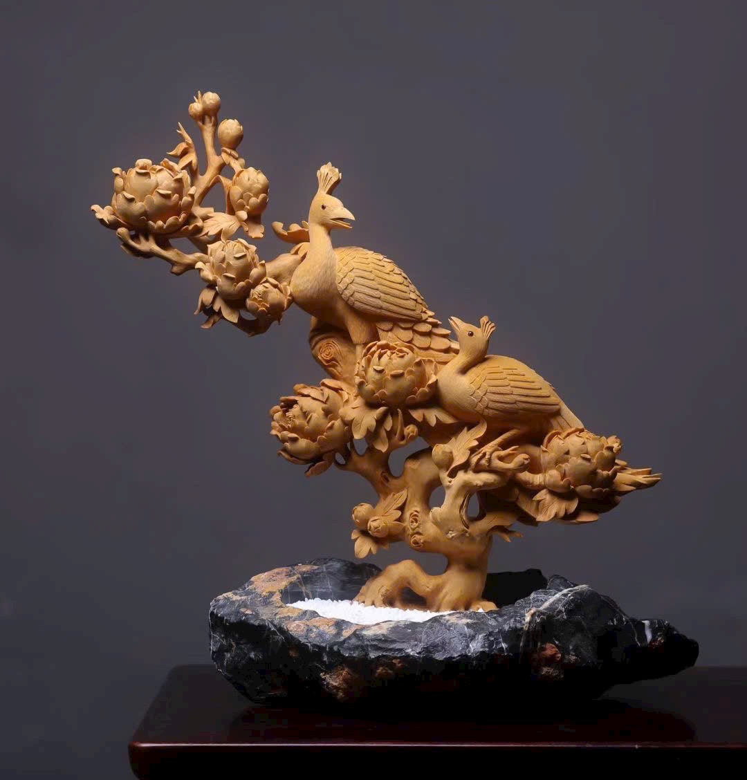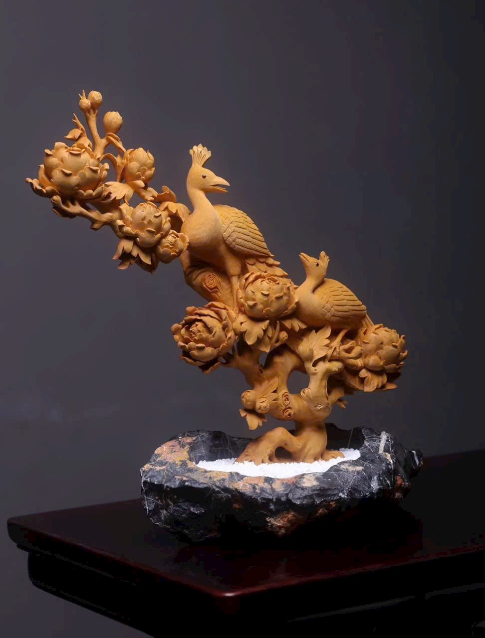 Vân lông công dày mịn, dáng vẻ tao nhã. Cánh mẫu đơn tầng tầng lớp lớp, đầy đặn nở rộ. Kết hợp cùng đế đá kỳ thú, dung hòa linh vận tự nhiên với vẻ đẹp thủ công, tạo nên bức cảnh phú quý trang nhã.