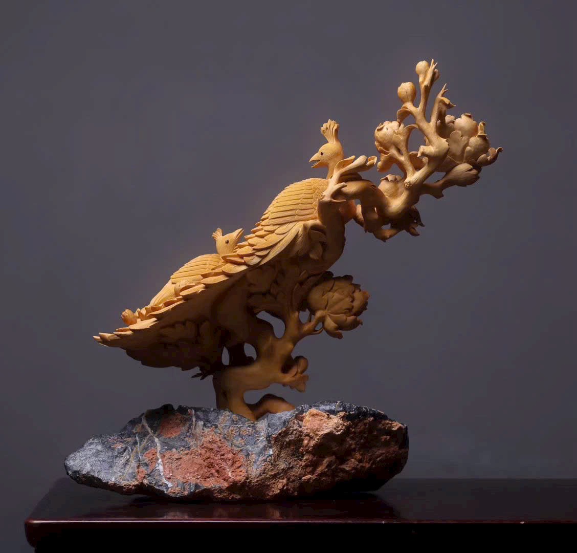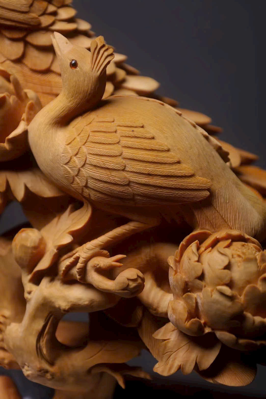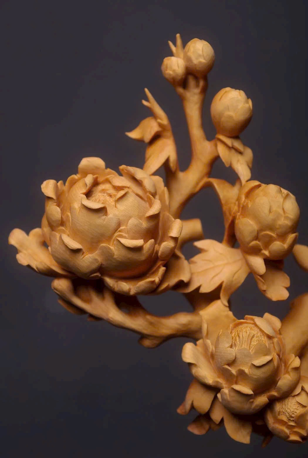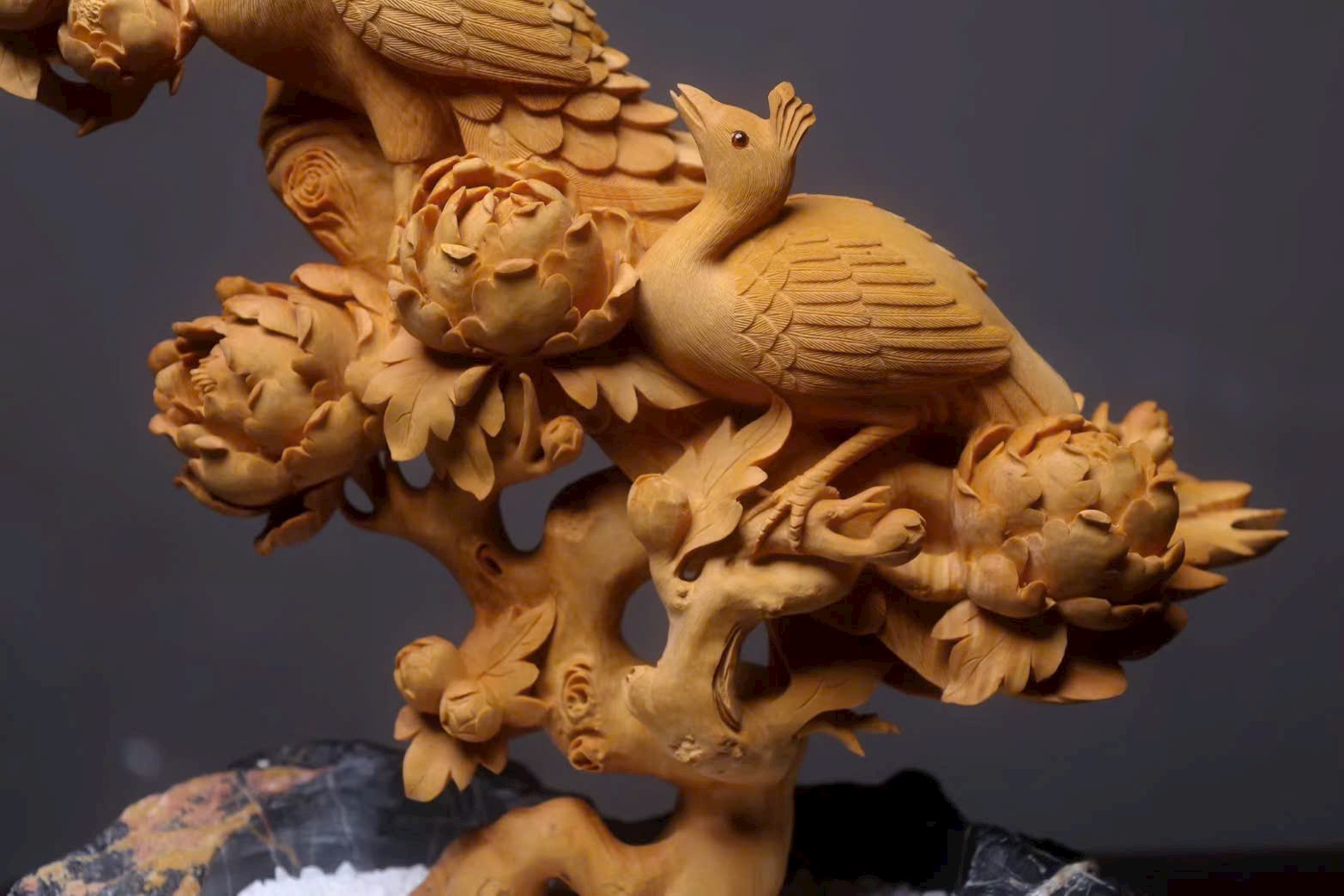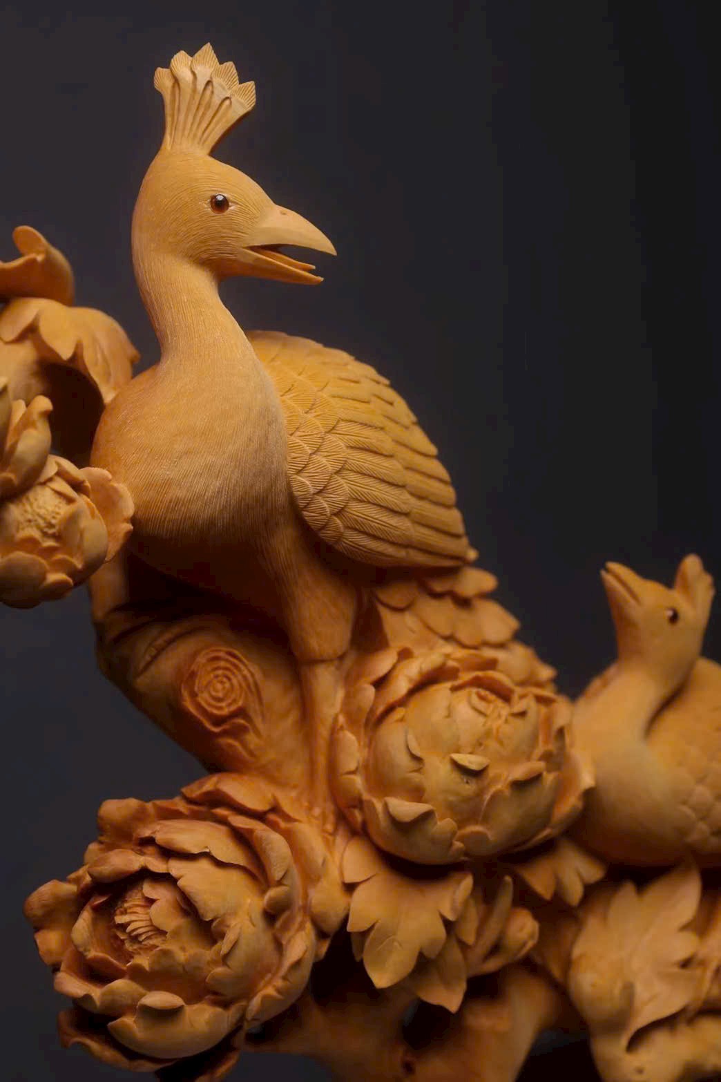 Vân lông công dày mịn, dáng vẻ tao nhã. Cánh mẫu đơn tầng tầng lớp lớp, đầy đặn nở rộ. Kết hợp cùng đế đá kỳ thú, dung hòa linh vận tự nhiên với vẻ đẹp thủ công, tạo nên bức cảnh phú quý trang nhã.
