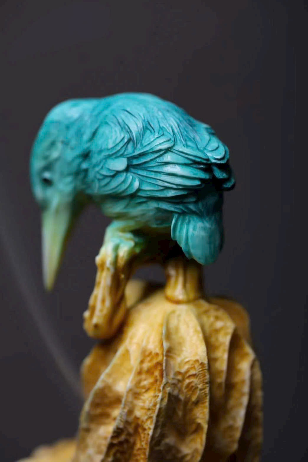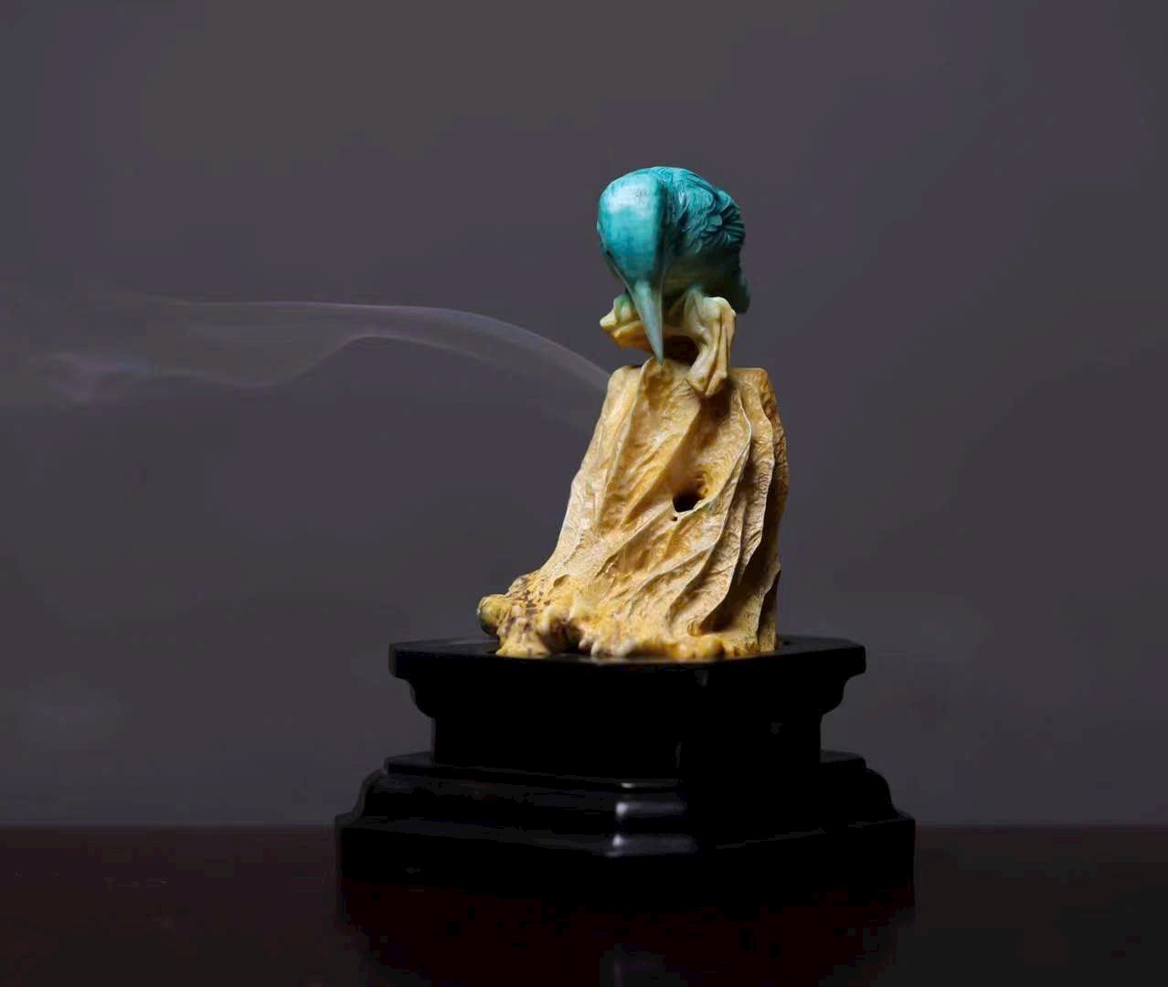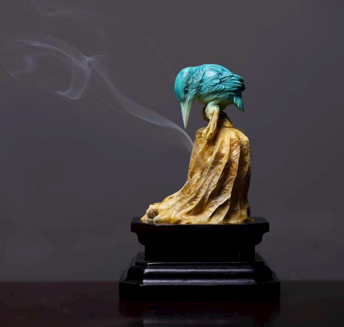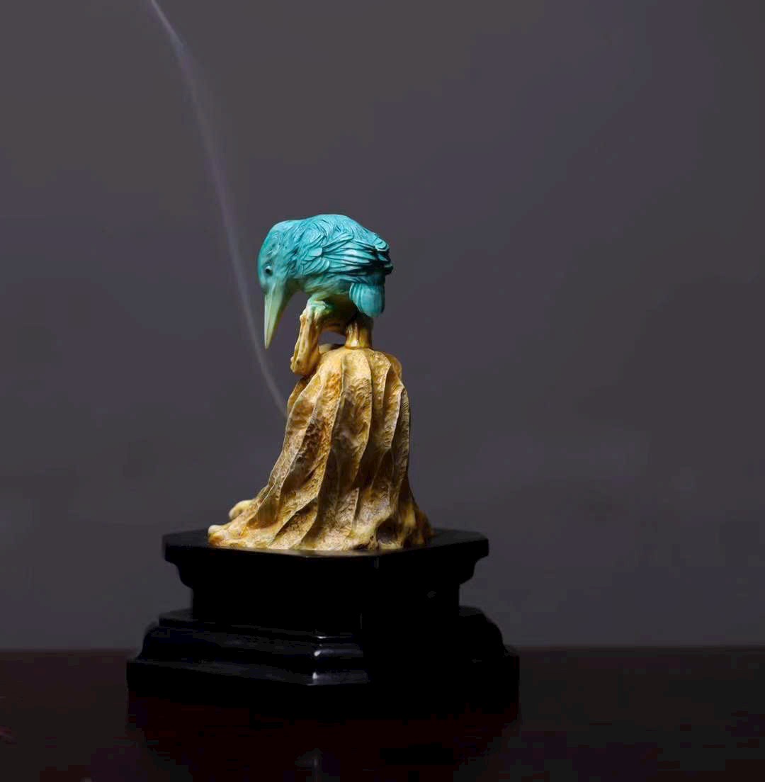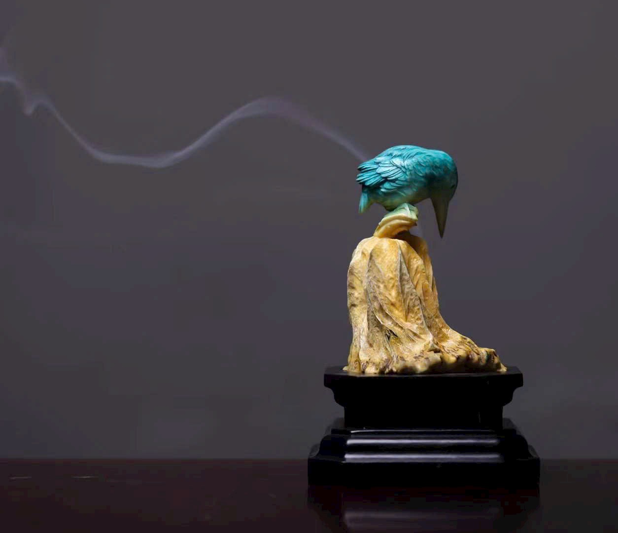 Chim thanh tước với bộ lông biếc xanh óng ánh, chiếc mỏ dài nhọn, cúi đầu hướng về lá sen khô – như khẽ mổ, lại như bị hương khói vấn vương. Lá sen khắc họa đường vân tựa sự phong hóa tự nhiên, khói hương lượn quanh, khiến tác phẩm điêu khắc tĩnh tại bỗng mang sinh khí linh động, tạo nên bầu không gian tĩnh lặng mà đầy thi vị.