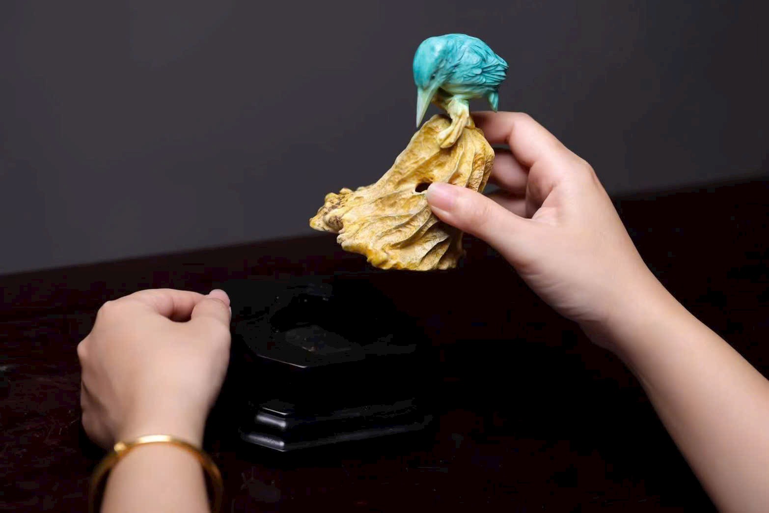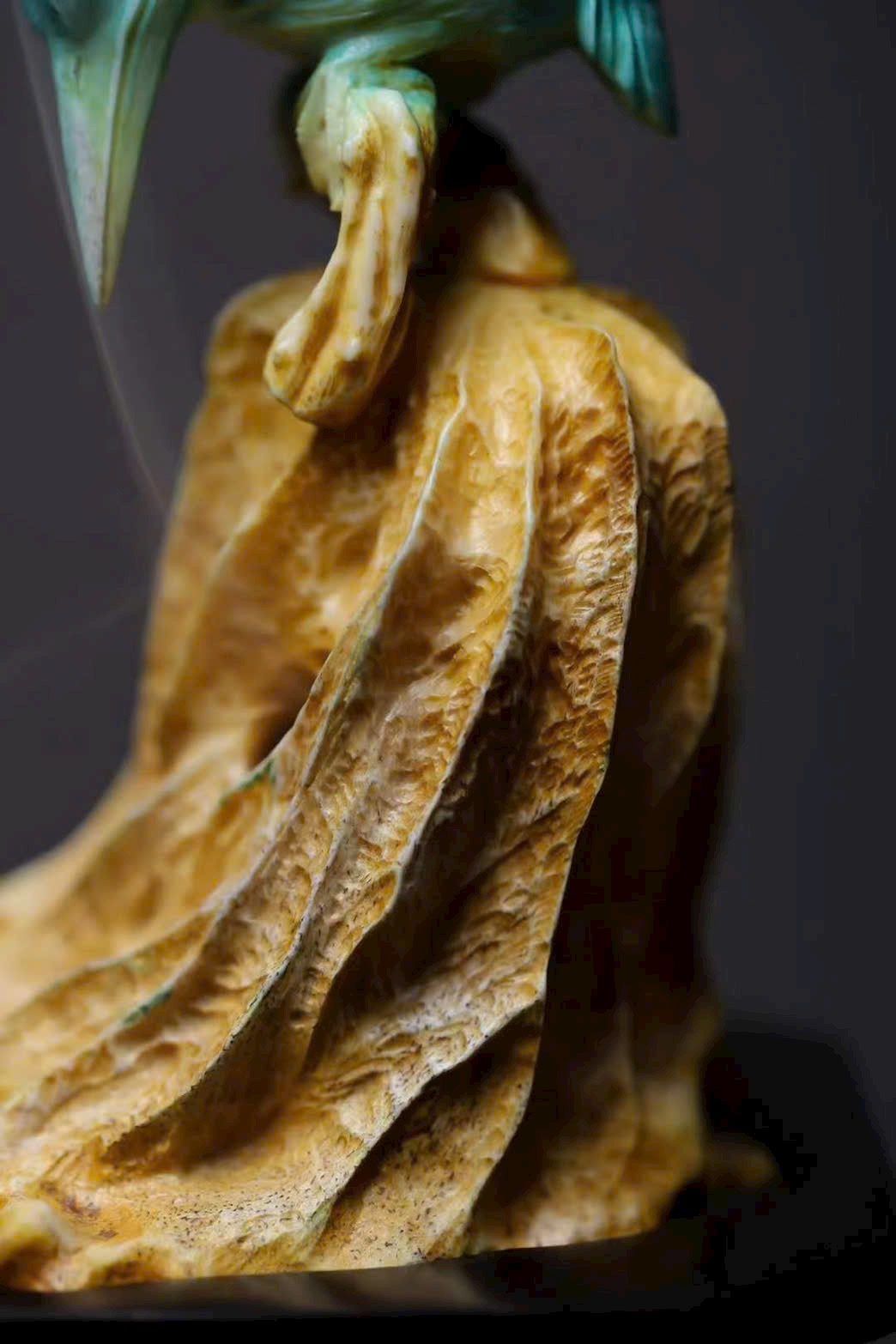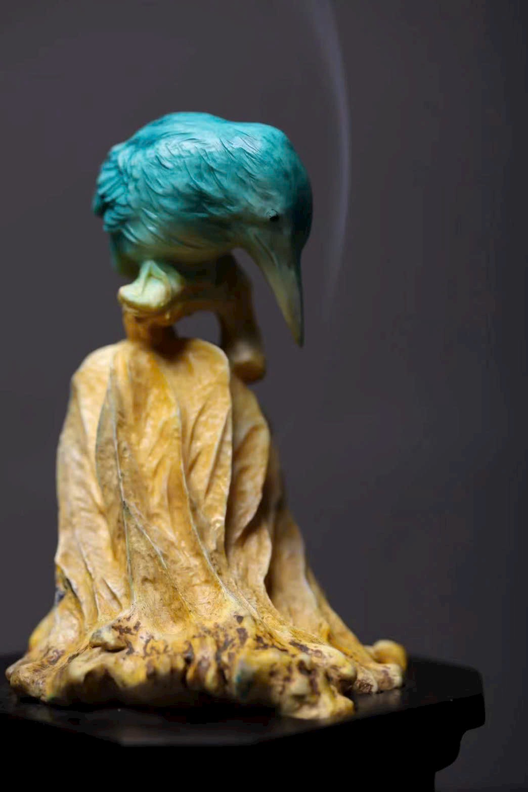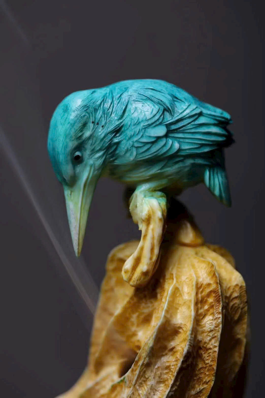 Chim thanh tước với bộ lông biếc xanh óng ánh, chiếc mỏ dài nhọn, cúi đầu hướng về lá sen khô – như khẽ mổ, lại như bị hương khói vấn vương. Lá sen khắc họa đường vân tựa sự phong hóa tự nhiên, khói hương lượn quanh, khiến tác phẩm điêu khắc tĩnh tại bỗng mang sinh khí linh động, tạo nên bầu không gian tĩnh lặng mà đầy thi vị.