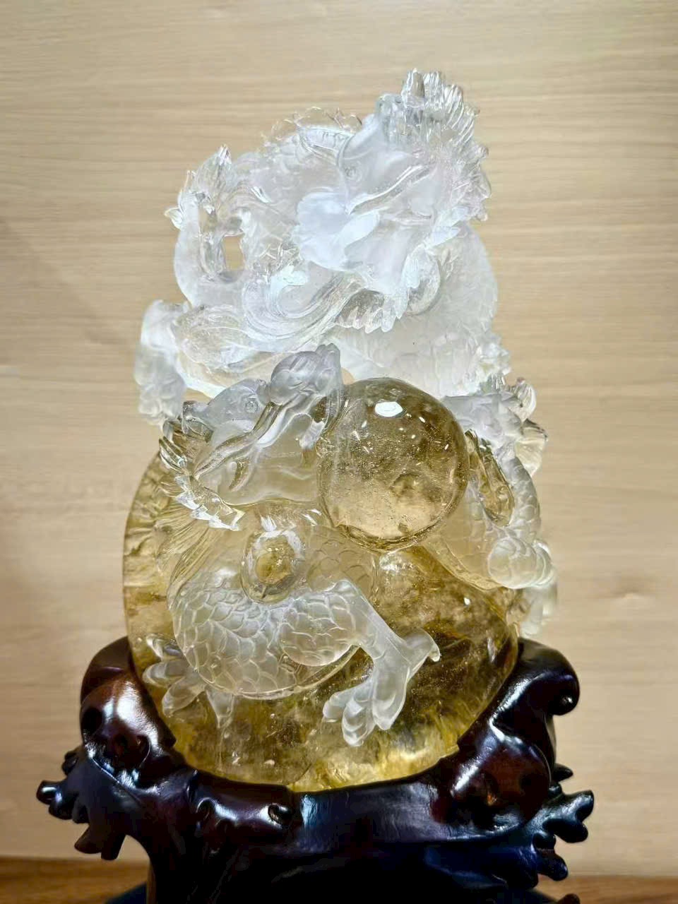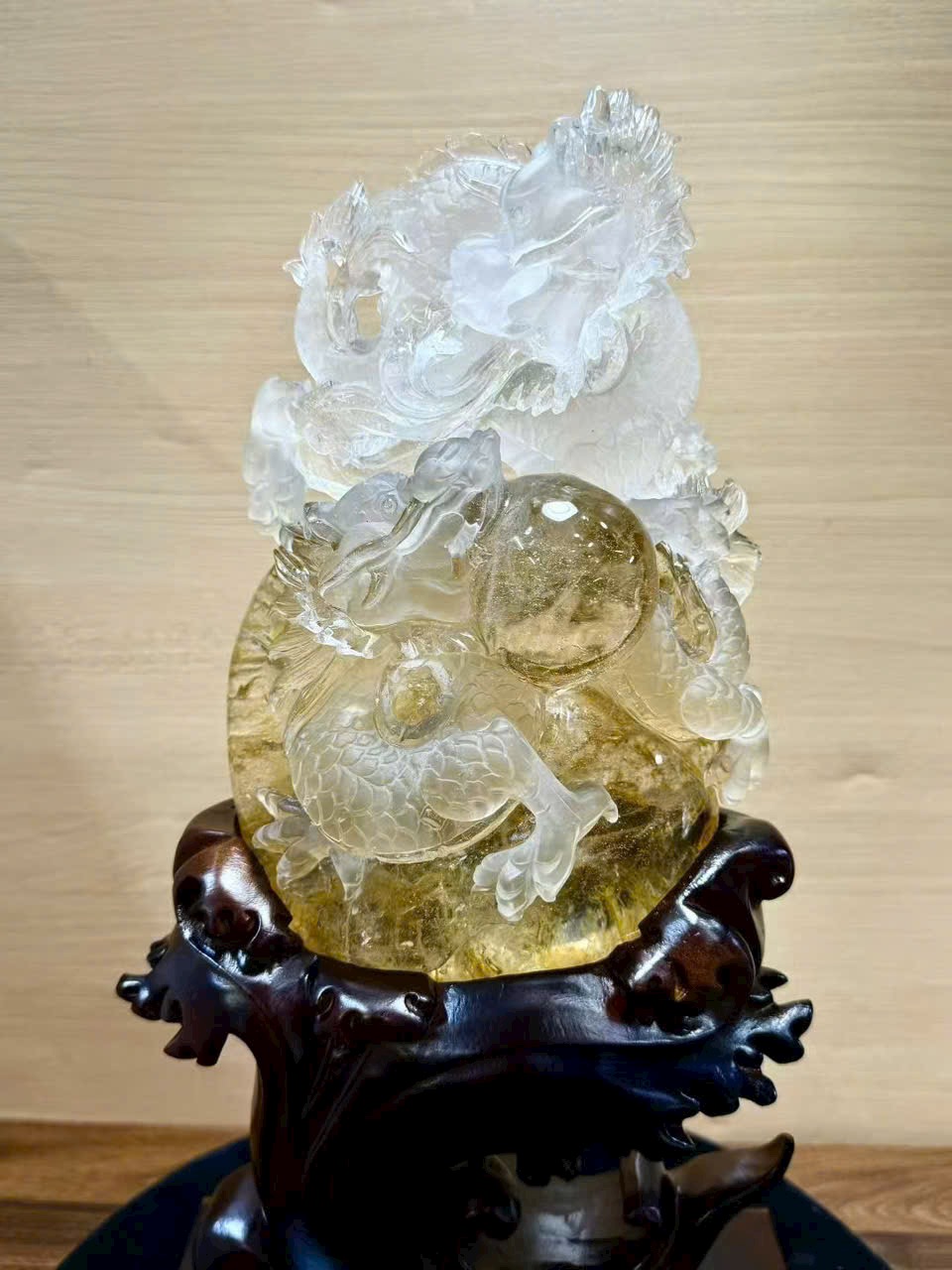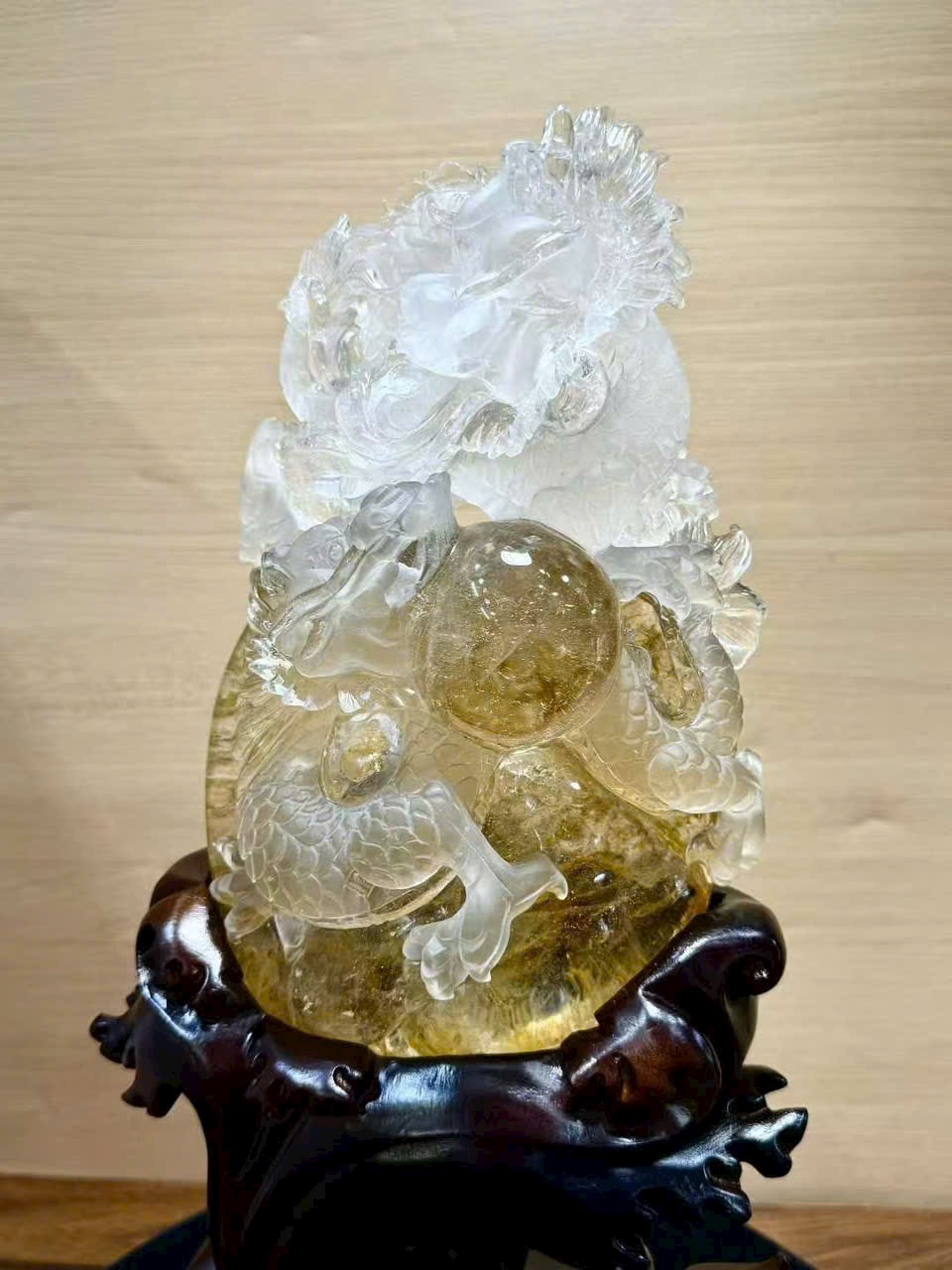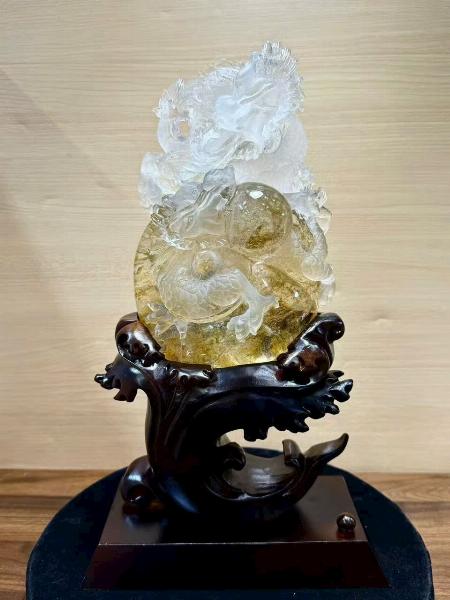 Tượng phong thủy Song Long hí châu – thạch anh trắng hoa vàng tự nhiên ✨
