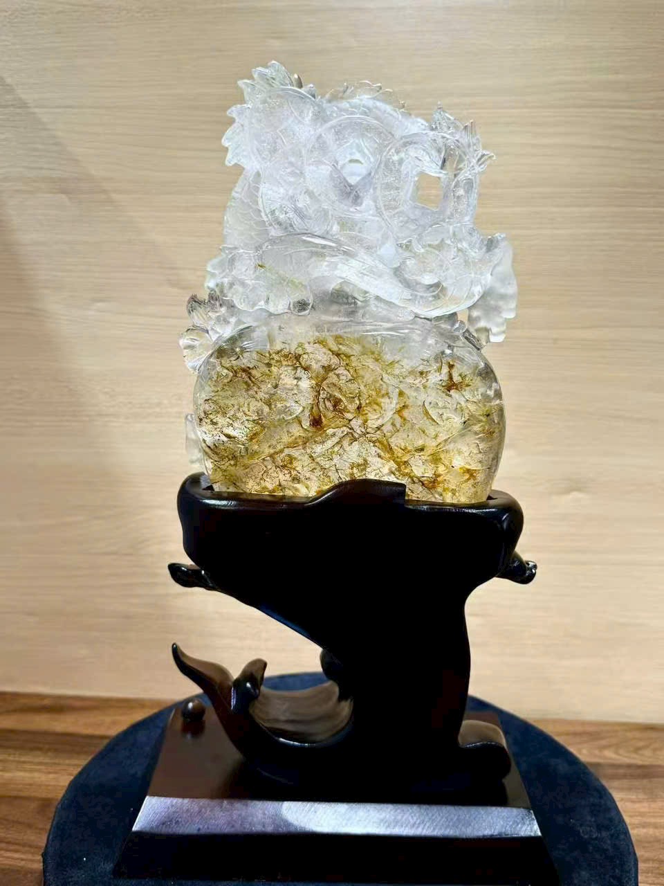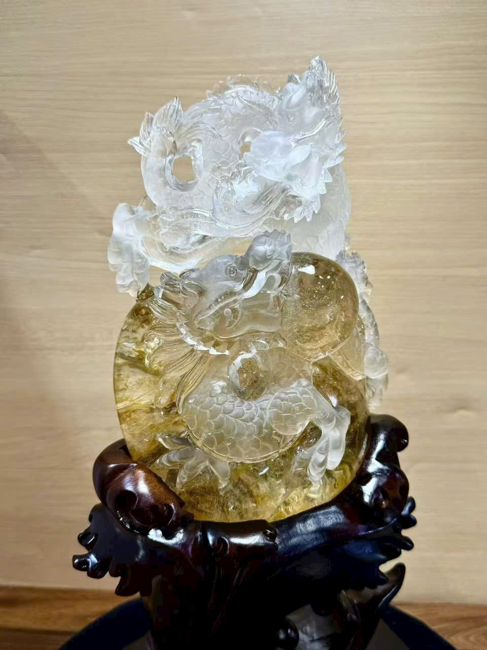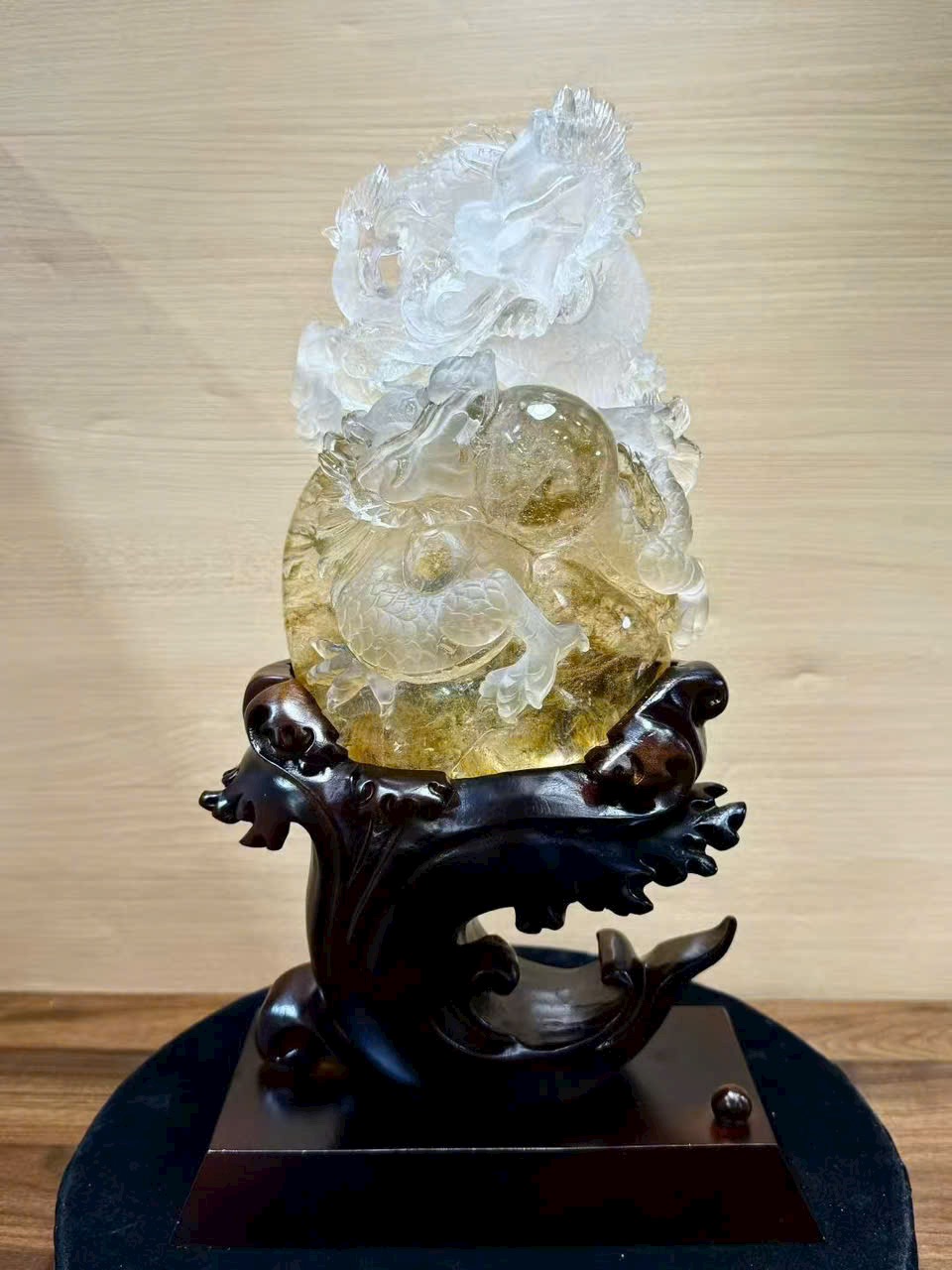 Tượng phong thủy Song Long hí châu – thạch anh trắng hoa vàng tự nhiên ✨