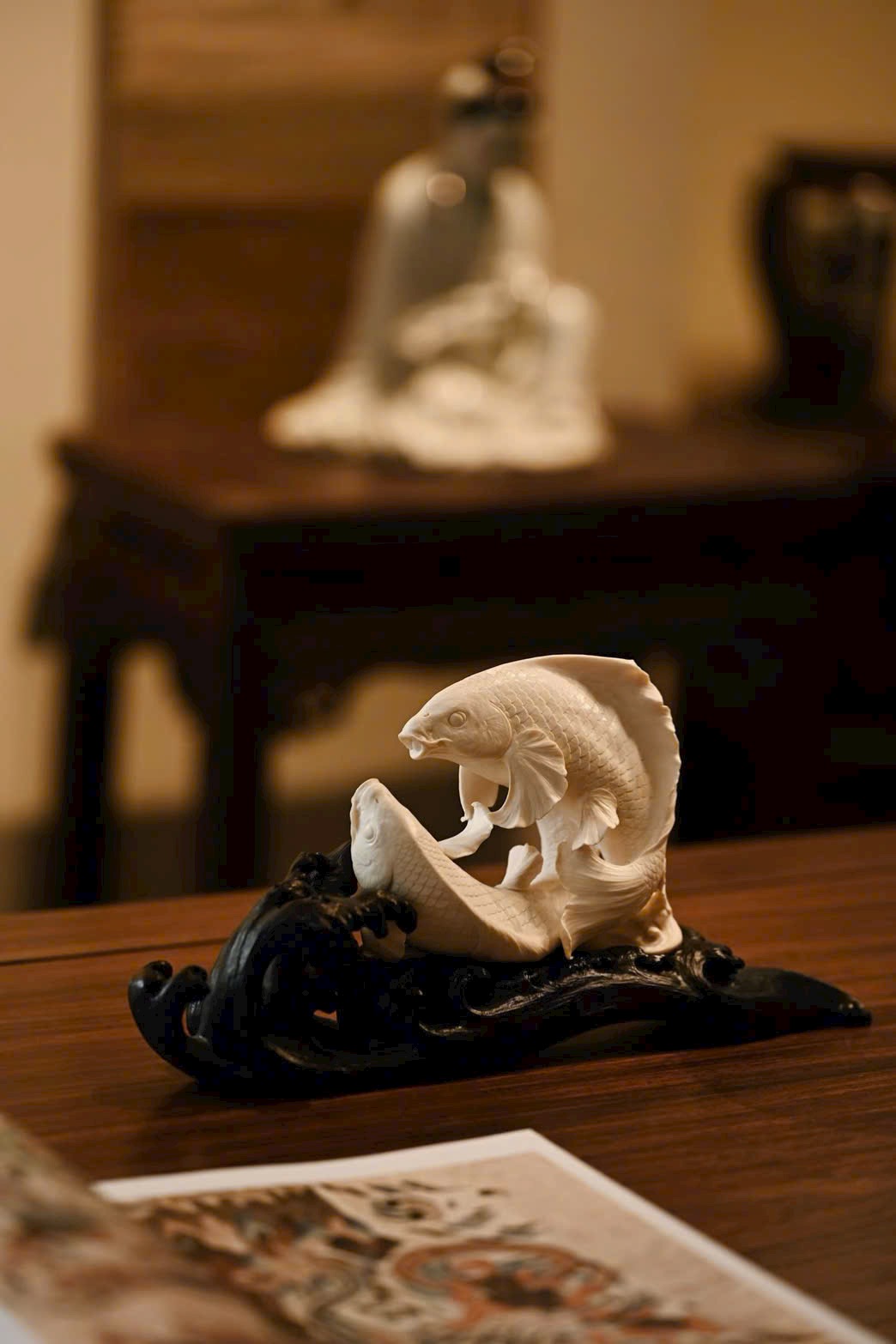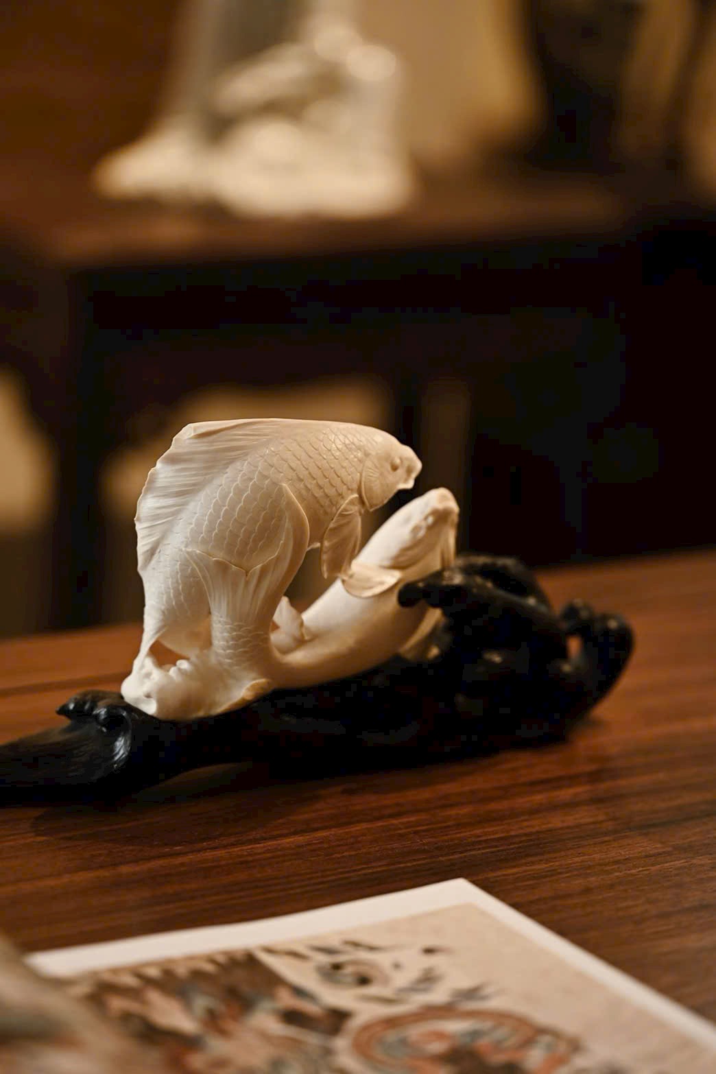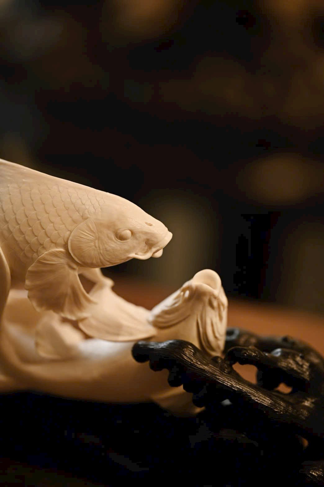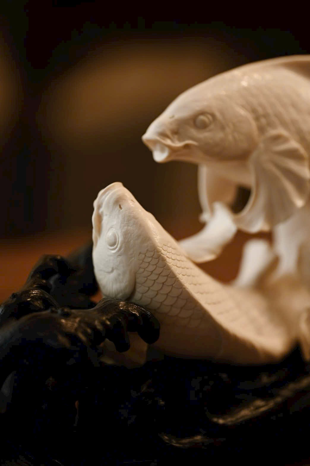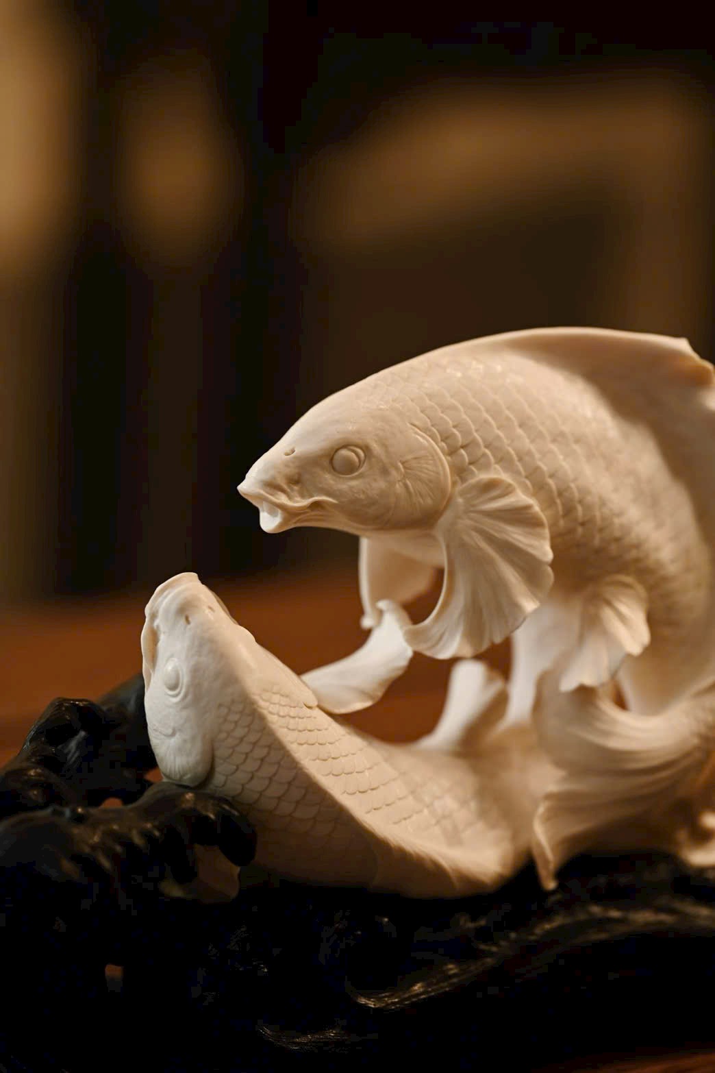 Tác phẩm được chạm khắc từ khối n.gà nguyên vẹn, đôi cá uốn lượn linh hoạt, tung tăng bơi lội, đầu đuôi nối liền, hàm ý phú quý liên miên.