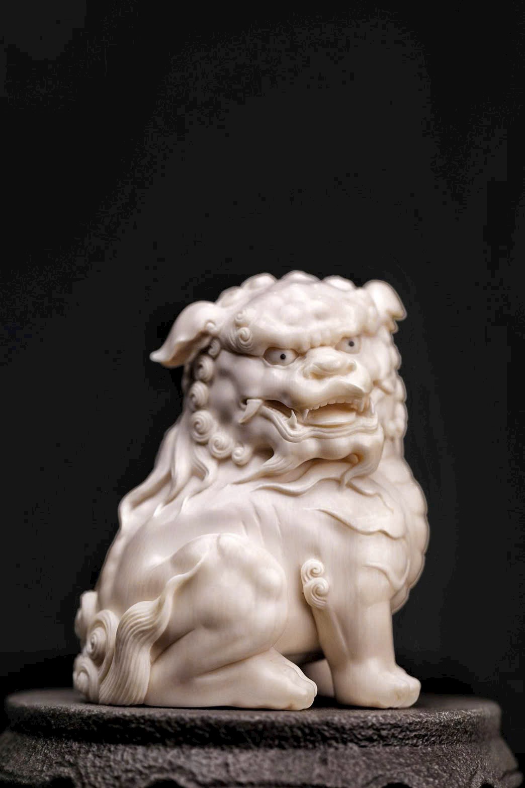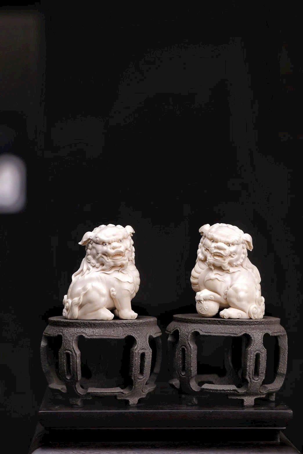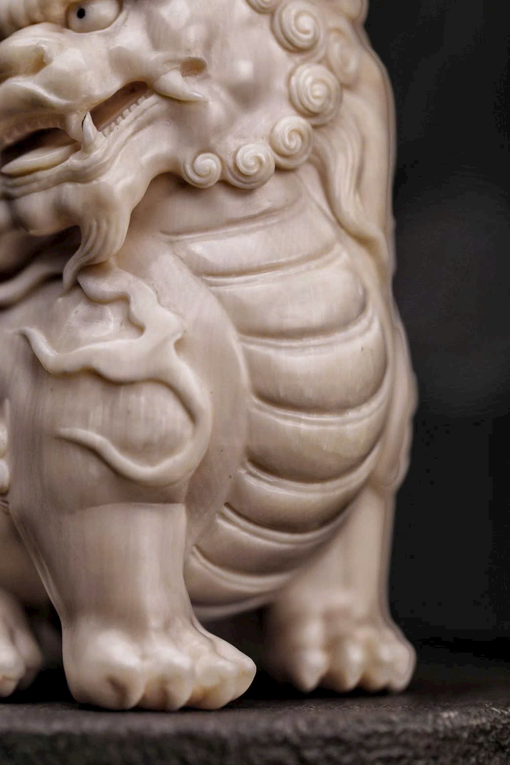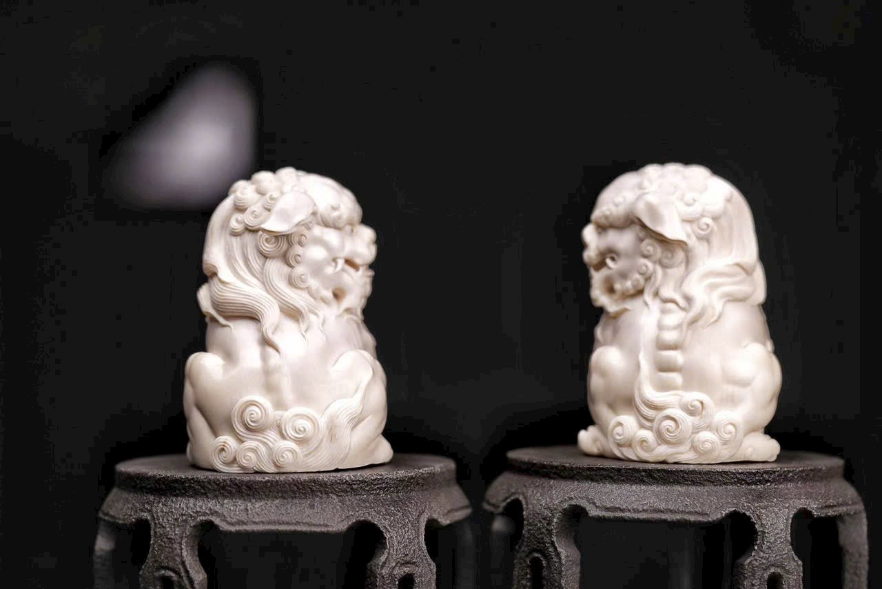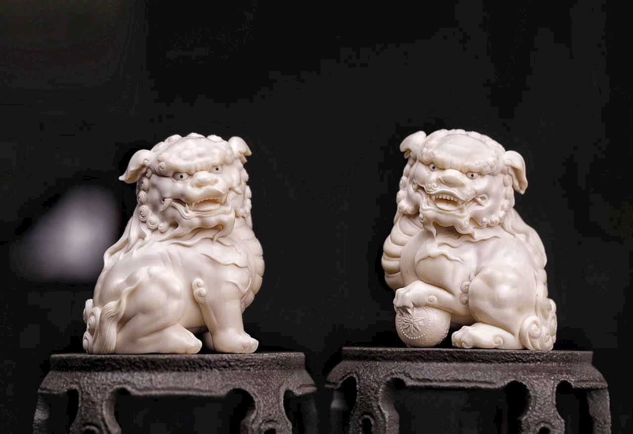 Chất mamut ấm mượt, thớ ngà tinh tế, đường khắc tỉ mỉ thể hiện rõ thần thái uy nghi của sư tử. Đôi sư tử ngồi chầu trên bệ đá xanh cổ, một con đạp cầu, một con giữ thế, tĩnh tại mà toát lên linh khí cát tường, biểu trưng cho sự hội tụ của tài lộc và phú quý.