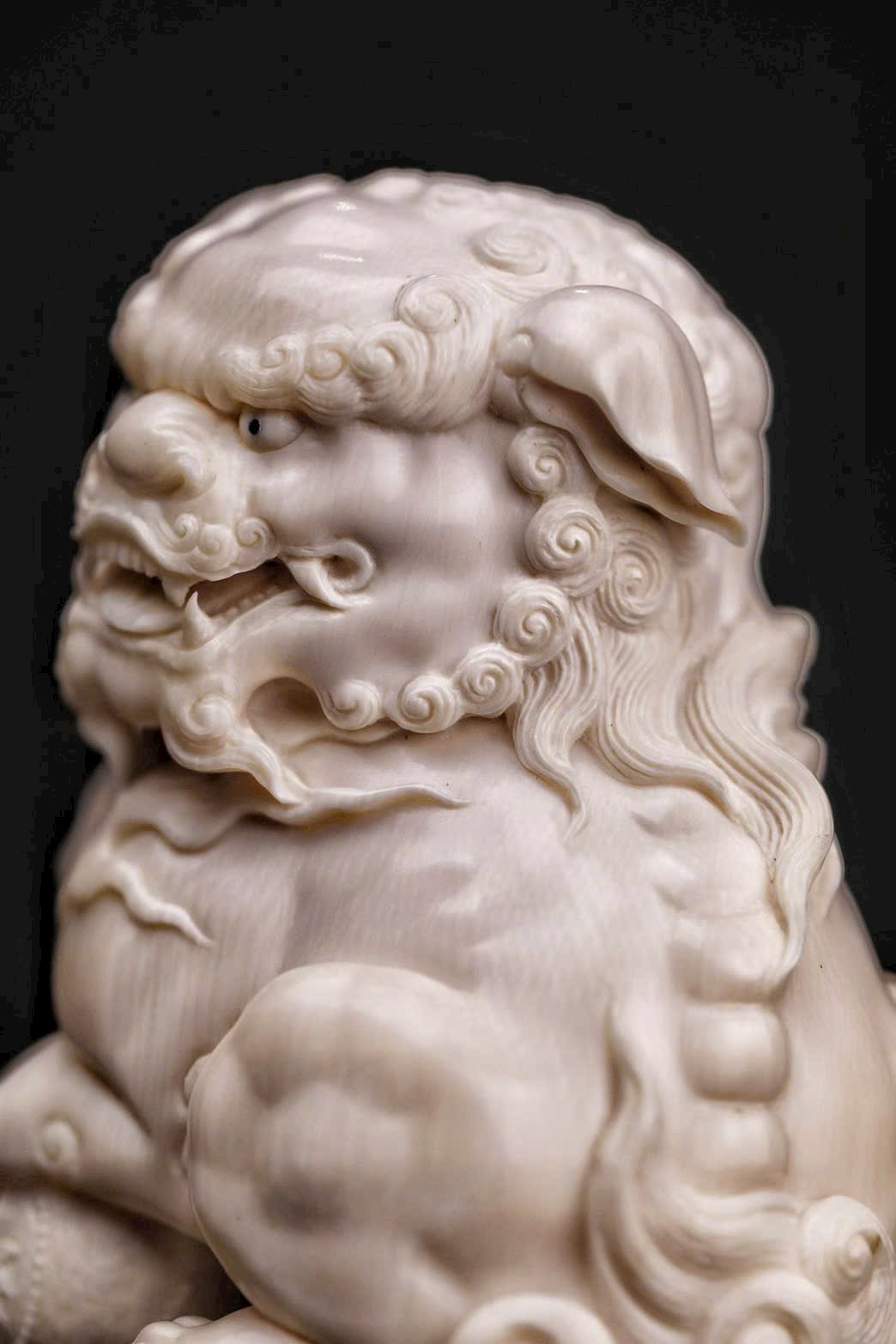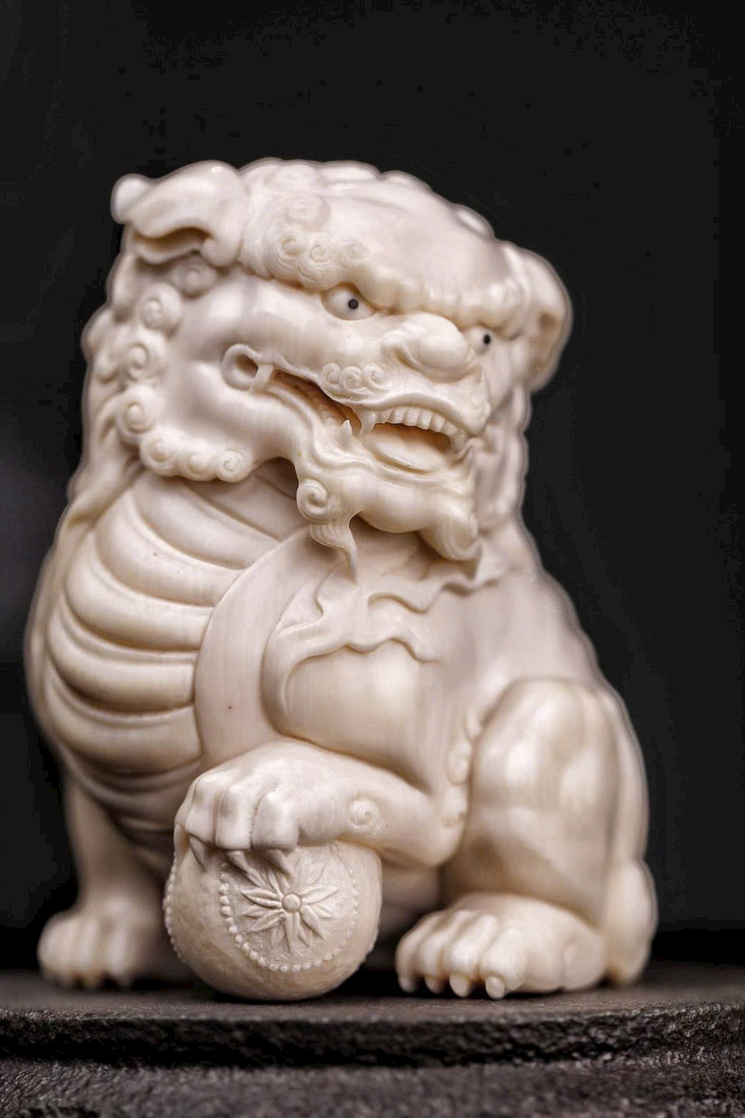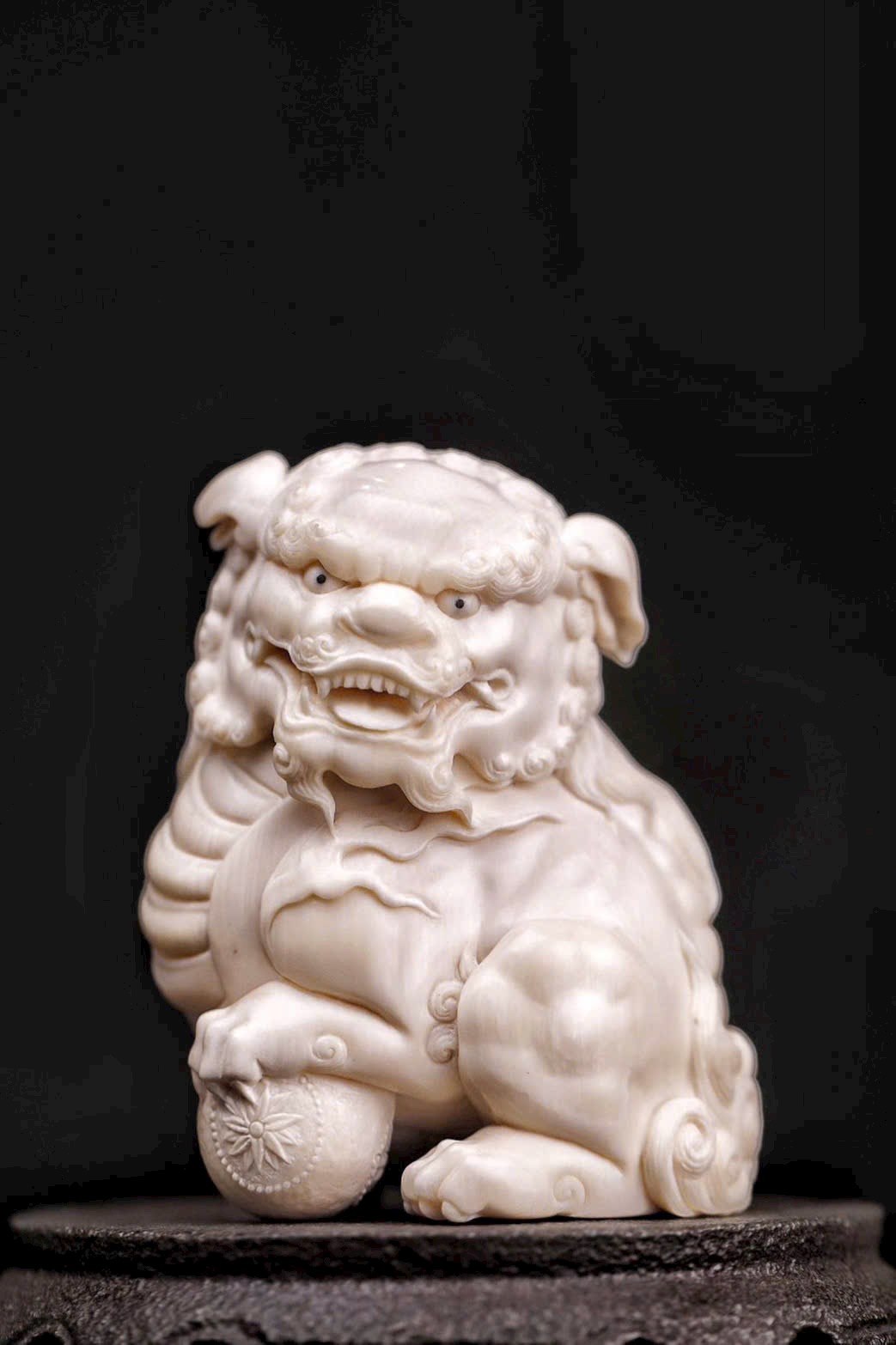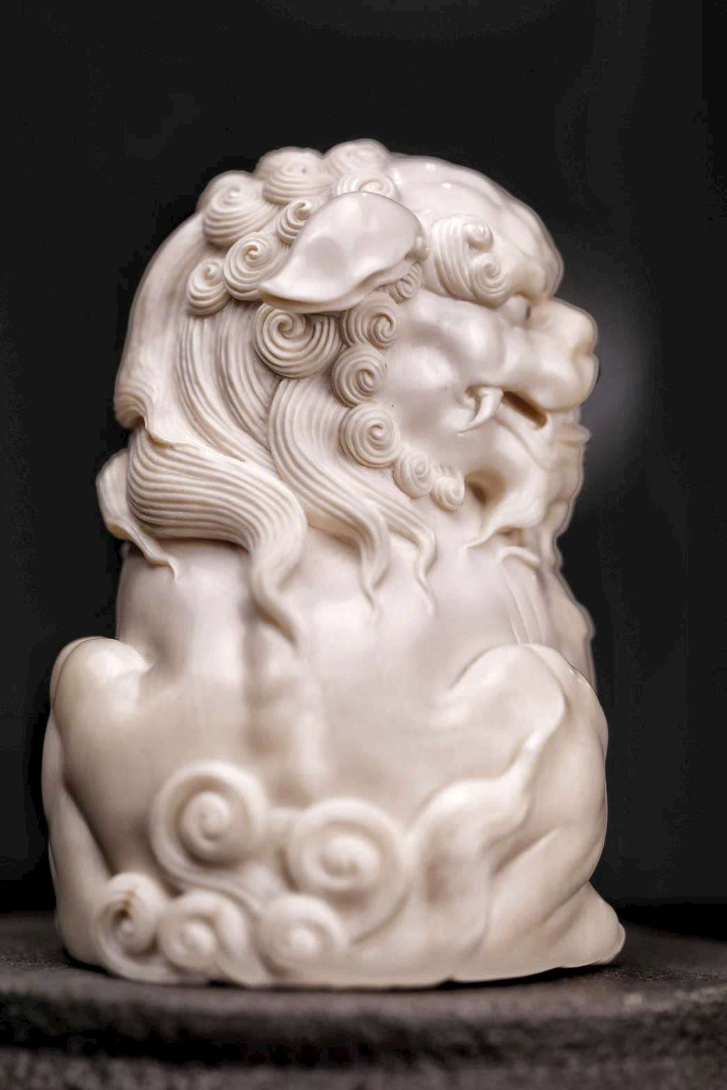 Chất mamut ấm mượt, thớ ngà tinh tế, đường khắc tỉ mỉ thể hiện rõ thần thái uy nghi của sư tử. Đôi sư tử ngồi chầu trên bệ đá xanh cổ, một con đạp cầu, một con giữ thế, tĩnh tại mà toát lên linh khí cát tường, biểu trưng cho sự hội tụ của tài lộc và phú quý.