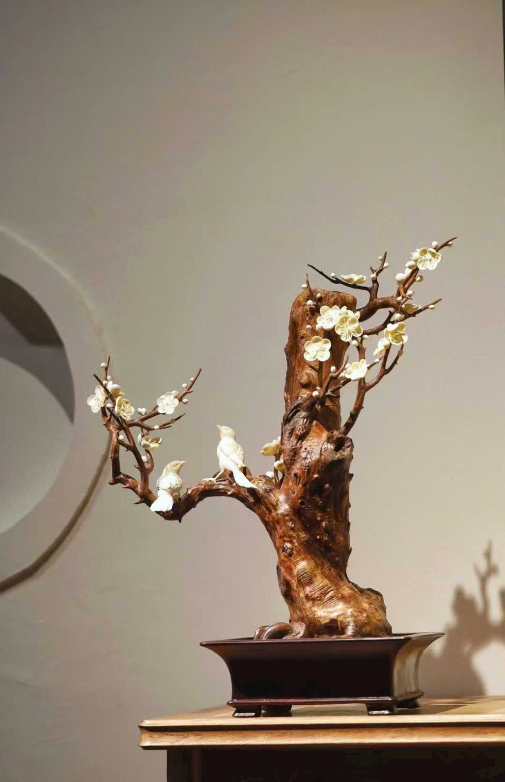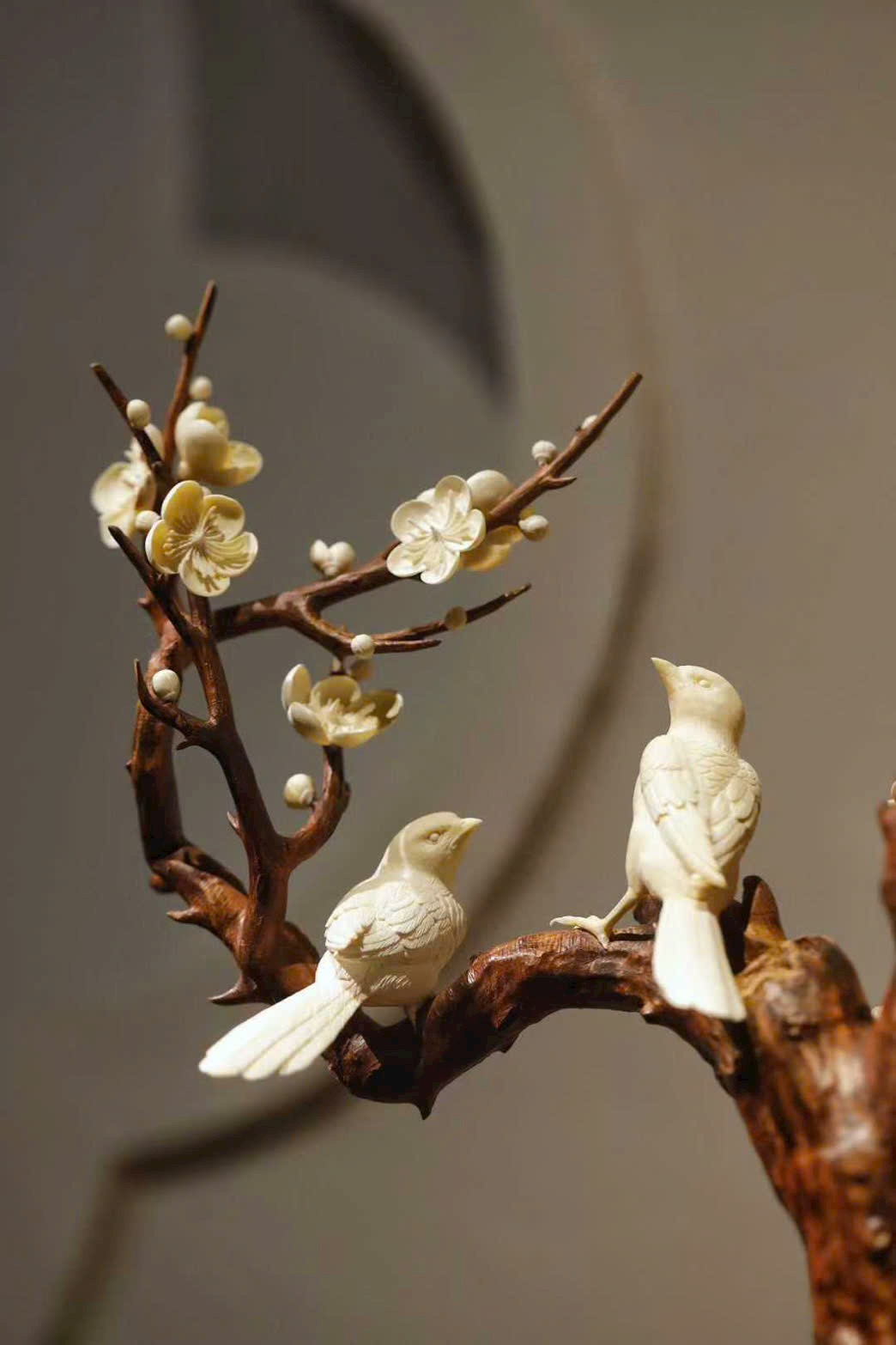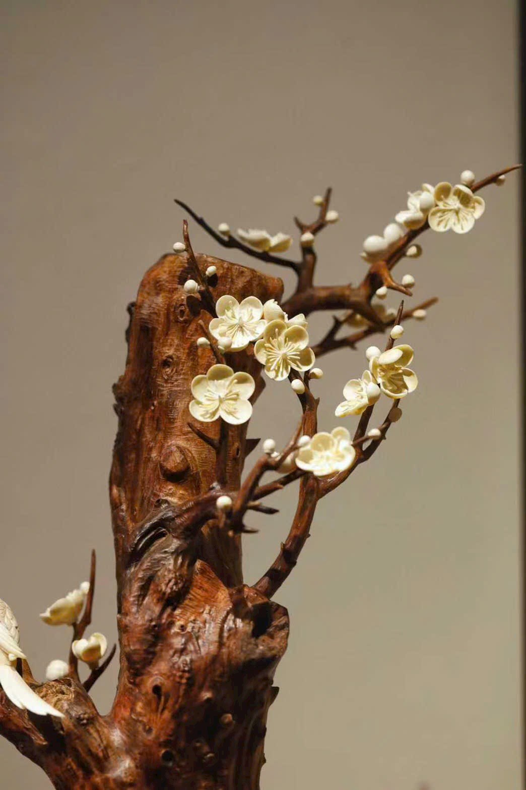 Lấy gỗ Sưa làm cốt, mô phỏng dáng cành mai cổ uốn lượn mạnh mẽ. Ng.à ma mút được chạm khắc tinh xảo thành hoa mai trắng bung nụ, bóng mịn như tuyết. Hai chim hỷ thước đậu trên cành, lông vũ hiện rõ, thần thái linh động như thật. Đặt trên án thư, ngắm như nghe tiếng chim báo hỷ, tràn đầy cát tường may mắn.