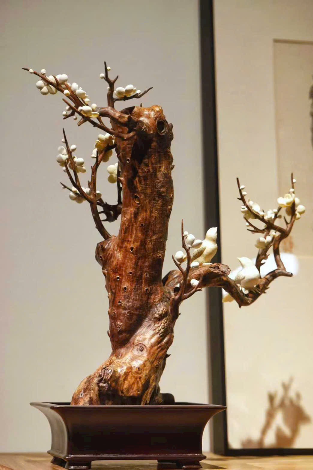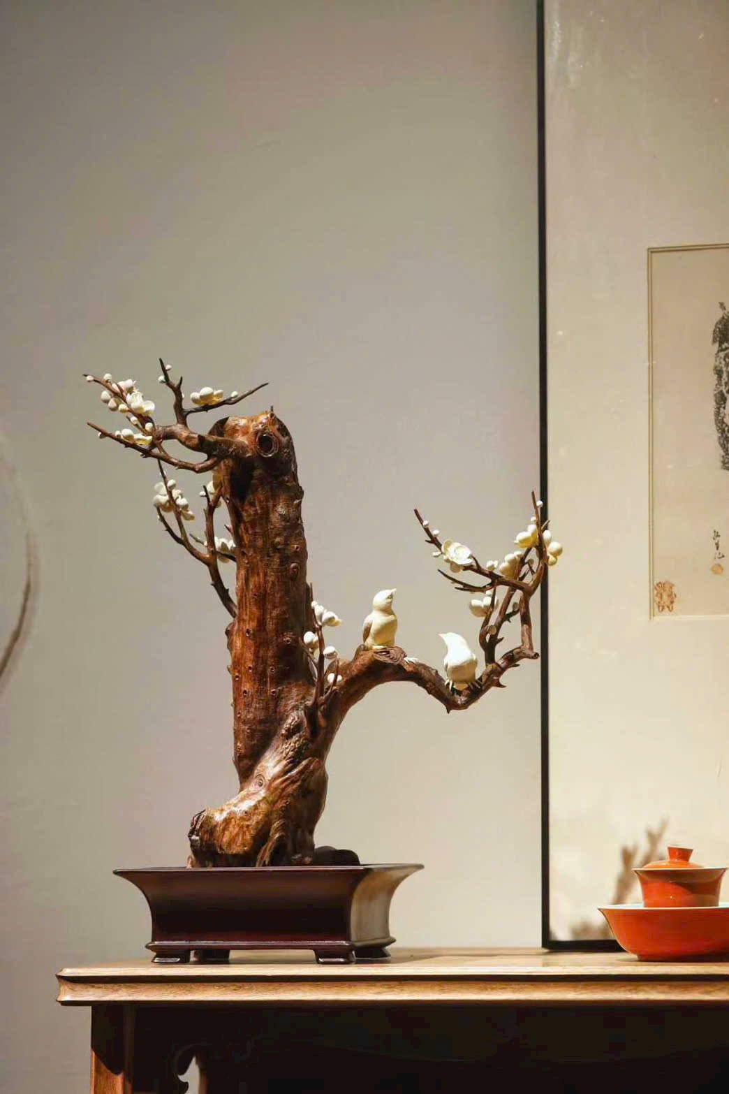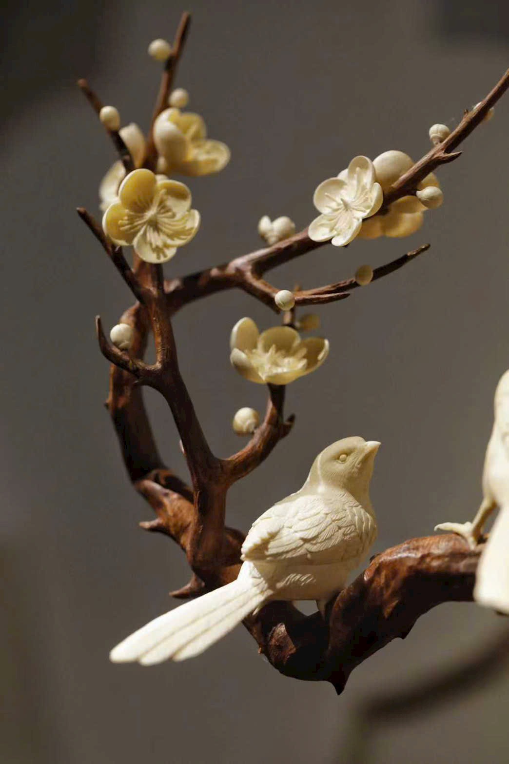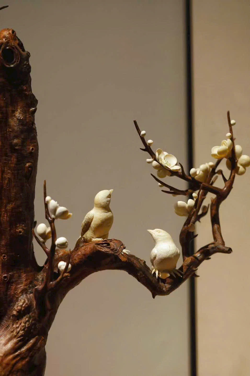 Lấy gỗ Sưa làm cốt, mô phỏng dáng cành mai cổ uốn lượn mạnh mẽ. Ng.à ma mút được chạm khắc tinh xảo thành hoa mai trắng bung nụ, bóng mịn như tuyết. Hai chim hỷ thước đậu trên cành, lông vũ hiện rõ, thần thái linh động như thật. Đặt trên án thư, ngắm như nghe tiếng chim báo hỷ, tràn đầy cát tường may mắn.