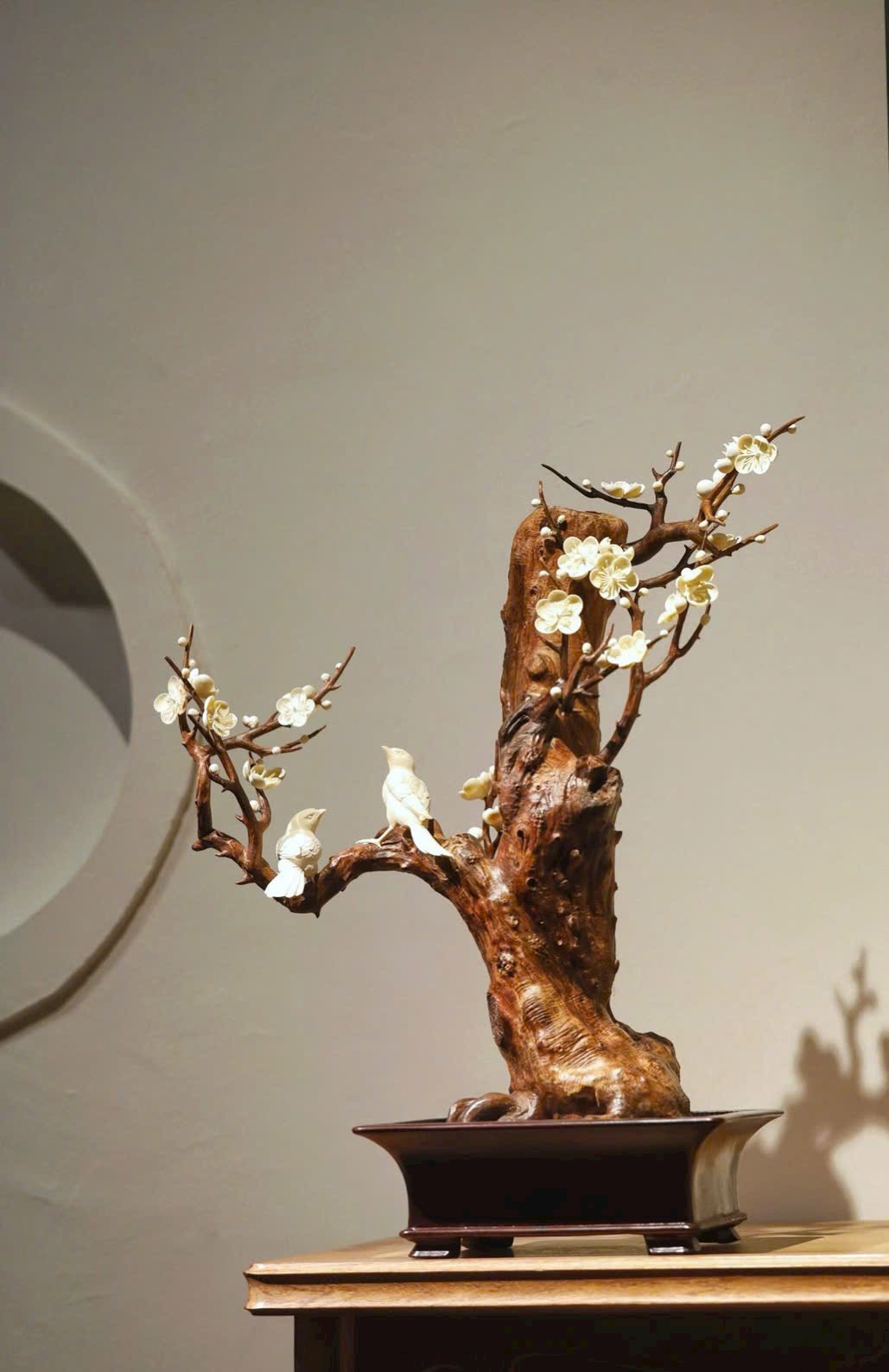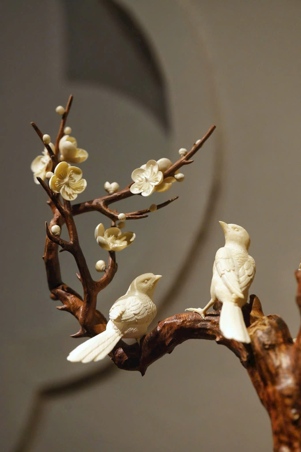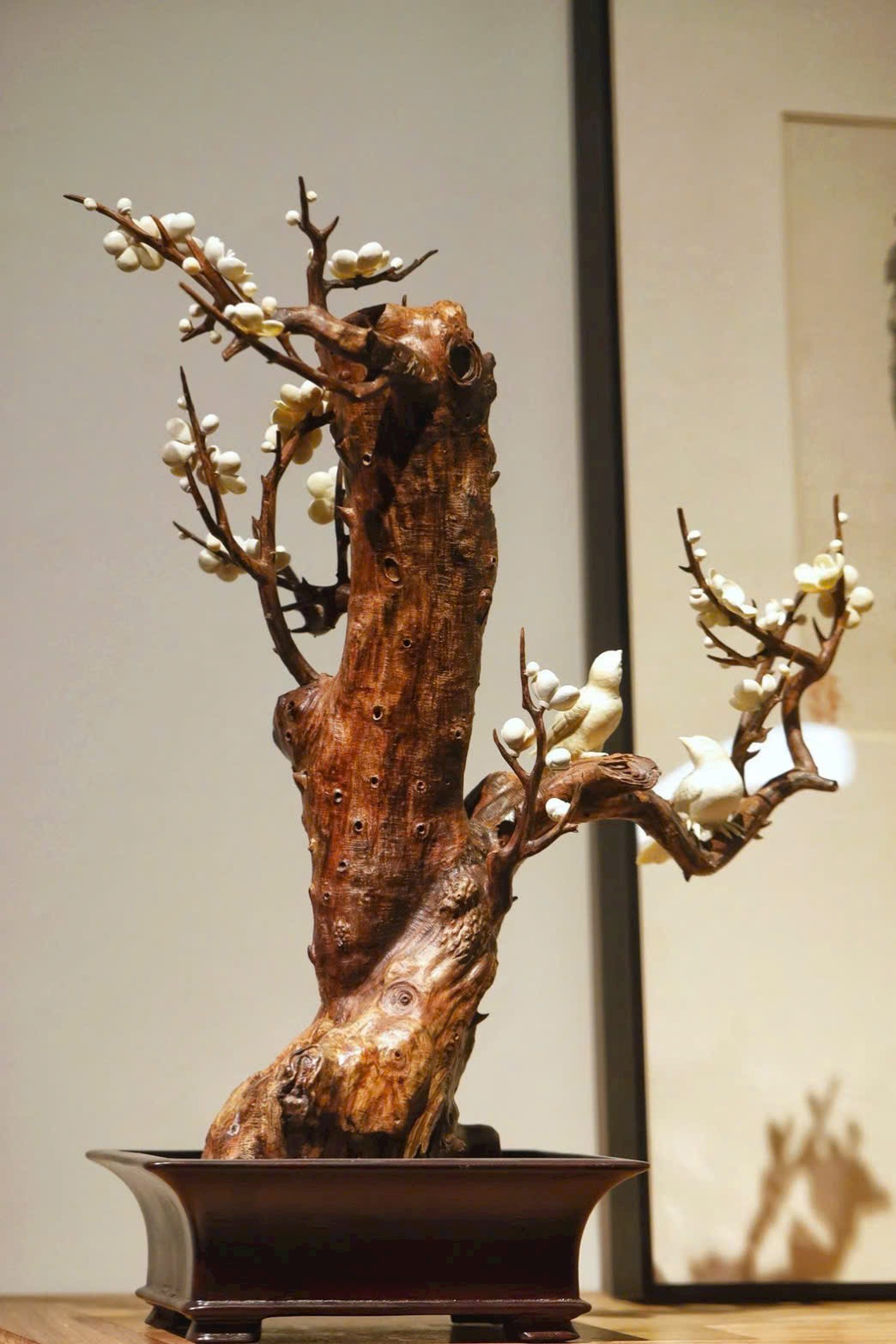 Lấy gỗ Sưa Hải Nam làm cốt, tái hiện dáng cành mai cổ uốn lượn, kết hợp ngà voi ma mút chạm khắc tinh xảo tạo nên những đóa bạch mai nở rộ, trong trẻo như tuyết. Hai chim hỷ thước đậu trên cành, lông vũ hiện rõ, thần thái sinh động như thật. Đặt trên án bàn, tựa như nghe tiếng chim báo hỷ, tràn đầy cát tường và may mắn.