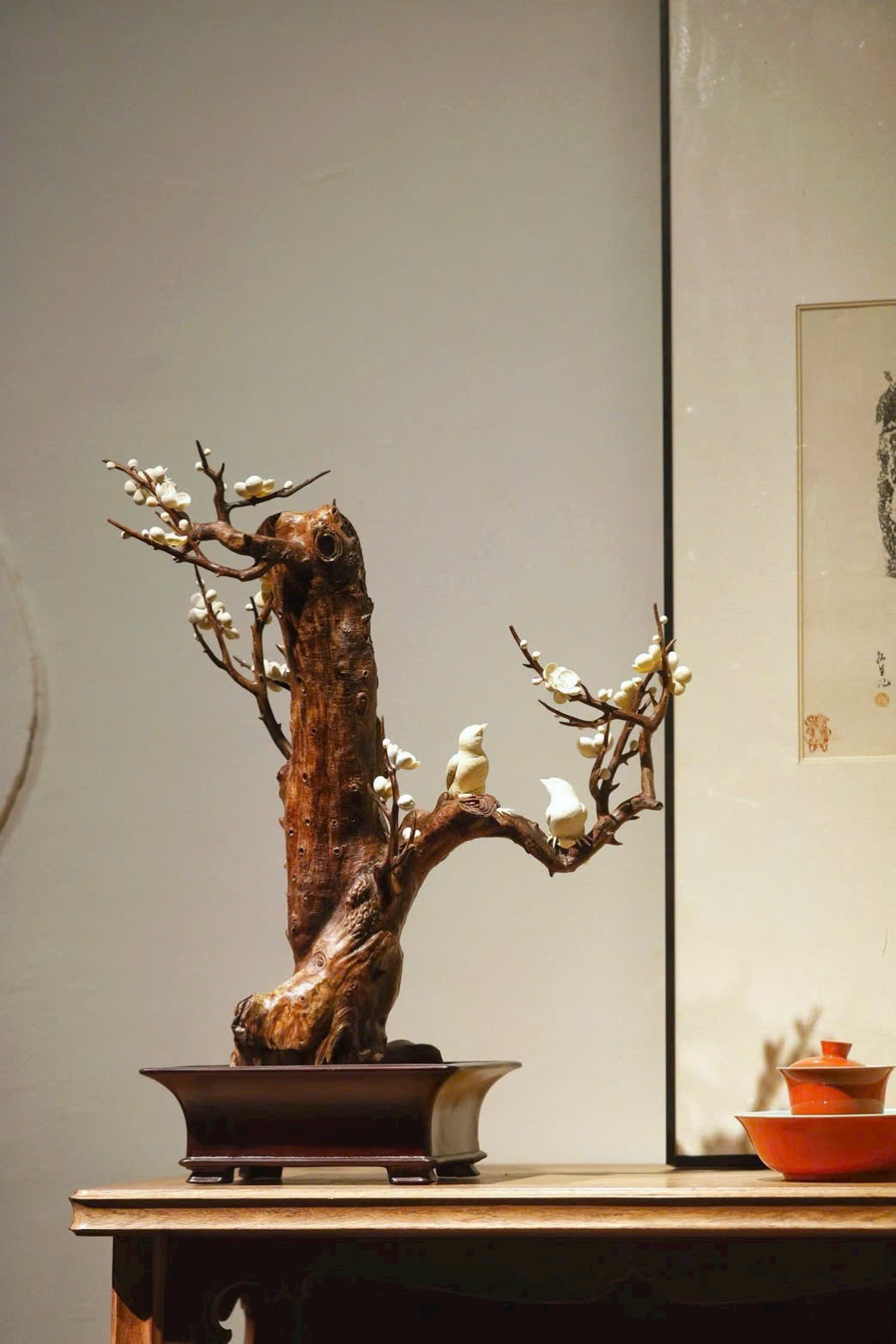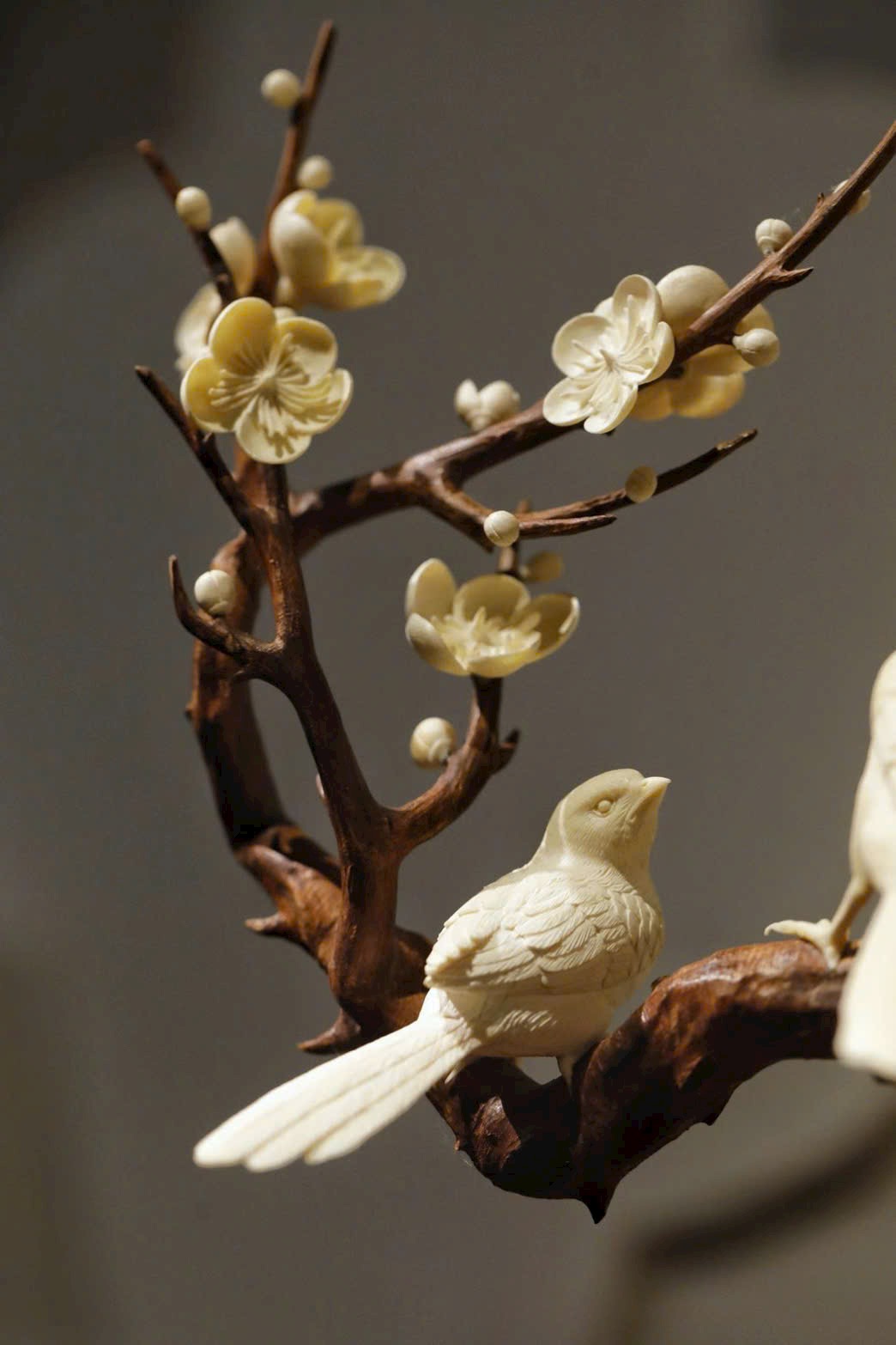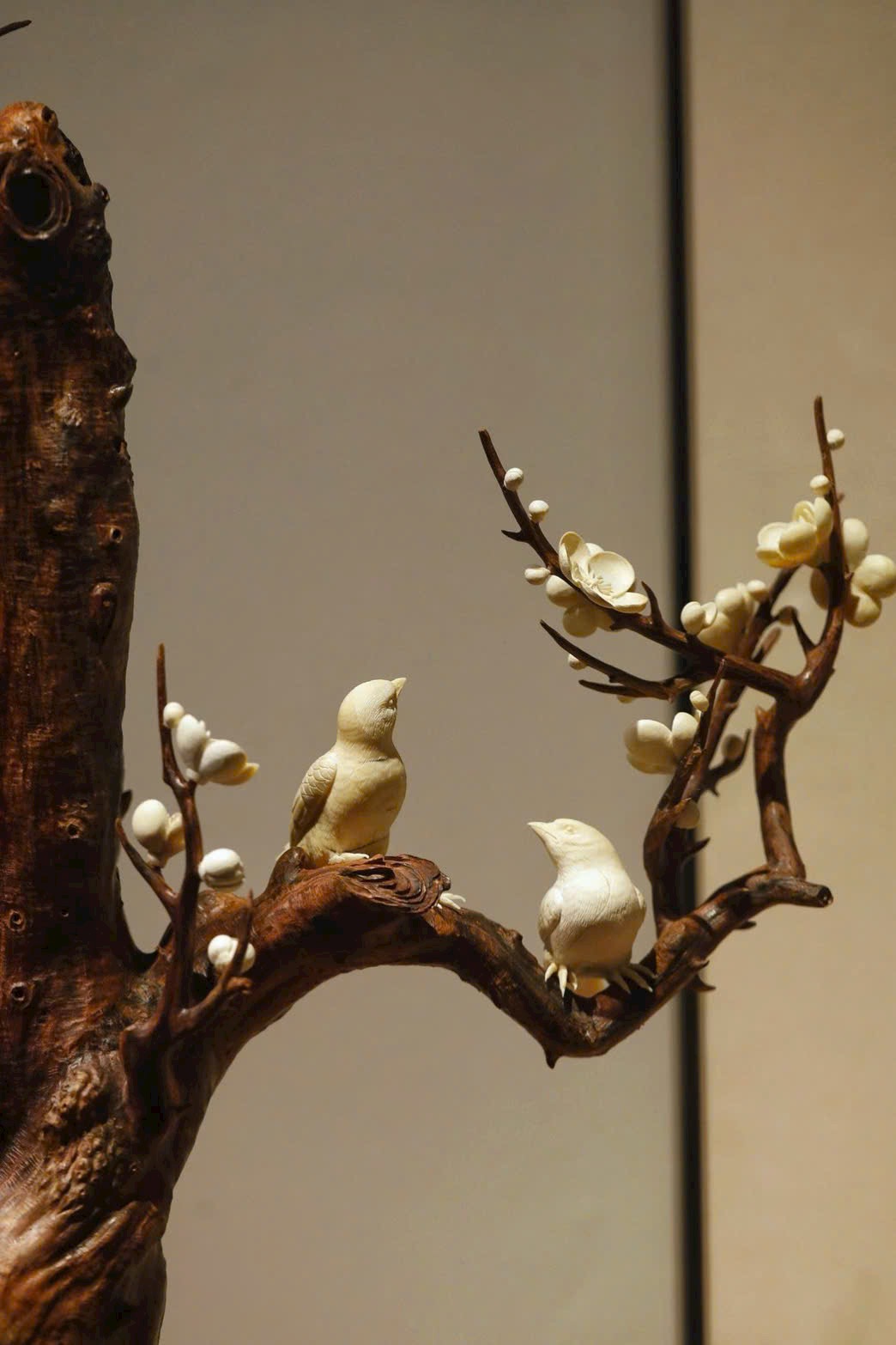 Lấy gỗ Sưa Hải Nam làm cốt, tái hiện dáng cành mai cổ uốn lượn, kết hợp ngà voi ma mút chạm khắc tinh xảo tạo nên những đóa bạch mai nở rộ, trong trẻo như tuyết. Hai chim hỷ thước đậu trên cành, lông vũ hiện rõ, thần thái sinh động như thật. Đặt trên án bàn, tựa như nghe tiếng chim báo hỷ, tràn đầy cát tường và may mắn.