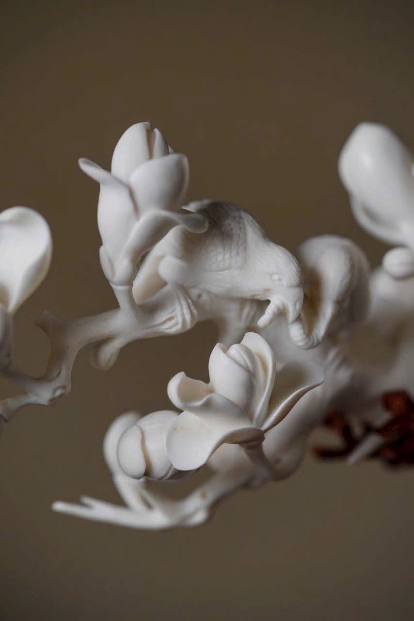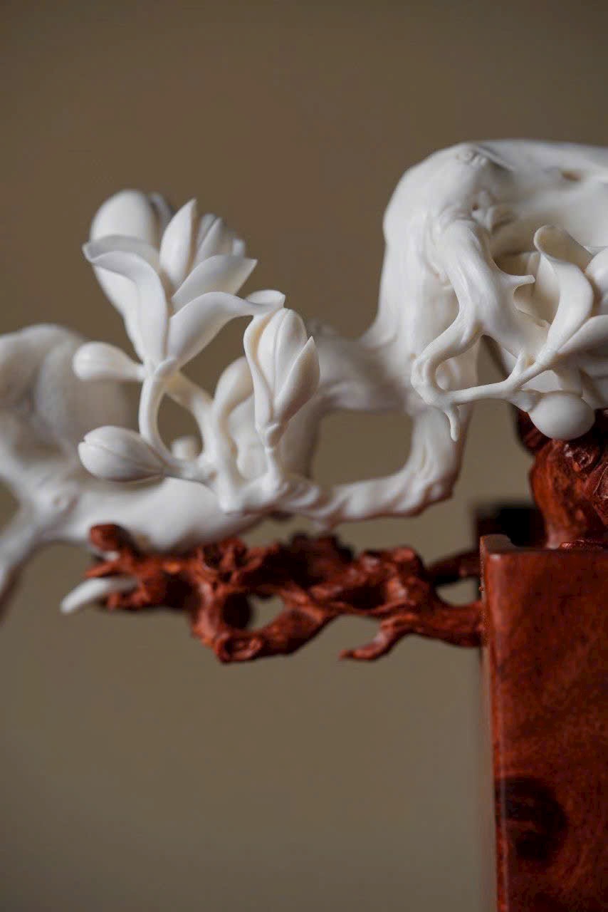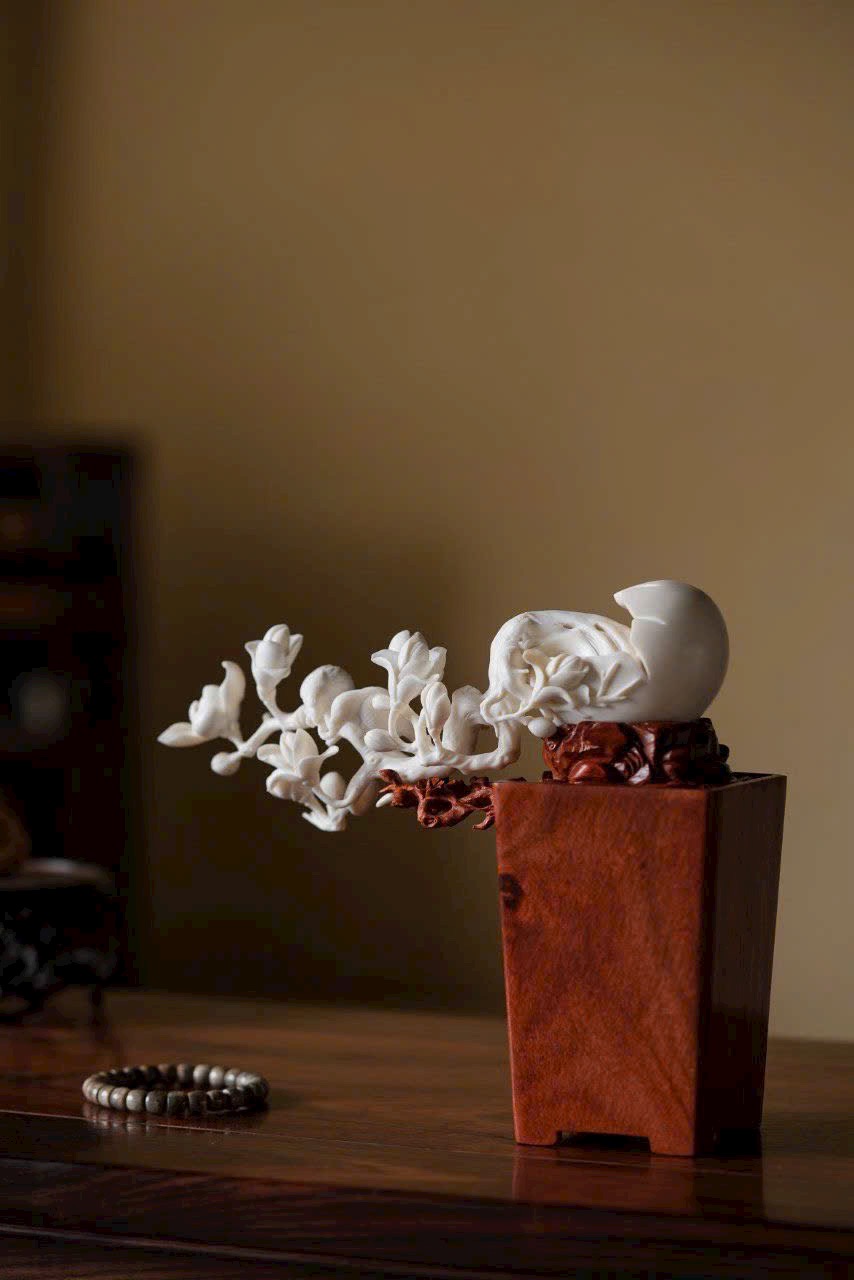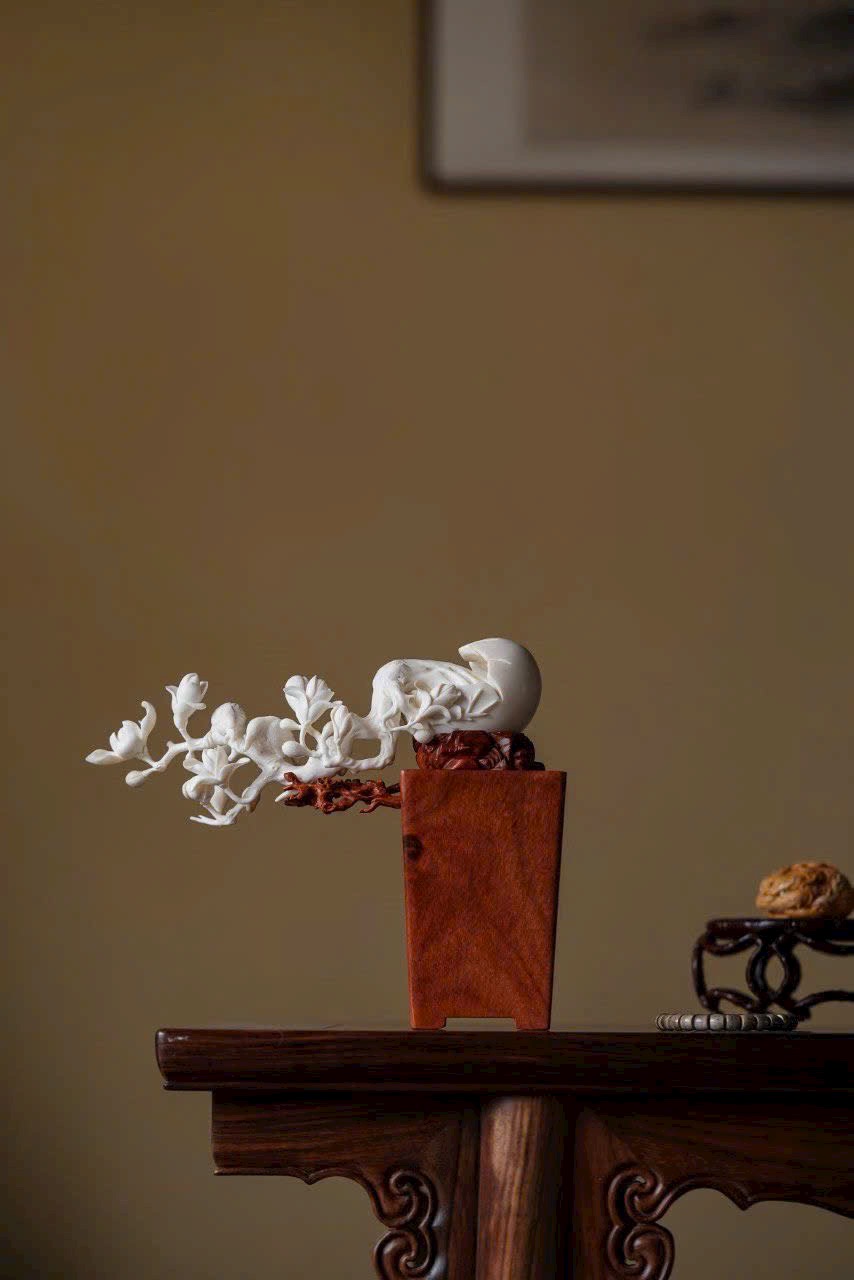 Gạc hươu ấm nhuận khắc họa sắc xuân, ngọc lan nở rộ tỏa hương thanh. Đôi chim sẻ đậu cành bắt sâu, cánh vỗ khẽ, mỏ nhọn hơi cong, tràn đầy sức sống. Bày trên án thư, thong dong ngắm cảnh chim ca hoa nở, tĩnh tại tận hưởng thú vui thiên nhiên.