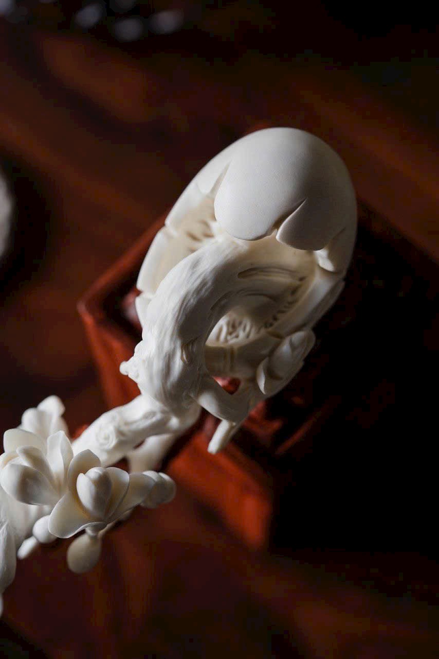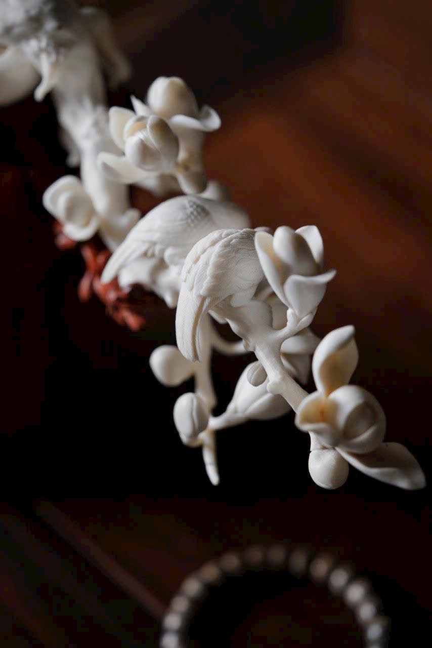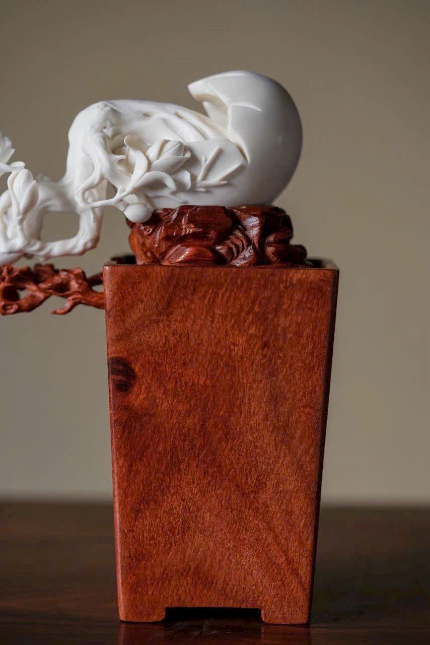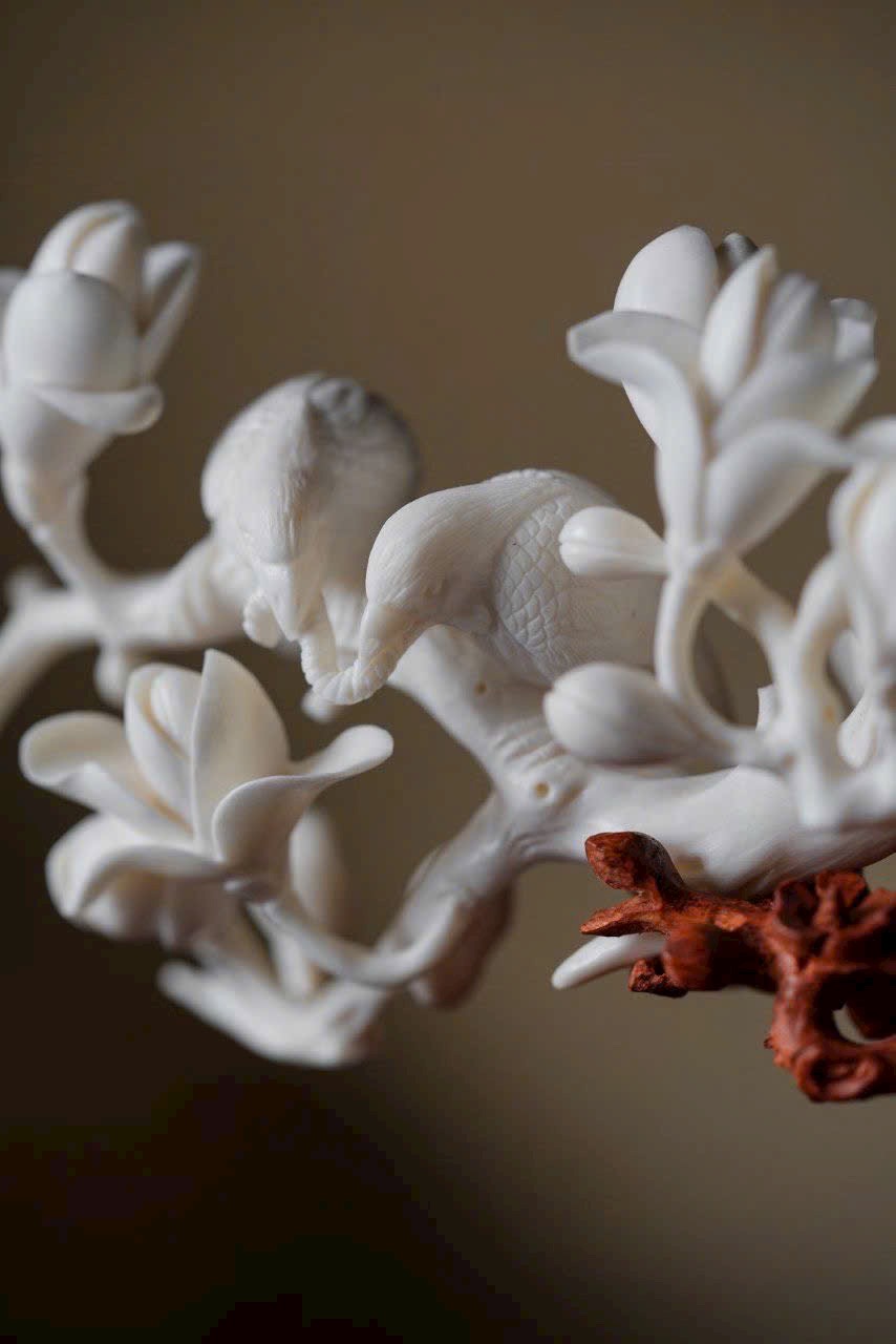 Gạc hươu ấm nhuận khắc họa sắc xuân, ngọc lan nở rộ tỏa hương thanh. Đôi chim sẻ đậu cành bắt sâu, cánh vỗ khẽ, mỏ nhọn hơi cong, tràn đầy sức sống. Bày trên án thư, thong dong ngắm cảnh chim ca hoa nở, tĩnh tại tận hưởng thú vui thiên nhiên.