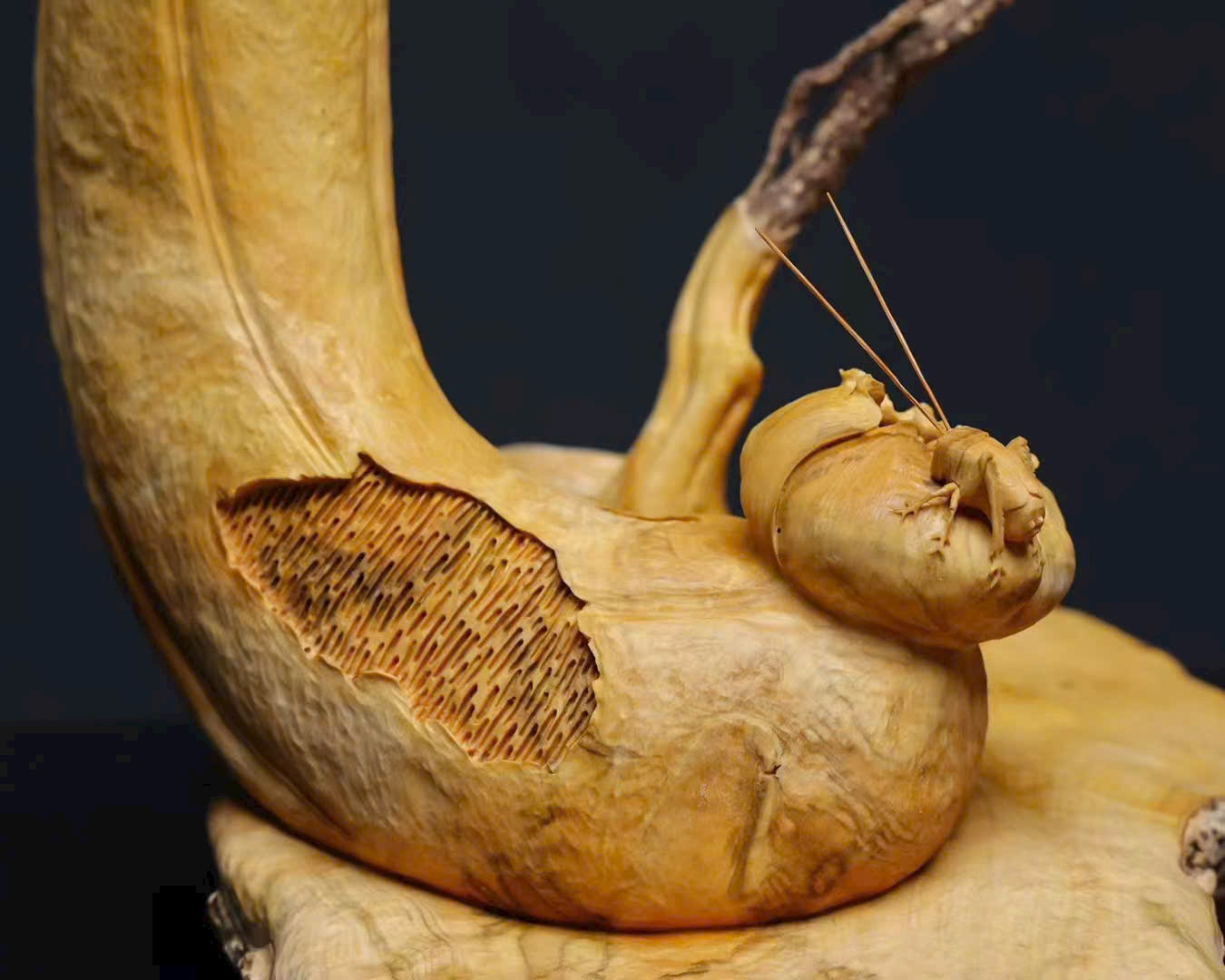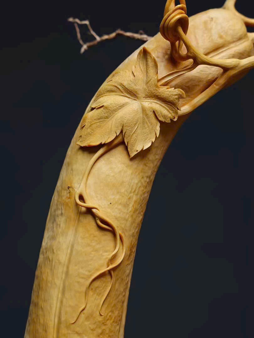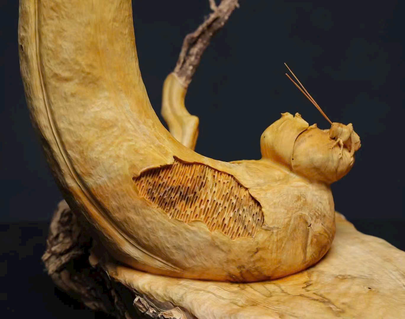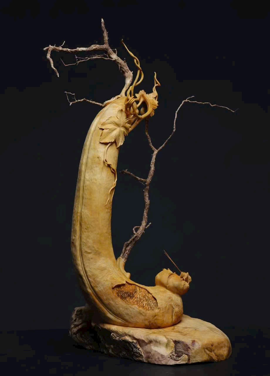 Tác phẩm chạm khắc thủ công từ một khối gỗ nguyên liệu, áp dụng kỹ thuật tròn khối (round carving), một gỗ tạo hình – không ghép nối, kết cấu liền mạch tự nhiên, phẩm tướng hoàn hảo, không tì vết. Ý nghĩa cát tường như ý – chiêu tài nạp bảo, rất thích hợp trưng bày nhà ở, văn phòng hoặc sưu tầm.