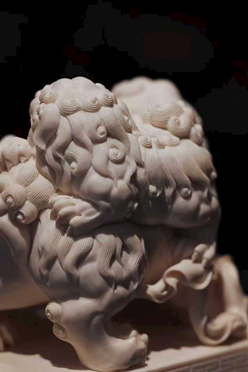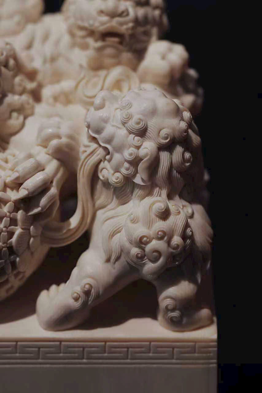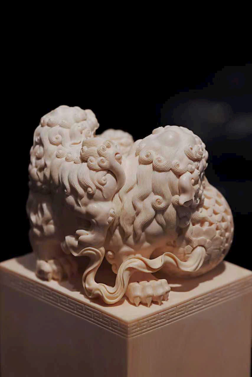 Tác phẩm được tạo hình từ một khối mamut nguyên, chạm khắc theo thế liệu, đường đao tròn trịa, chặt chẽ. Linh sư hiện ra sống động, bộ râu và lông tơ được khắc tỉ mỉ, thần thái uy mãnh mà linh hoạt, toát lên khí thế cát tường.