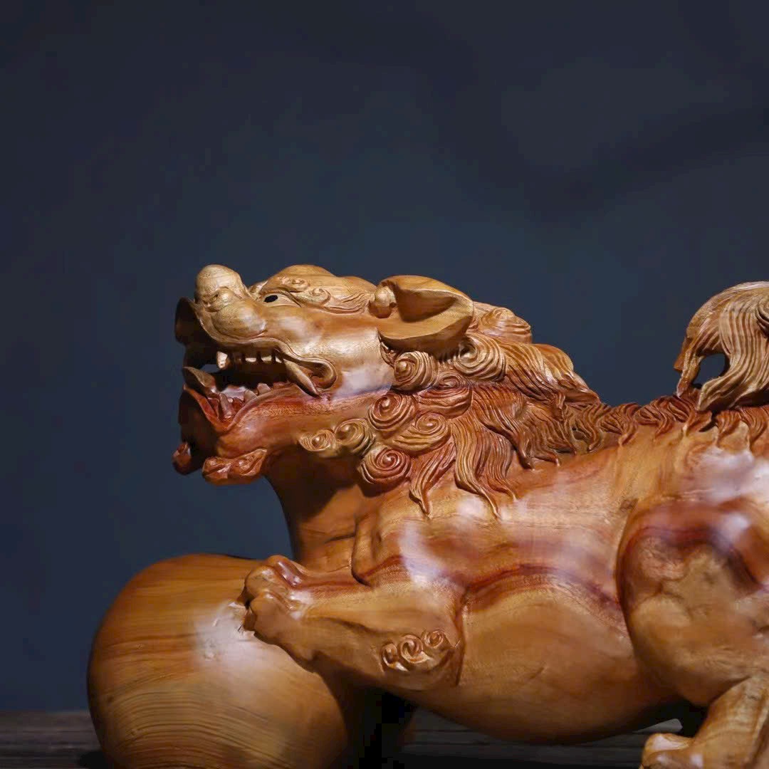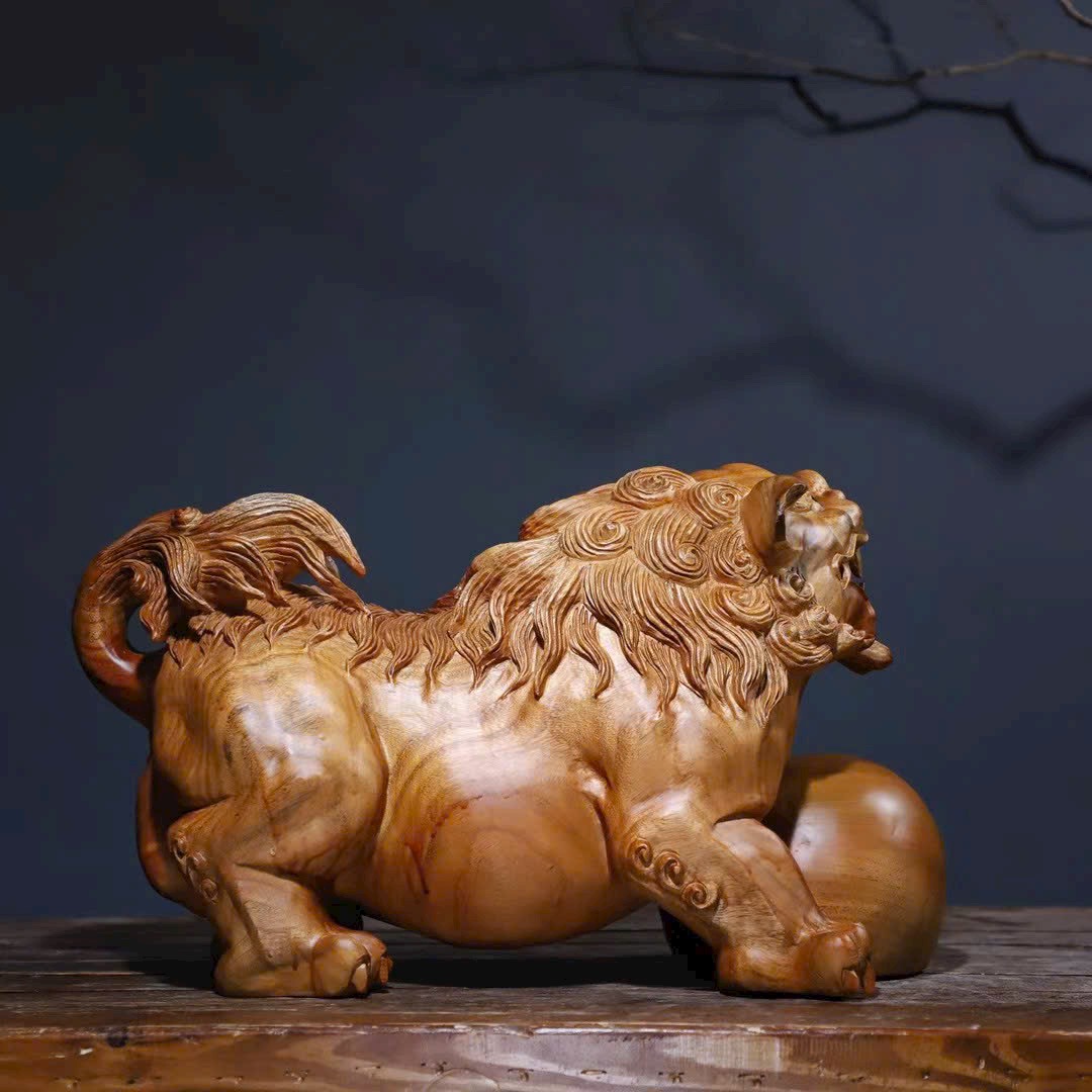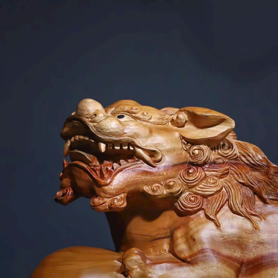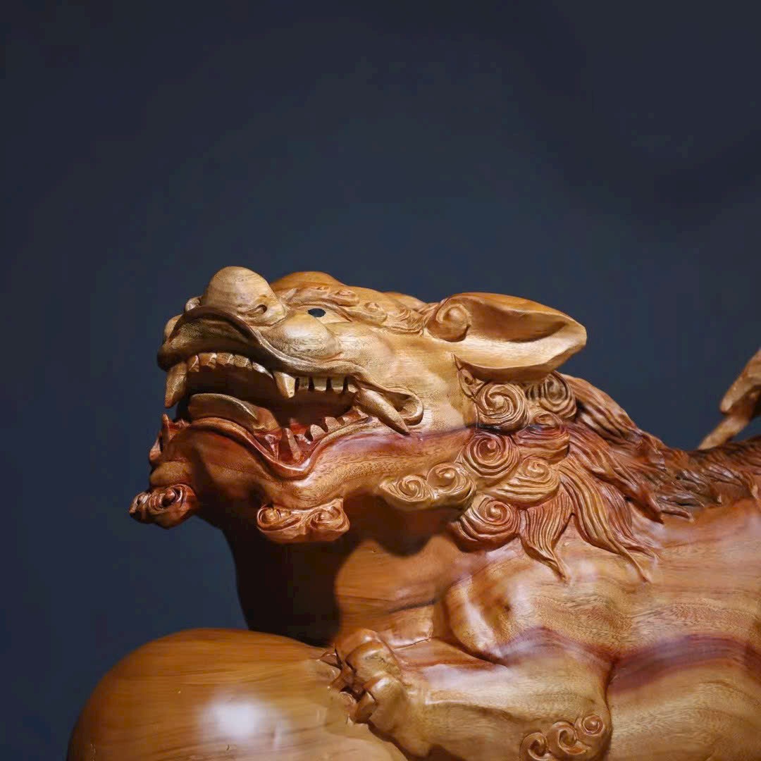 Tượng sư tử gỗ long não chạm khắc sống động, thần thái uy nghi, tượng trưng cho trấn trạch – hộ gia – chiêu tài, mang ý nghĩa mọi việc hanh thông, sự sự như ý.