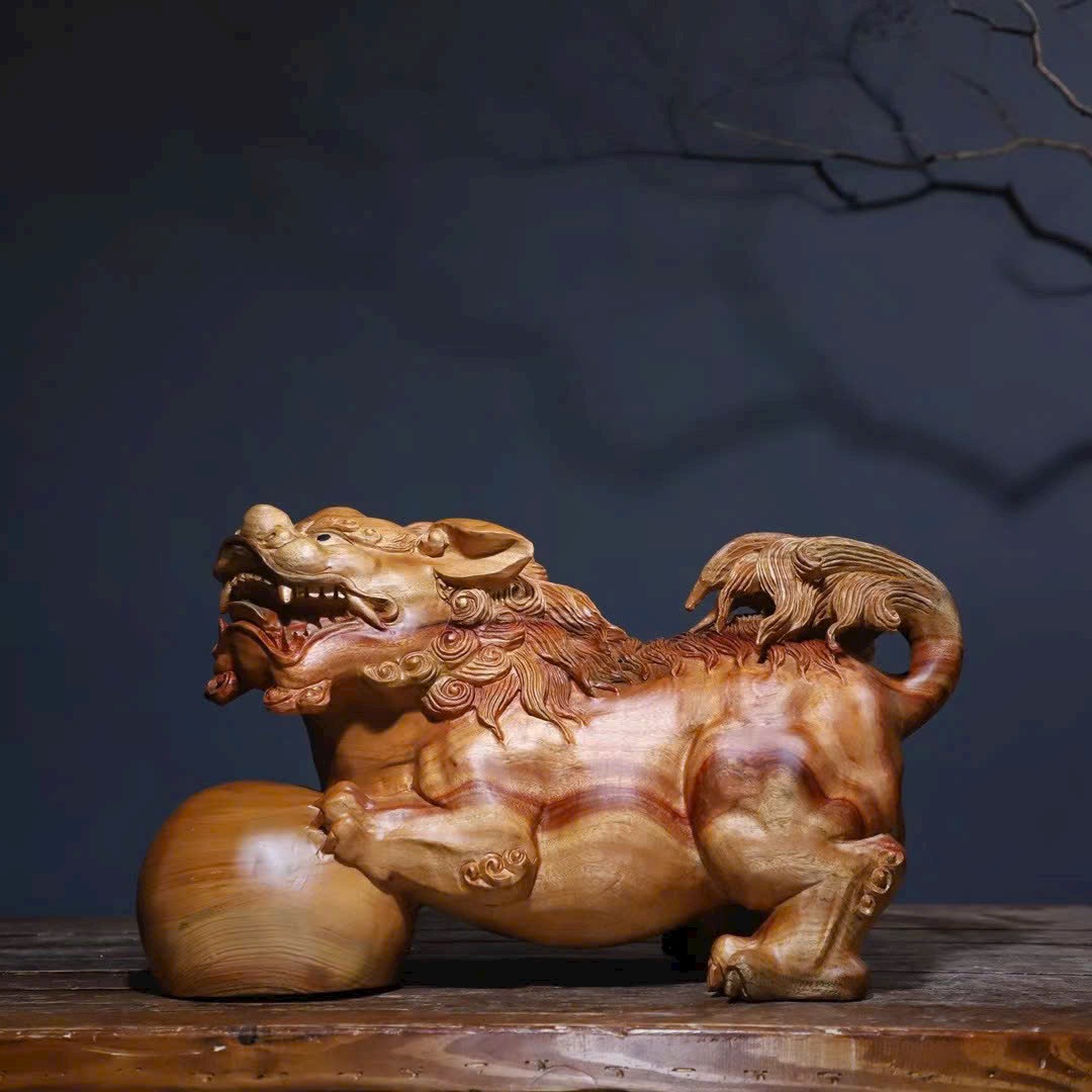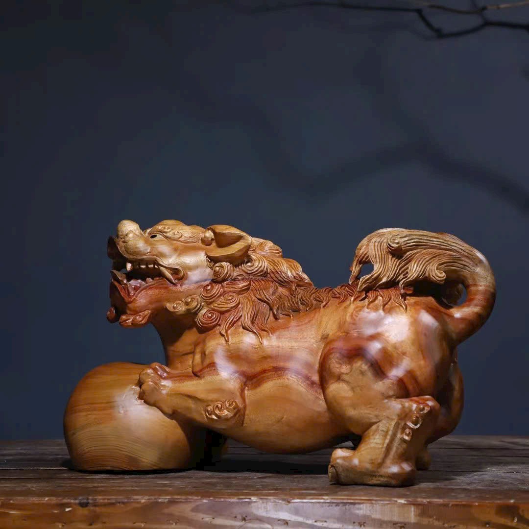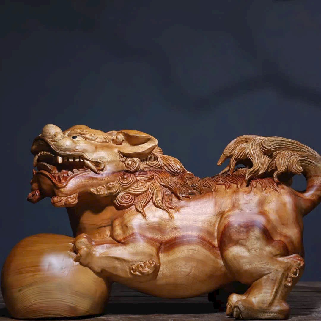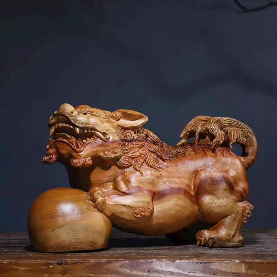 Tượng sư tử gỗ long não chạm khắc sống động, thần thái uy nghi, tượng trưng cho trấn trạch – hộ gia – chiêu tài, mang ý nghĩa mọi việc hanh thông, sự sự như ý.