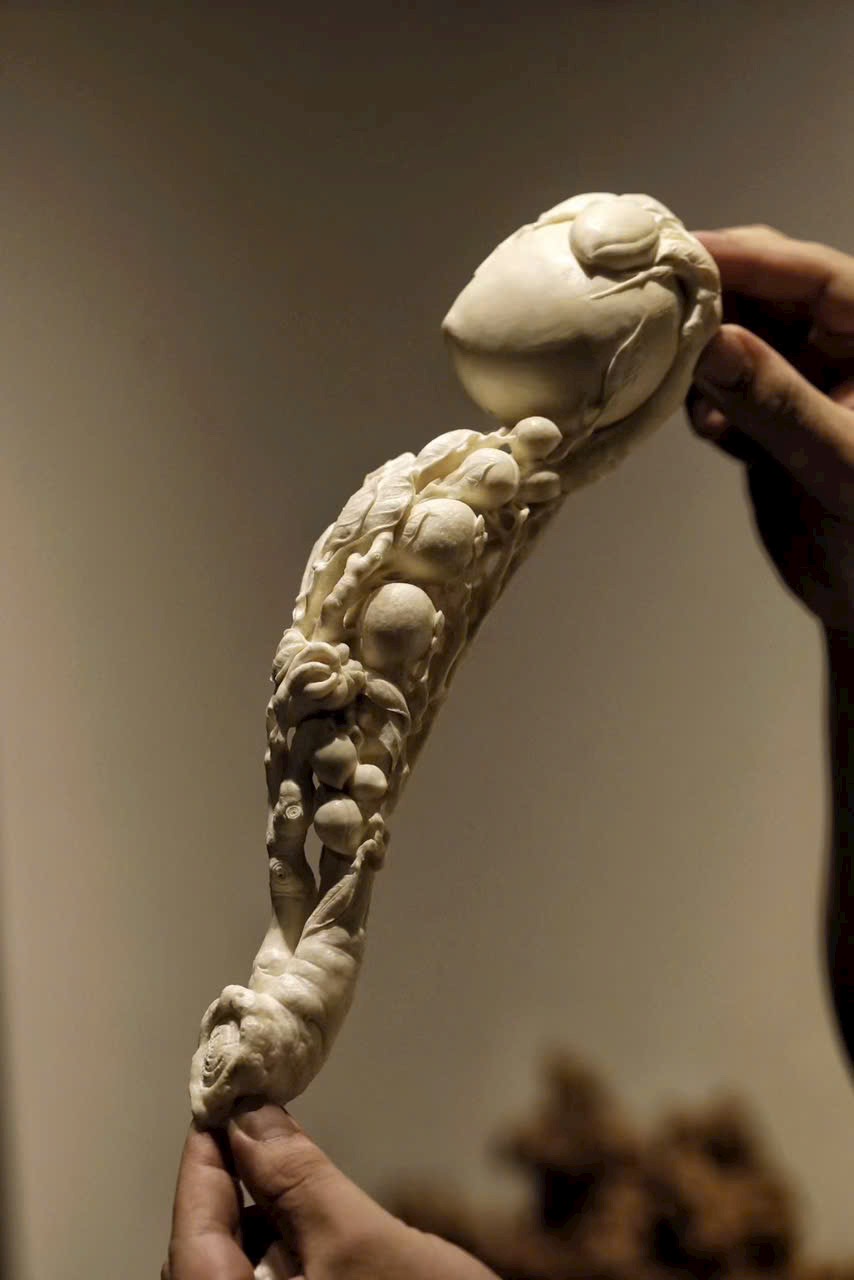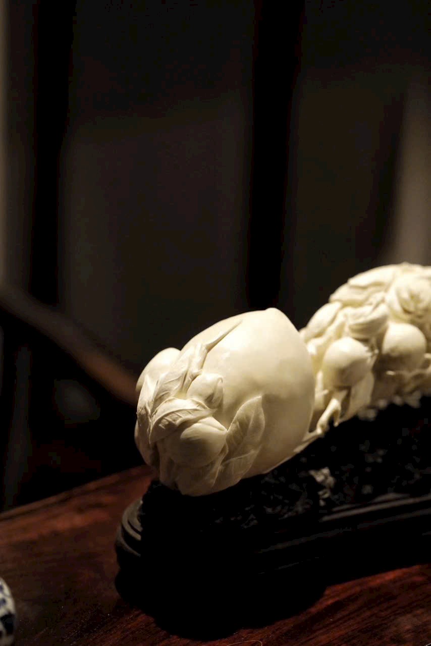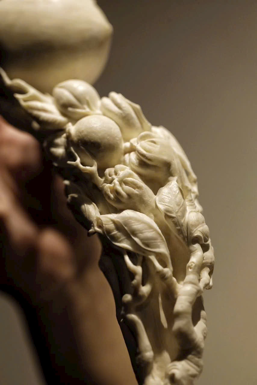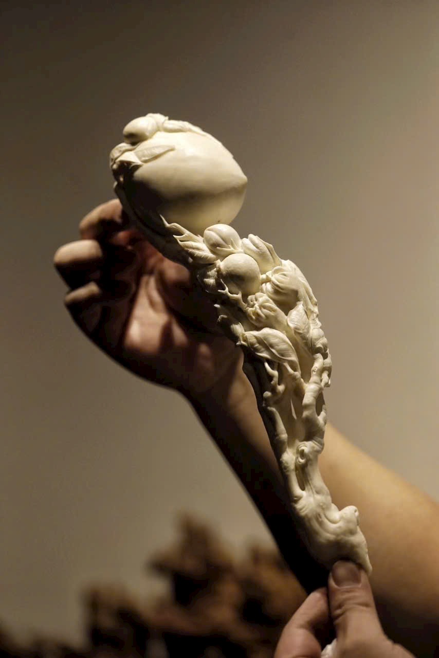 Ngọc n.gà mịn, chế tác tinh xảo. Toàn khối chạm khắc Phật thủ (phúc), đào thọ (thọ), lựu (đông con), hàm ý cát tường “đa phúc, đa thọ, đa tử”. Đường nét mềm mại, khí vận trang nhã, thích hợp làm lễ vật mừng thọ.
