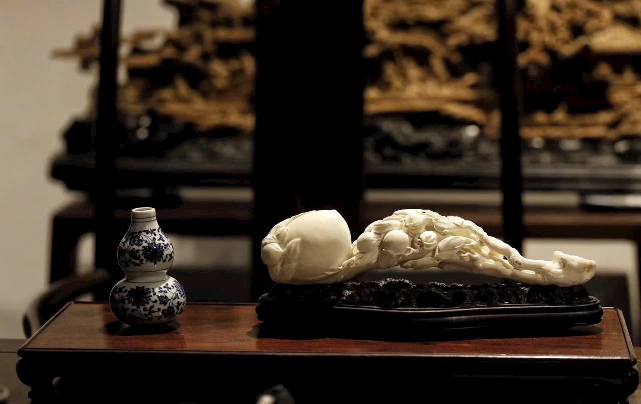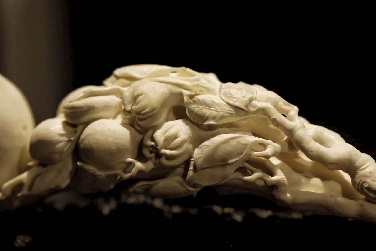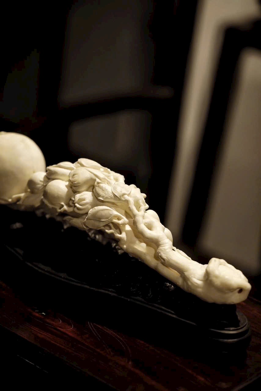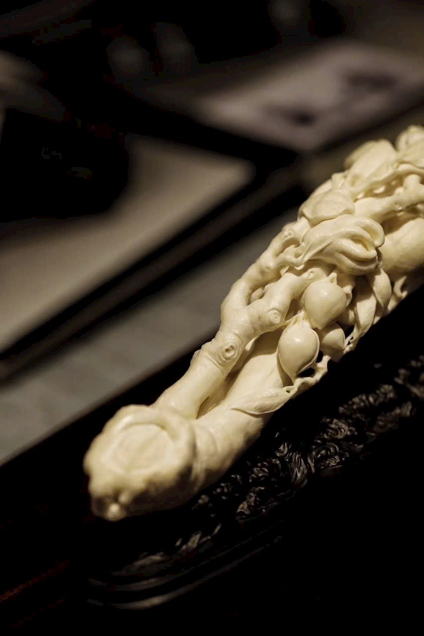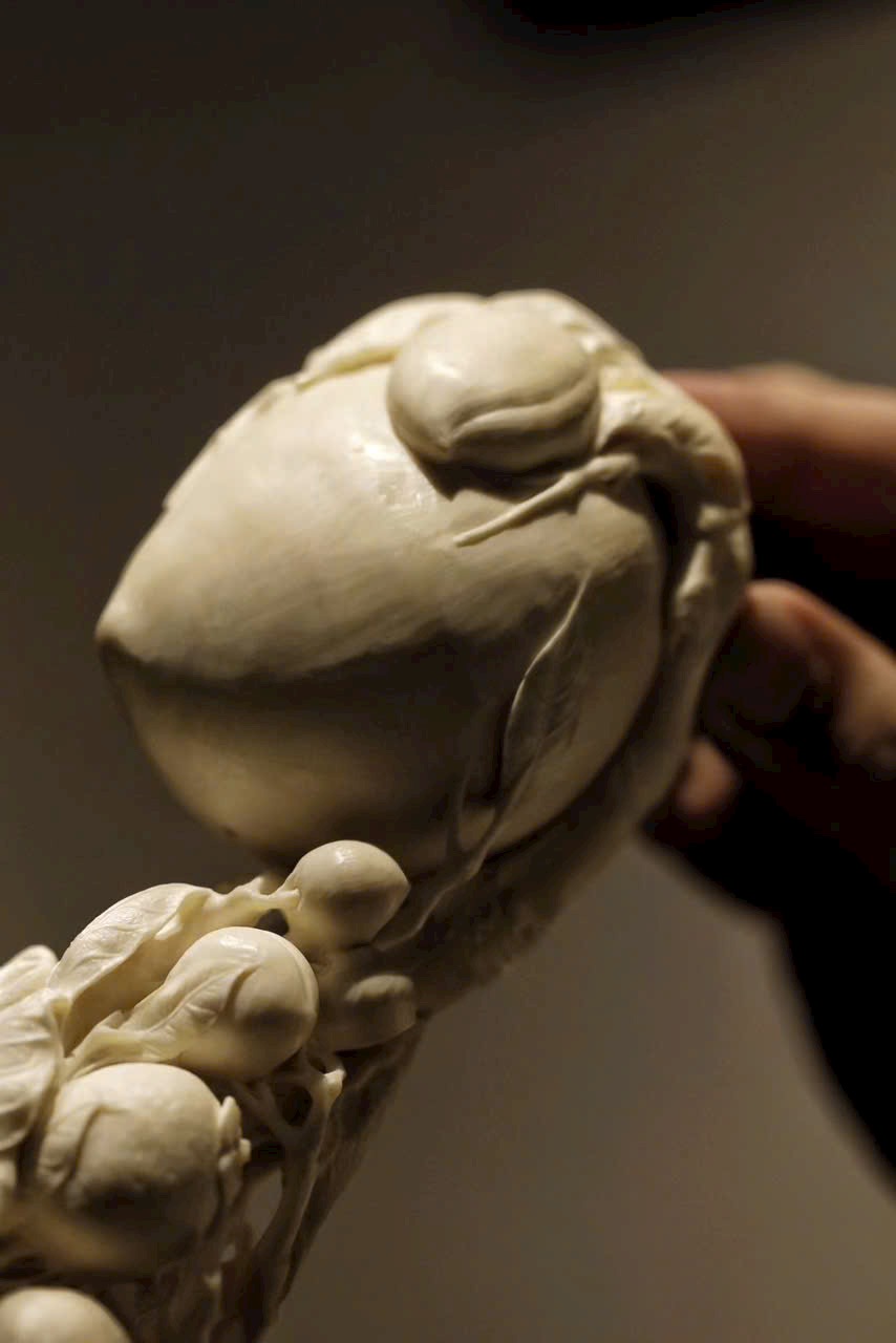 Ngọc n.gà mịn, chế tác tinh xảo. Toàn khối chạm khắc Phật thủ (phúc), đào thọ (thọ), lựu (đông con), hàm ý cát tường “đa phúc, đa thọ, đa tử”. Đường nét mềm mại, khí vận trang nhã, thích hợp làm lễ vật mừng thọ.