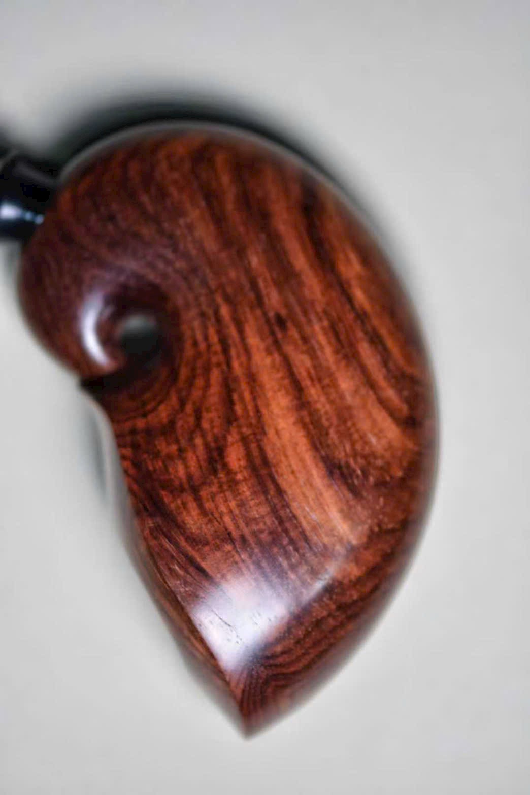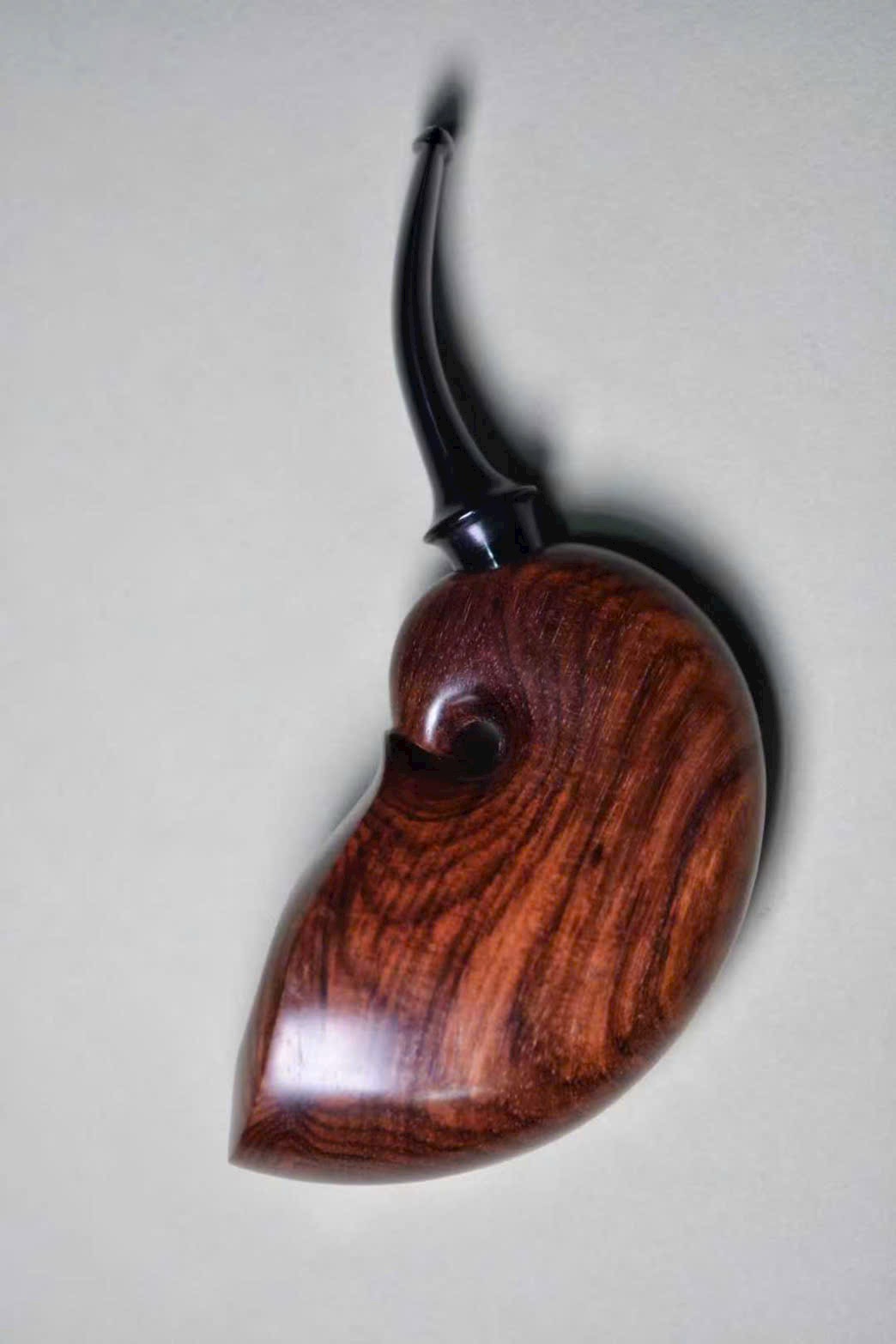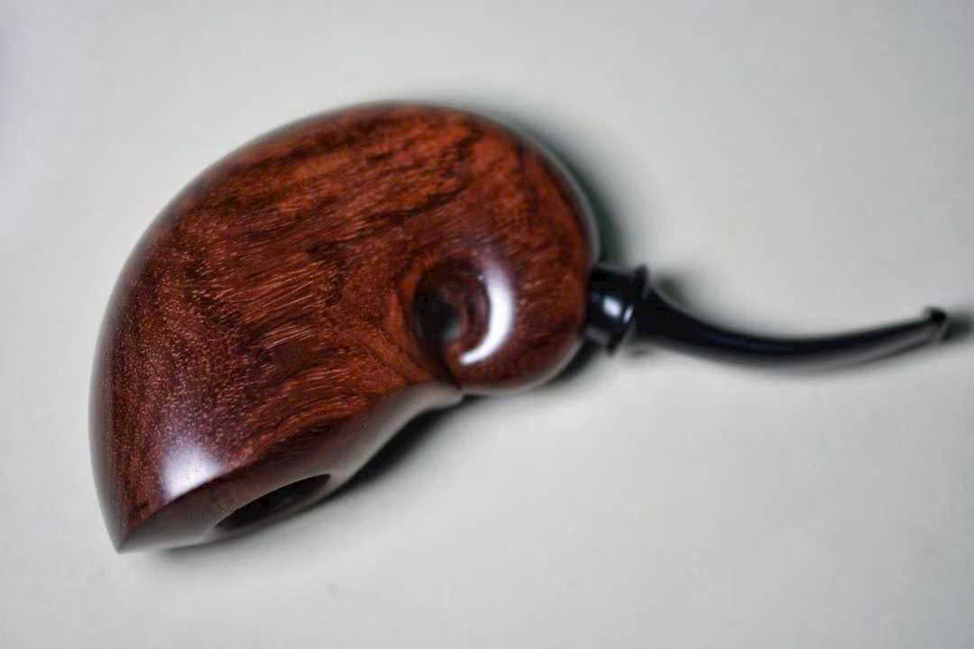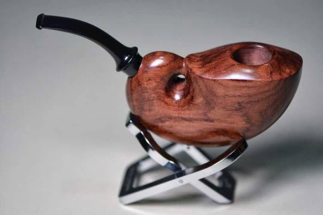 Chiếc tẩu được chế tác từ gỗ Sưa Hải Nam quý hiếm, sắc gỗ nâu tím trầm tĩnh, vân gỗ uyển chuyển như mây nước. Do danh gia Sở Lưu Hương tự tay thực hiện, hình dáng tinh xảo, đường nét tròn đầy sinh động.