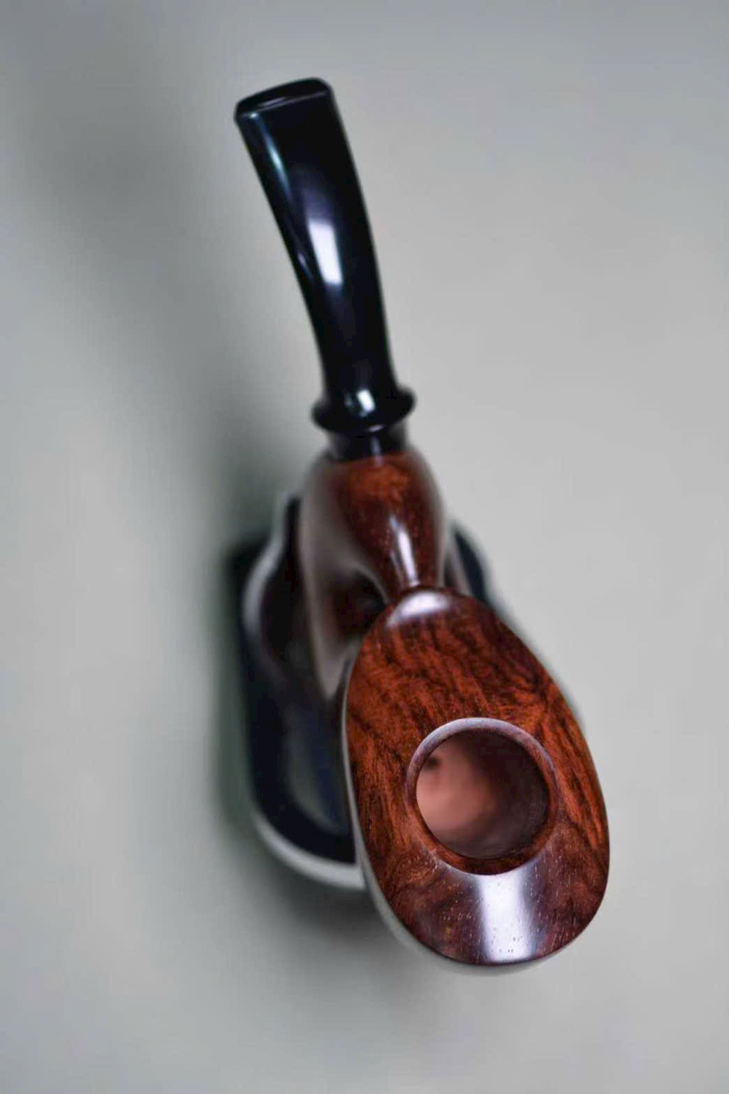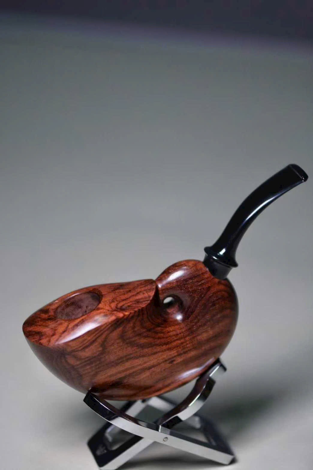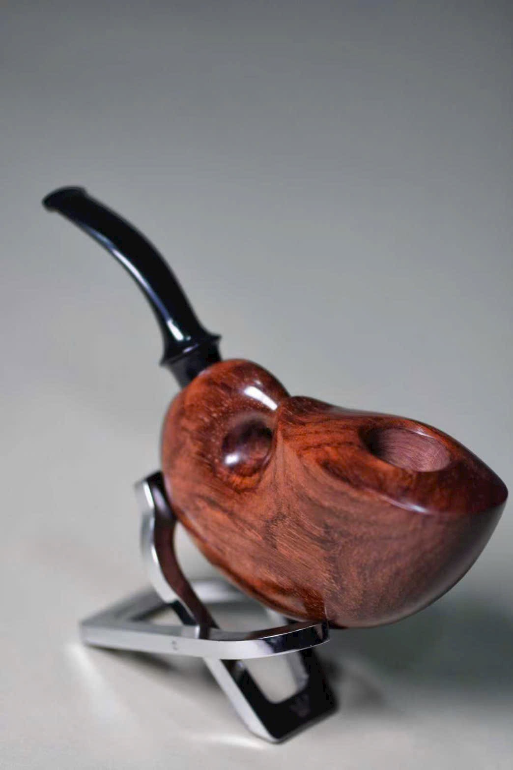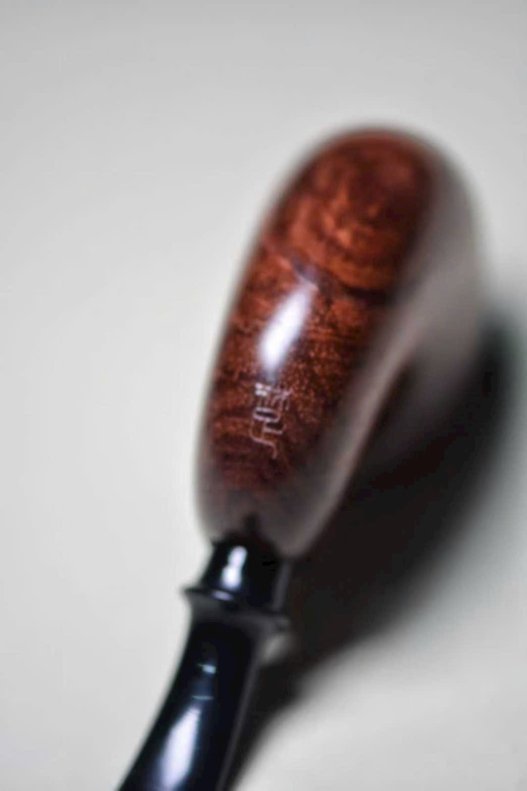 Chiếc tẩu được chế tác từ gỗ Sưa Hải Nam quý hiếm, sắc gỗ nâu tím trầm tĩnh, vân gỗ uyển chuyển như mây nước. Do danh gia Sở Lưu Hương tự tay thực hiện, hình dáng tinh xảo, đường nét tròn đầy sinh động.