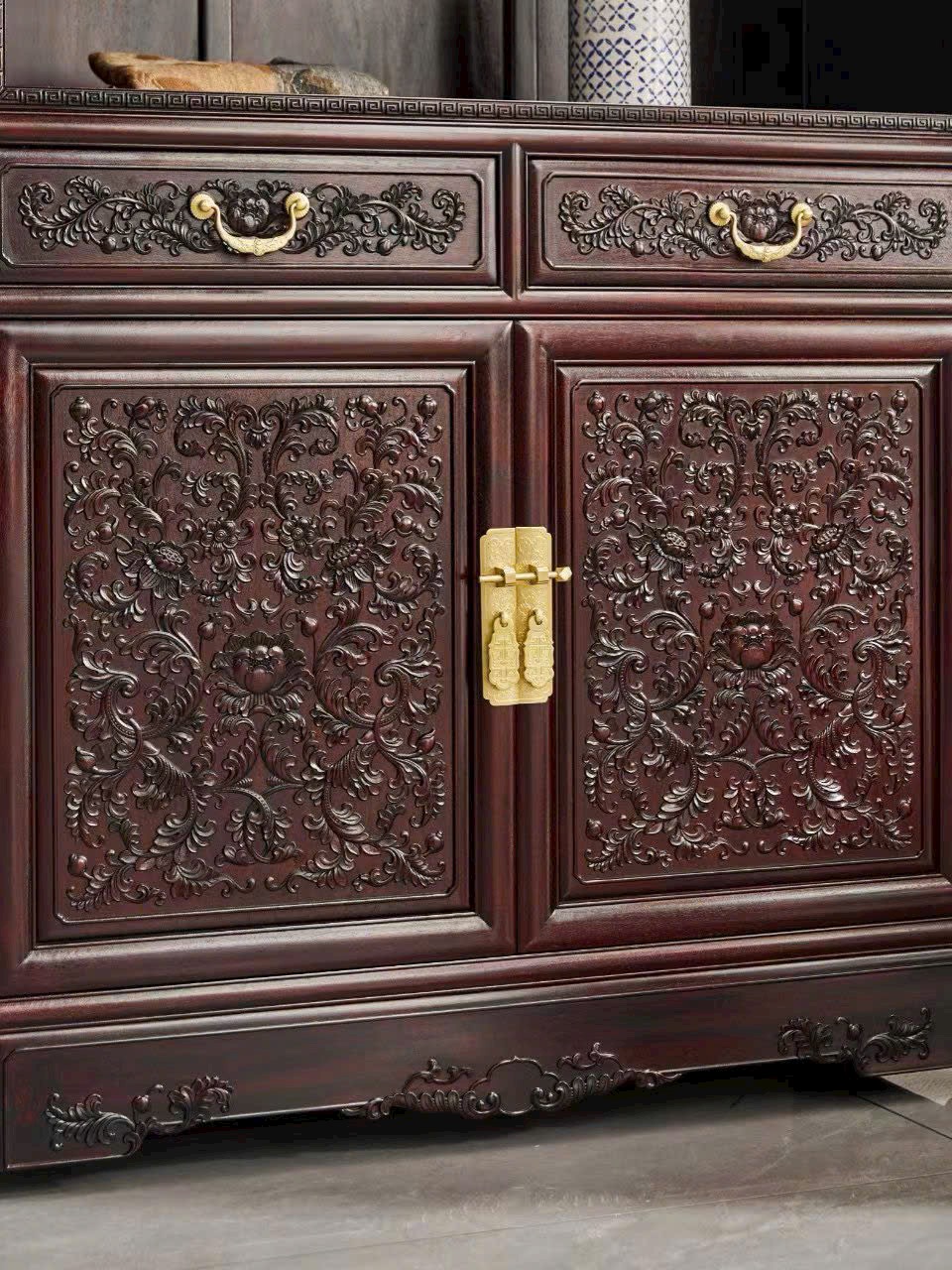 Mẫu thư quỹ lượng cách thiết kế thoáng mở, bố cục ngăn tầng cân đối, vừa trưng bày vừa lưu trữ tiện dụng. Hoa văn Tây Phiên Liên mềm mại, mang ý nghĩa cát tường – trường thọ – liên miên phúc khí.