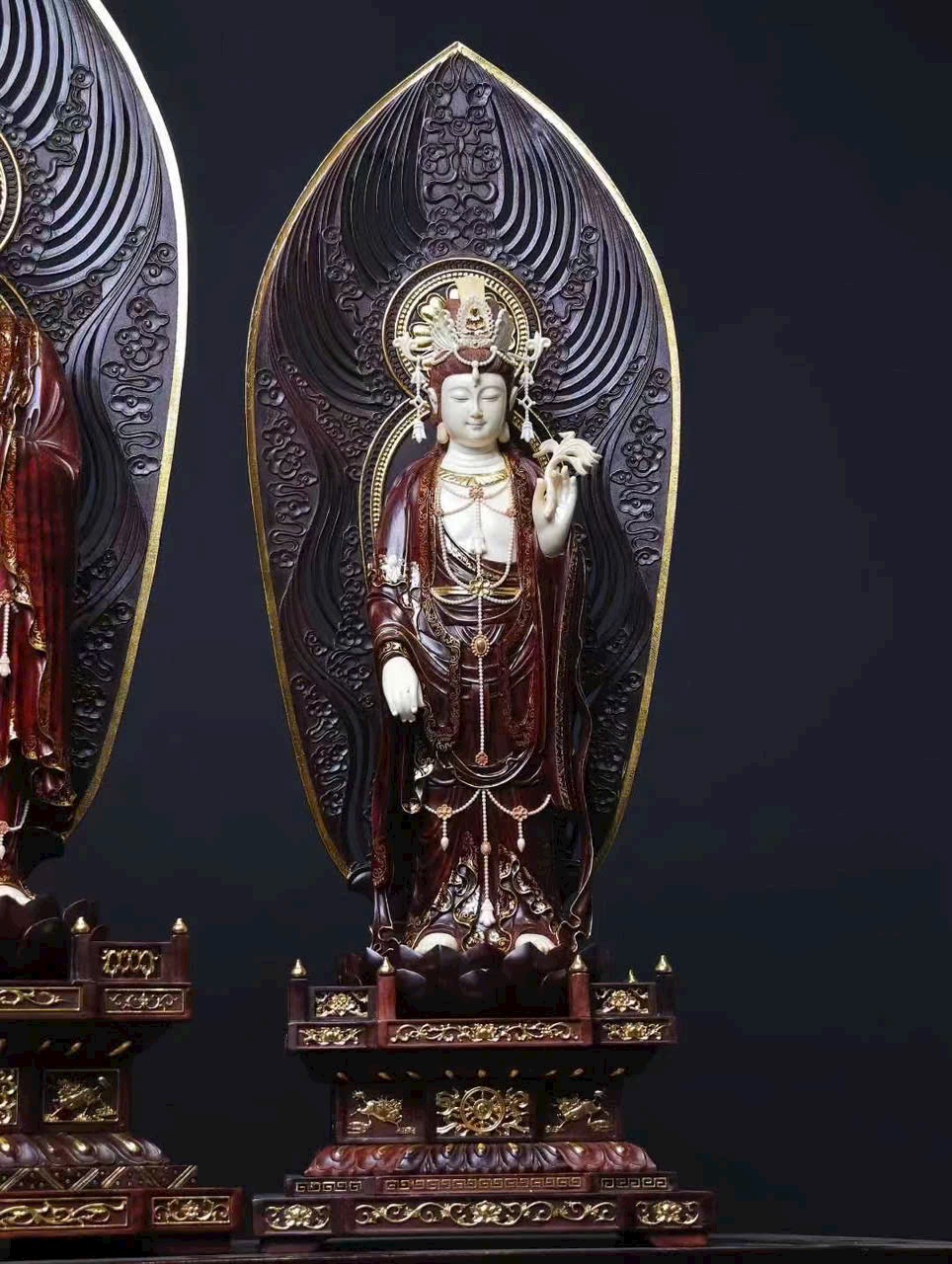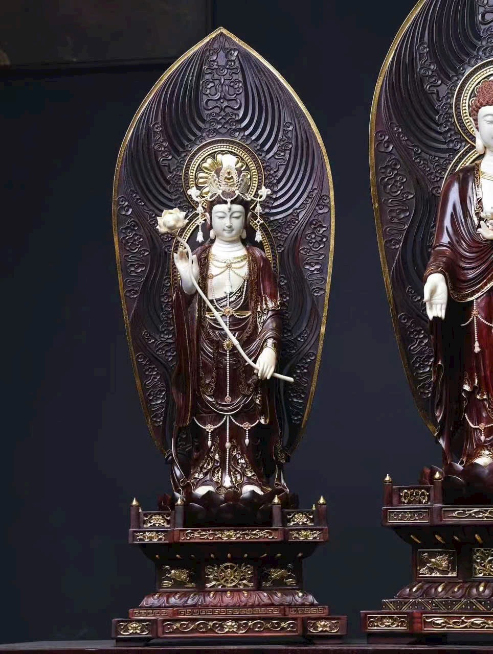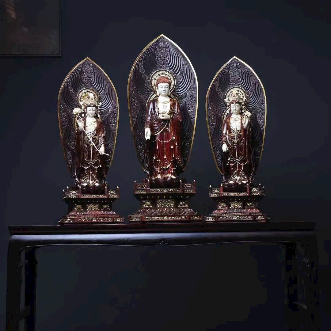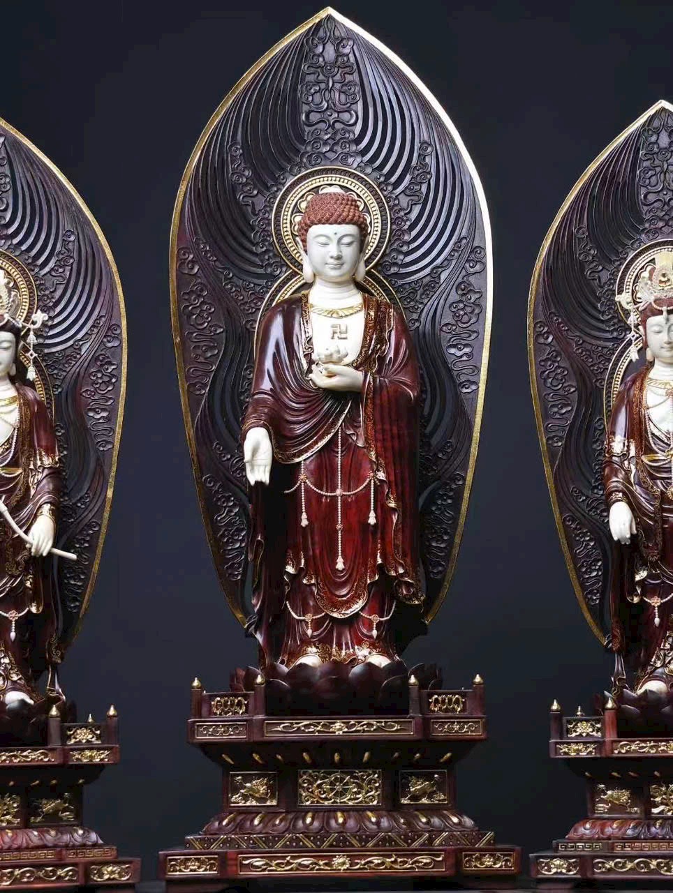 Bộ tượng sử dụng gỗ tử đàn lá nhỏ kết hợp khảm ng.à voi Mamut tinh xảo. Tỷ lệ hài hòa, sắc tướng từ hòa trang nghiêm, đường nét điêu khắc rõ ràng, khảm ngà khít mịn, toát lên vẻ thanh tịnh – thù thắng – quang minh của Tây Phương Tam Thánh.