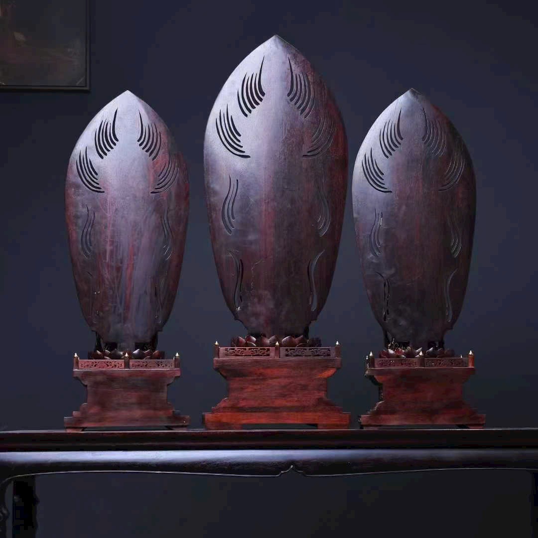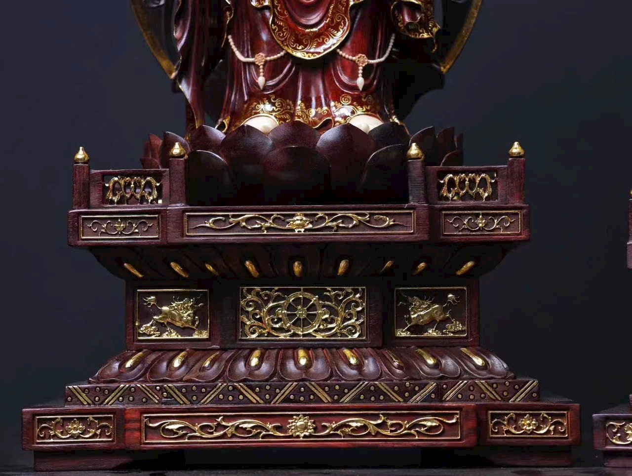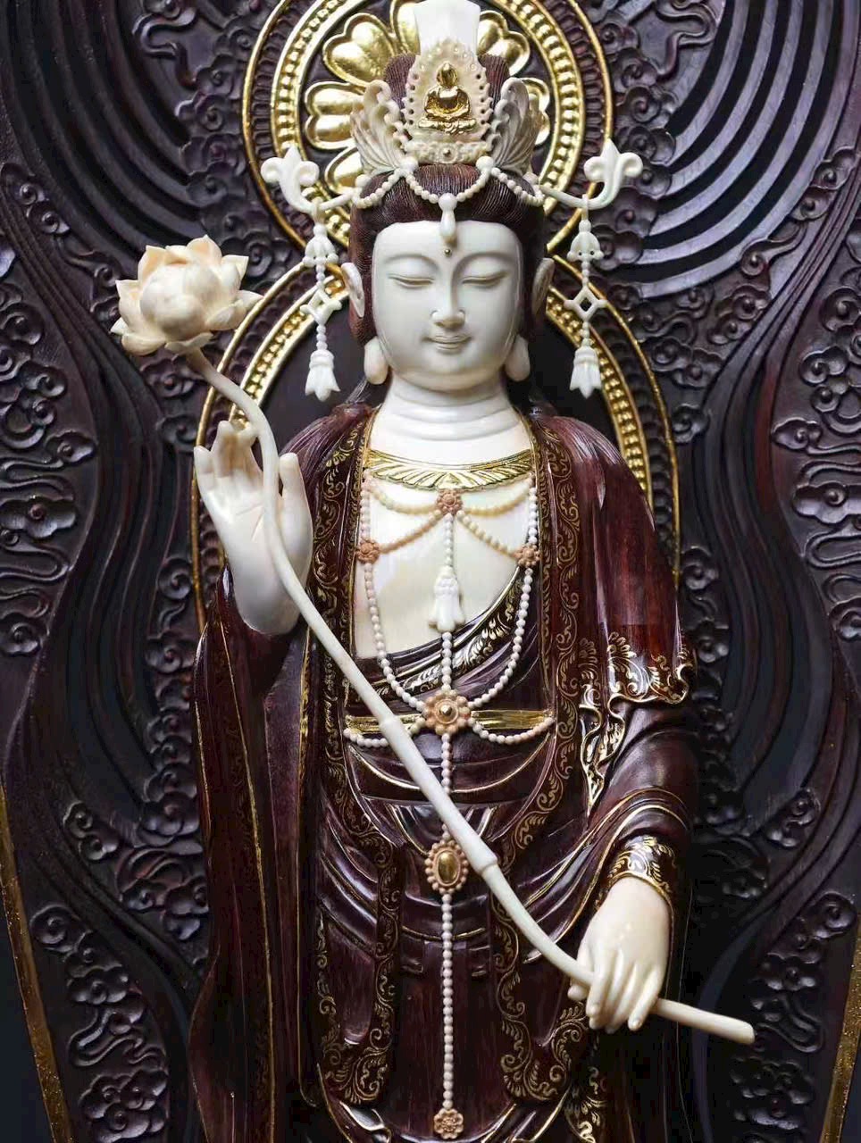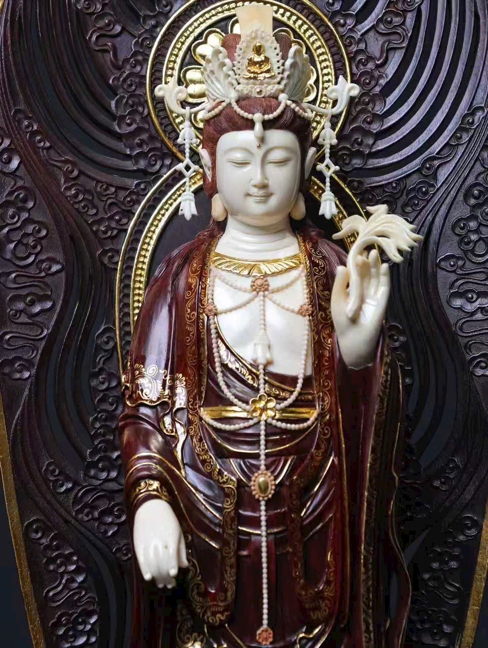 Bộ tượng sử dụng gỗ tử đàn lá nhỏ kết hợp khảm ng.à voi Mamut tinh xảo. Tỷ lệ hài hòa, sắc tướng từ hòa trang nghiêm, đường nét điêu khắc rõ ràng, khảm ngà khít mịn, toát lên vẻ thanh tịnh – thù thắng – quang minh của Tây Phương Tam Thánh.