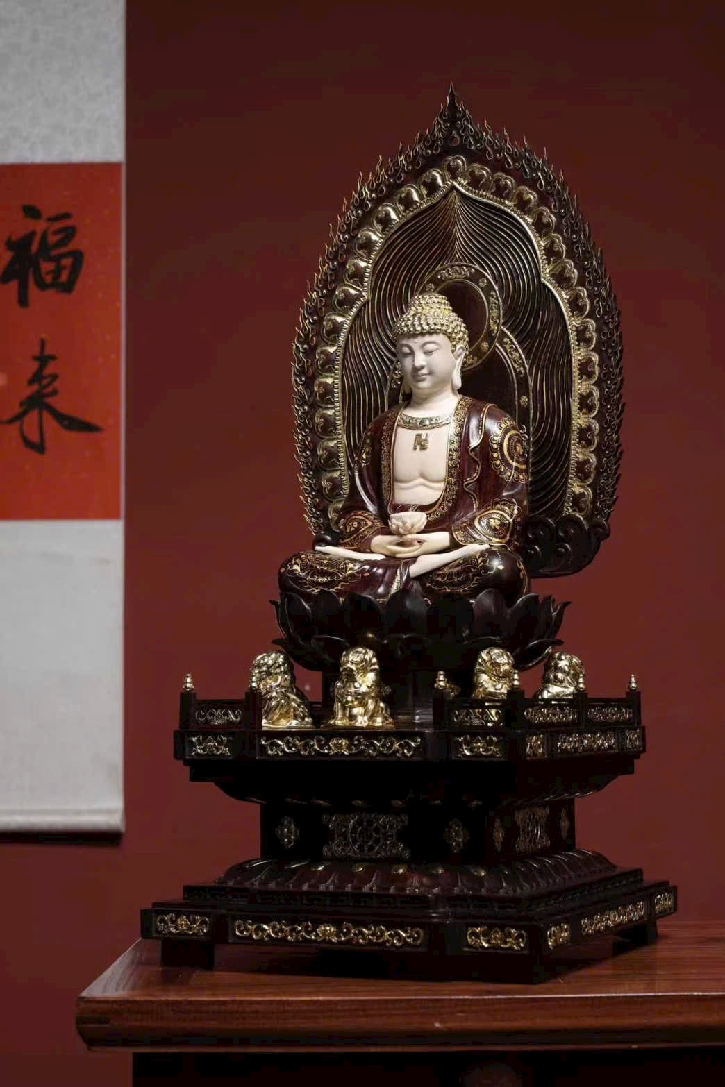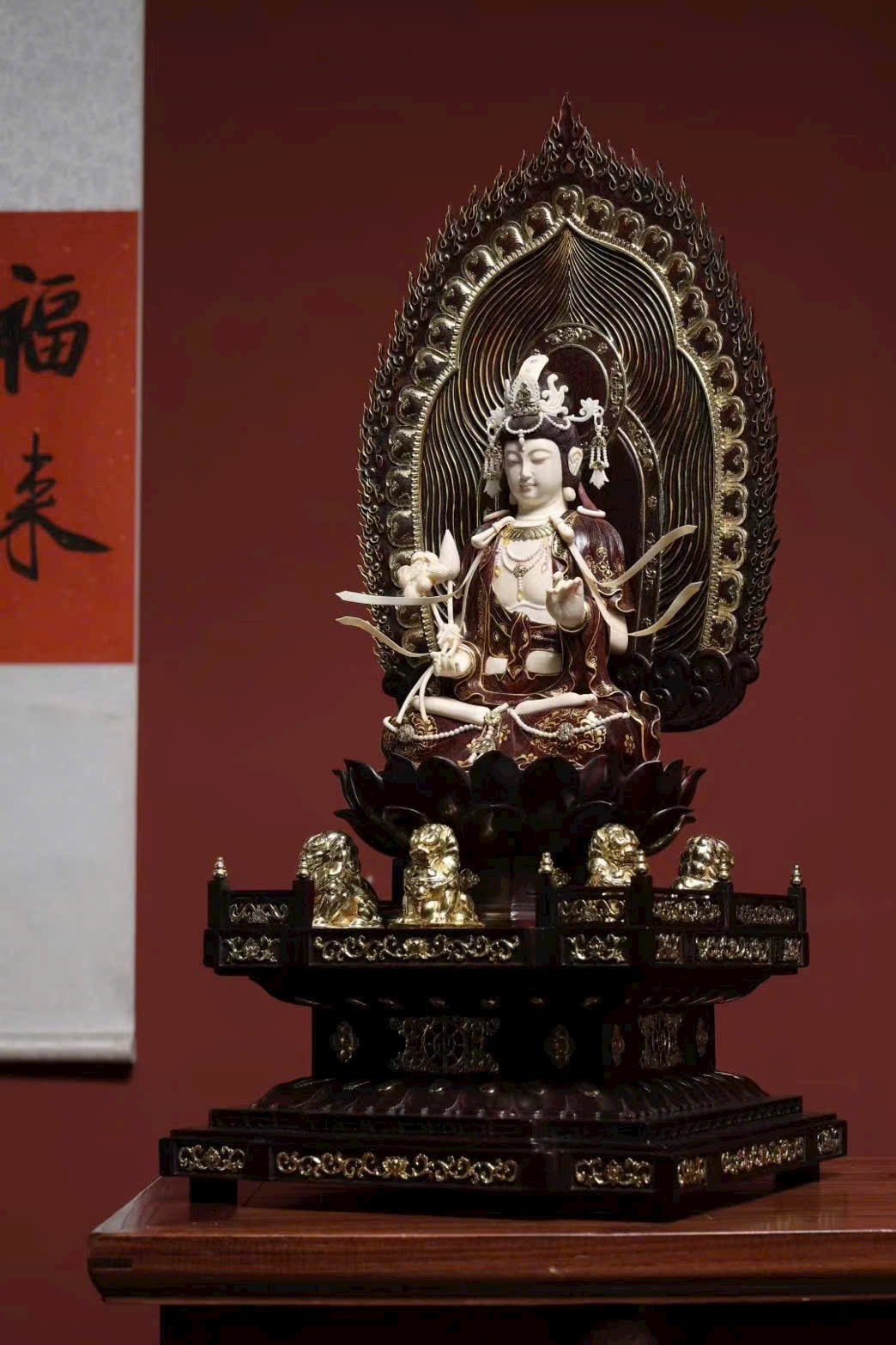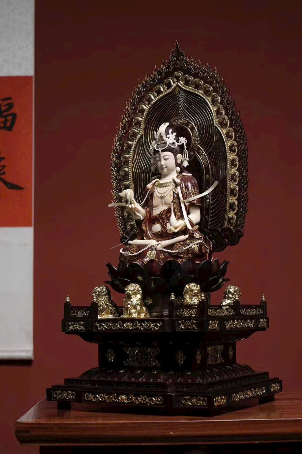 Tượng làm từ tử đàn khảm ng.à ma mút, mạ vàng, ý nghĩa từ bi – trí tuệ – bình an – phúc thọ vô lượng, kèm 5 sư tử tượng trưng “ngũ tử đăng khoa”, cát tường hưng thịnh.