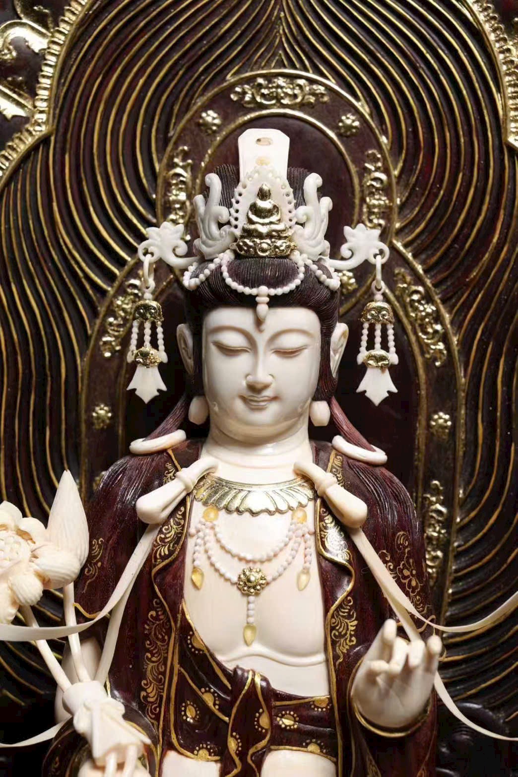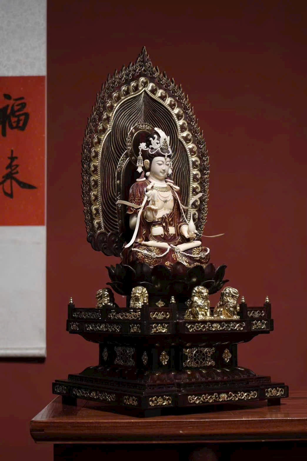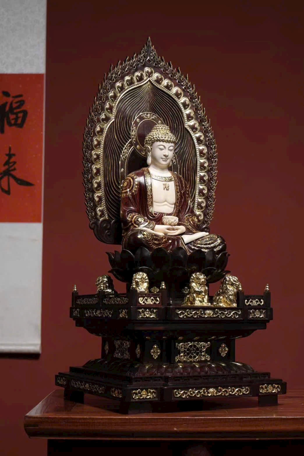 Tượng làm từ tử đàn khảm ng.à ma mút, mạ vàng, ý nghĩa từ bi – trí tuệ – bình an – phúc thọ vô lượng, kèm 5 sư tử tượng trưng “ngũ tử đăng khoa”, cát tường hưng thịnh.