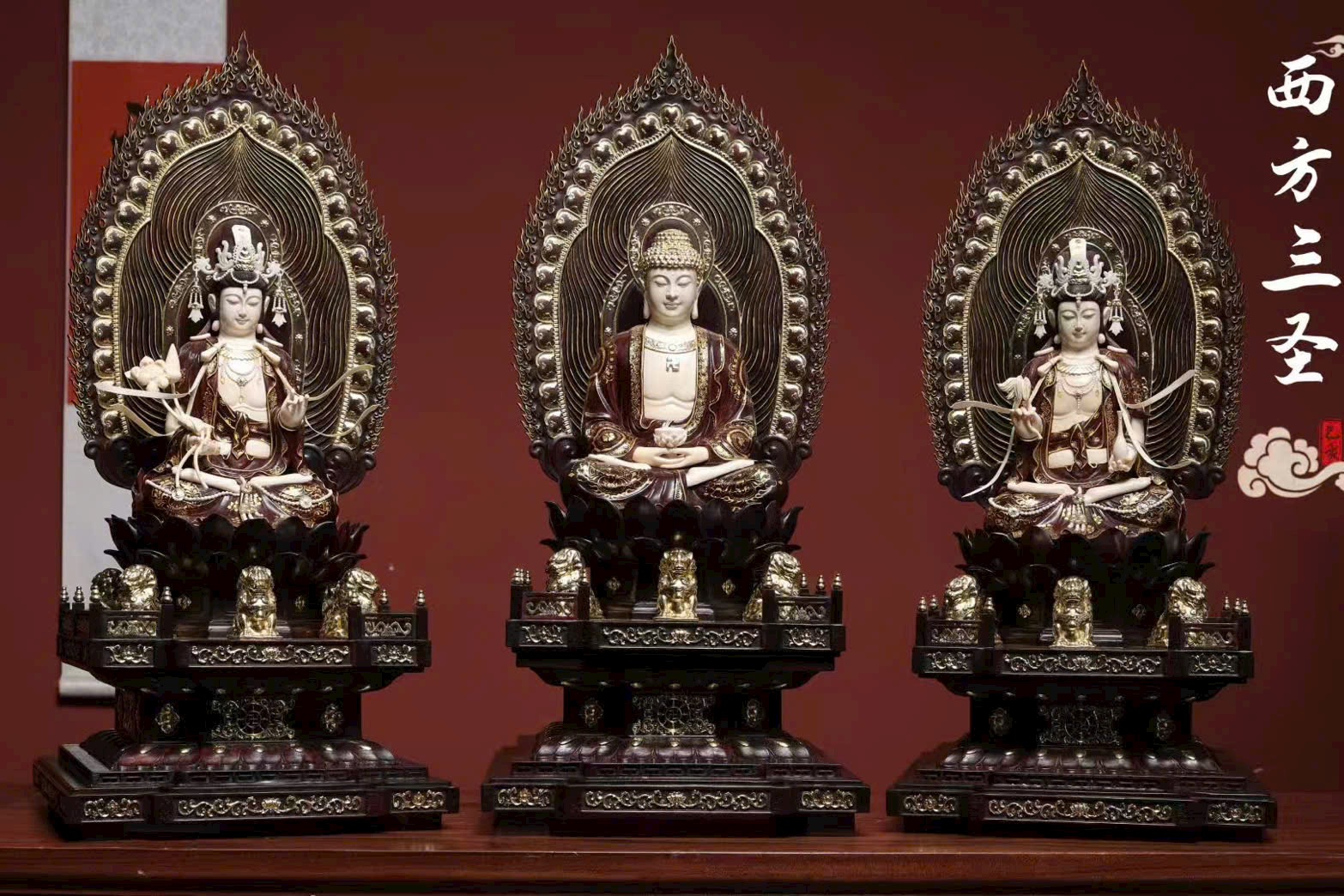 ✨ Tây Phương Tam Thánh (A Di Đà Tam Tôn) gồm: Phật A Di Đà ở giữa, Quan Thế Âm bên trái, Đại Thế Chí bên phải.