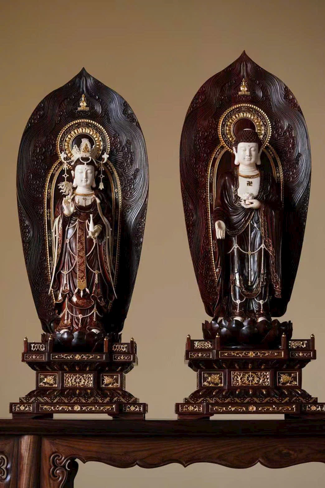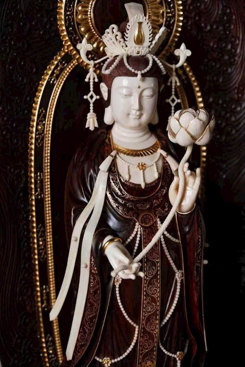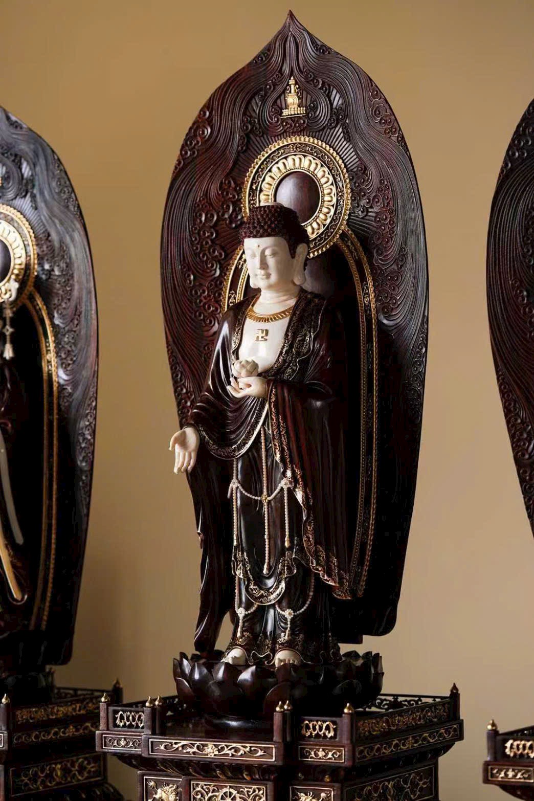 Tác phẩm chế tác từ gỗ tử đàn già, sắc gỗ trầm ấm, ánh lên vẻ cổ nhã; kết hợp cùng ngà ma mút thuần tịnh, hòa làm một thể tinh tế và trang nghiêm. Từng chi tiết chạm khắc tỉ mỉ, đường nét sinh động, thần thái của ba vị Thánh được thể hiện trọn vẹn — ánh mắt khẽ rũ xuống, dung mạo từ hòa mà uy nghi, tỏa ra hào quang phổ độ chúng sinh. Ba vị đứng trên tòa sen núi Tu-di, mang khí vận thanh tịnh và lòng từ bi vô lượng.