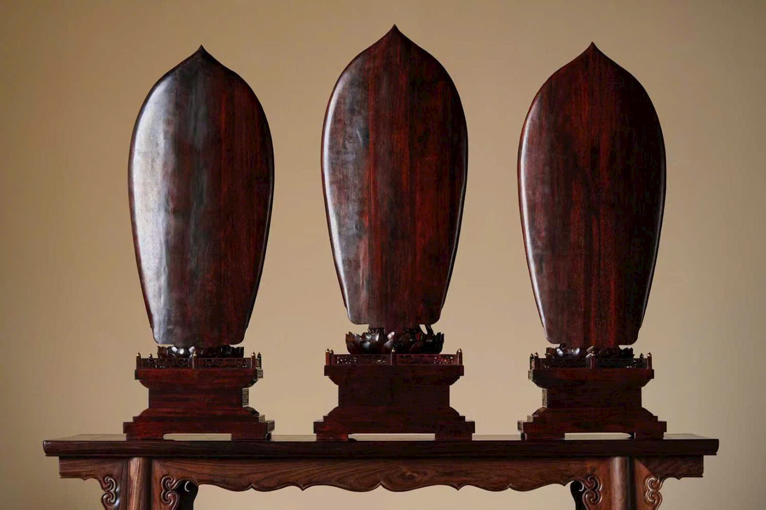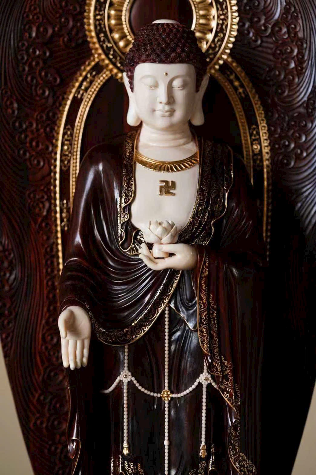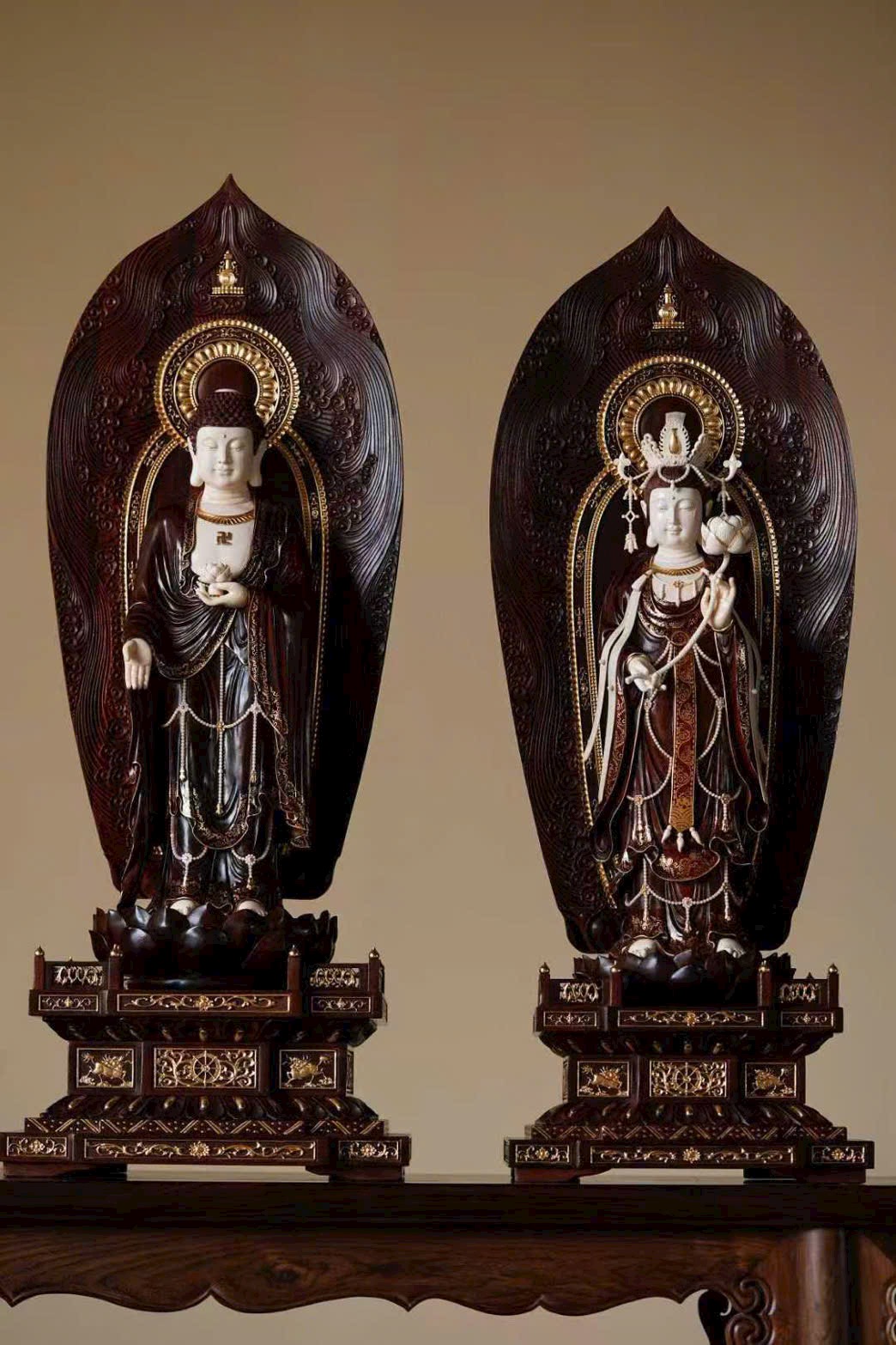 Tác phẩm chế tác từ gỗ tử đàn già, sắc gỗ trầm ấm, ánh lên vẻ cổ nhã; kết hợp cùng ngà ma mút thuần tịnh, hòa làm một thể tinh tế và trang nghiêm. Từng chi tiết chạm khắc tỉ mỉ, đường nét sinh động, thần thái của ba vị Thánh được thể hiện trọn vẹn — ánh mắt khẽ rũ xuống, dung mạo từ hòa mà uy nghi, tỏa ra hào quang phổ độ chúng sinh. Ba vị đứng trên tòa sen núi Tu-di, mang khí vận thanh tịnh và lòng từ bi vô lượng.