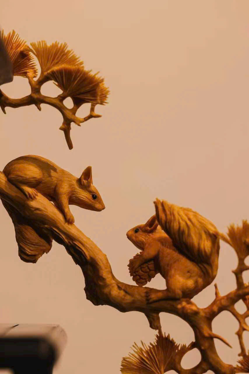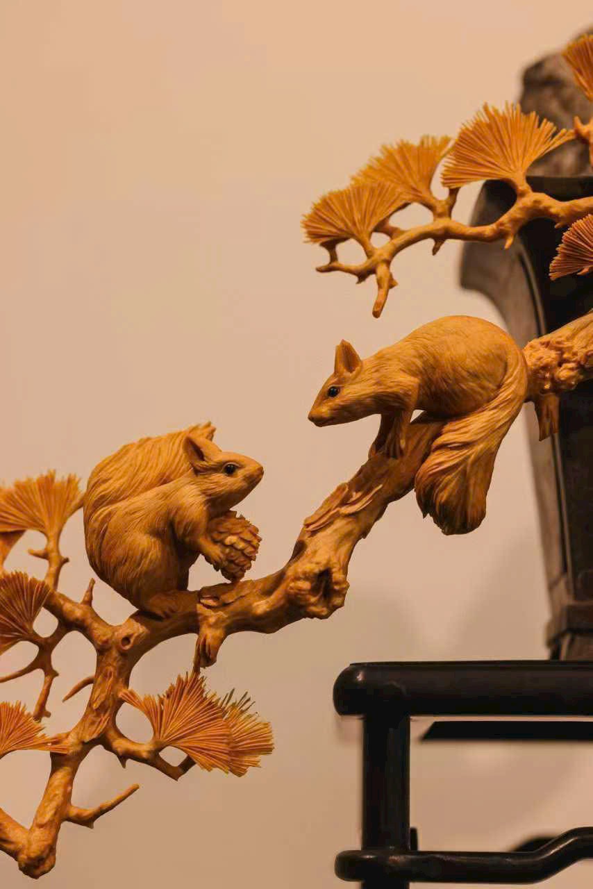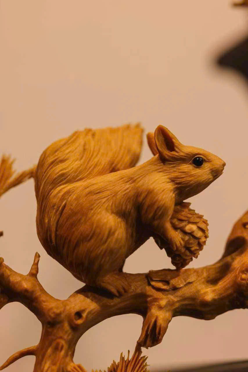 Lông tơ được khắc họa bồng bềnh dày dặn, không chỉ thể hiện dáng vẻ tròn trịa, đáng yêu của chú sóc mà còn toát lên nét linh hoạt nhẹ nhàng. Ôm cành quả đầy, nhảy lên án thư, mang đến chút linh khí núi rừng.