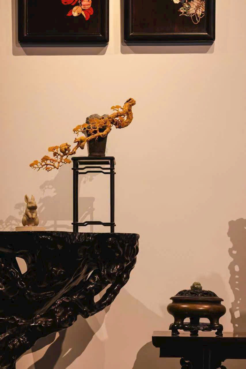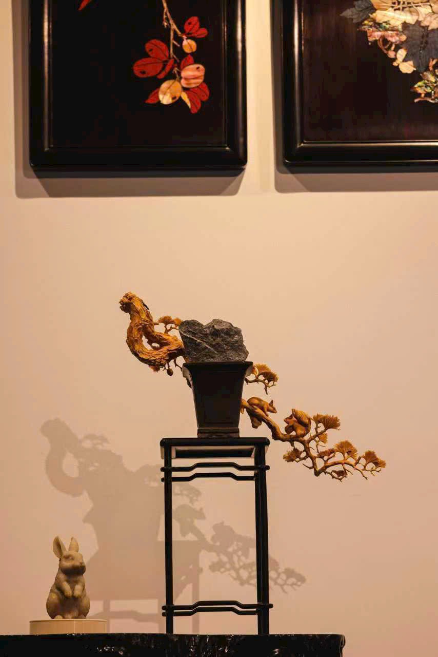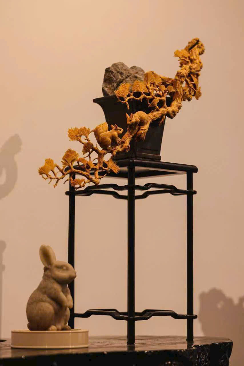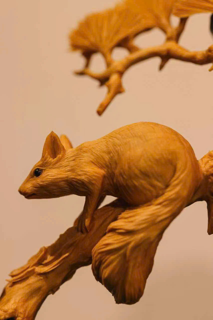 Lông tơ được khắc họa bồng bềnh dày dặn, không chỉ thể hiện dáng vẻ tròn trịa, đáng yêu của chú sóc mà còn toát lên nét linh hoạt nhẹ nhàng. Ôm cành quả đầy, nhảy lên án thư, mang đến chút linh khí núi rừng.