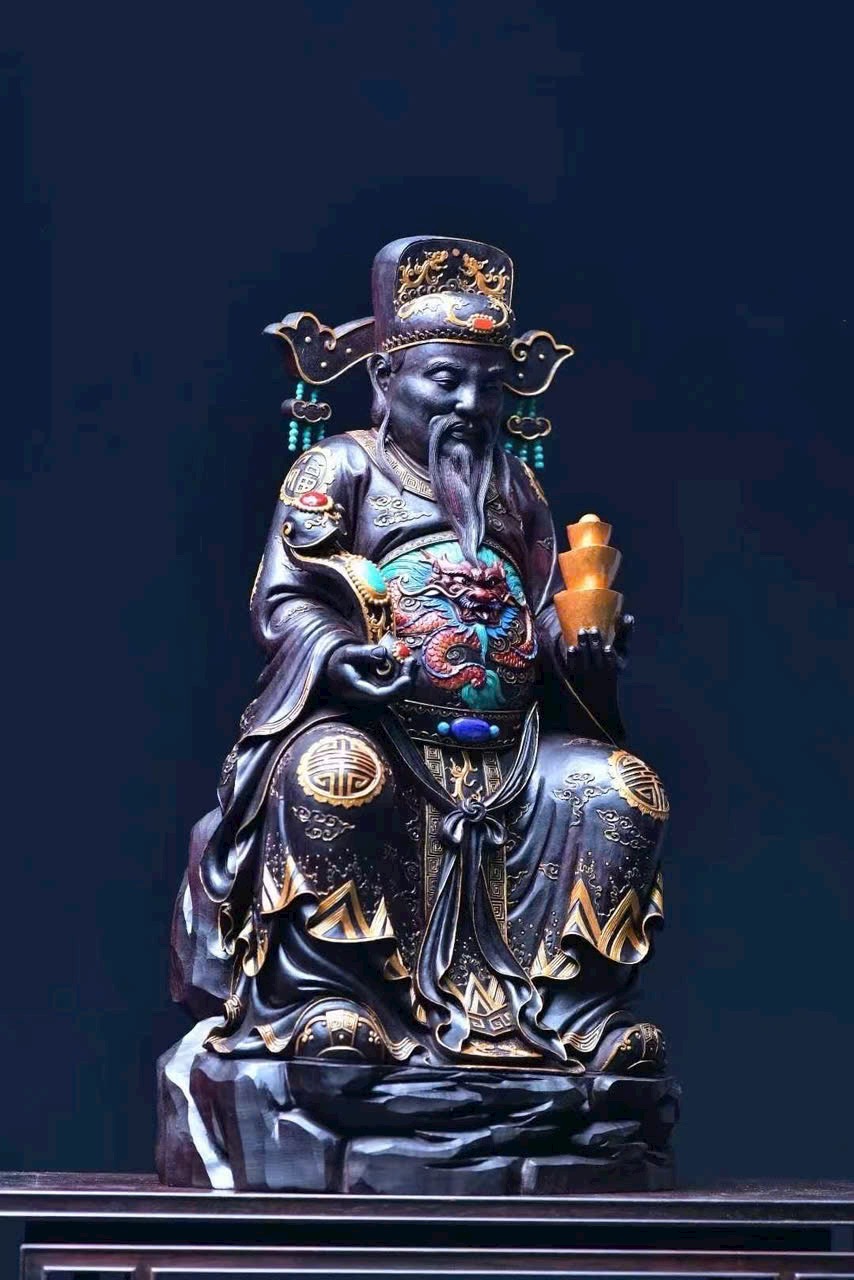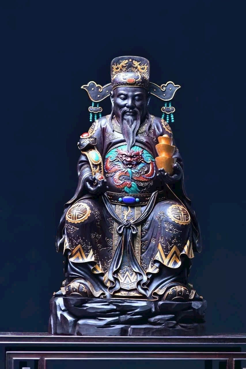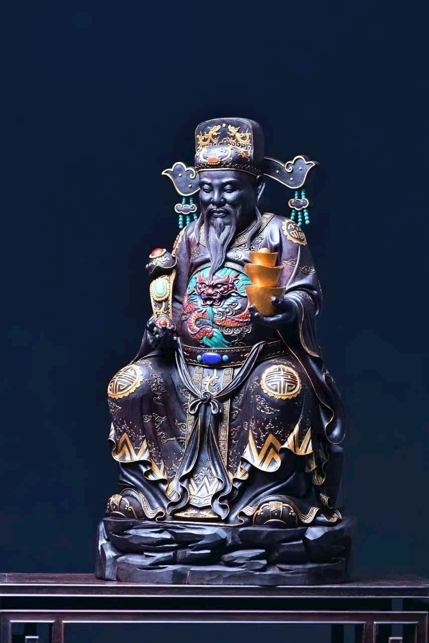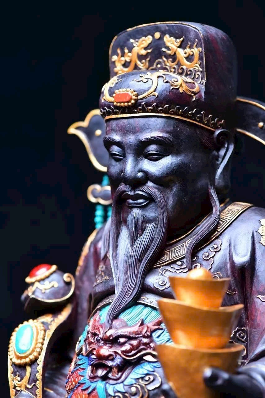Chọn gỗ tử đàn mật độ cao, chạm nguyên khối. Tài Thần mang điềm lành, chiêu tài tấn lộc, nét mặt sinh động, thần thái hoan hỷ. Đồ phẩm tinh xảo, thích hợp thờ cúng trong gia đình.
