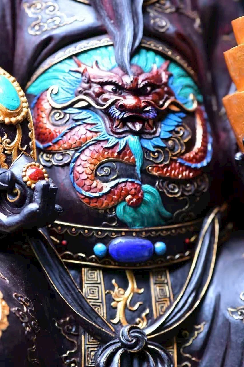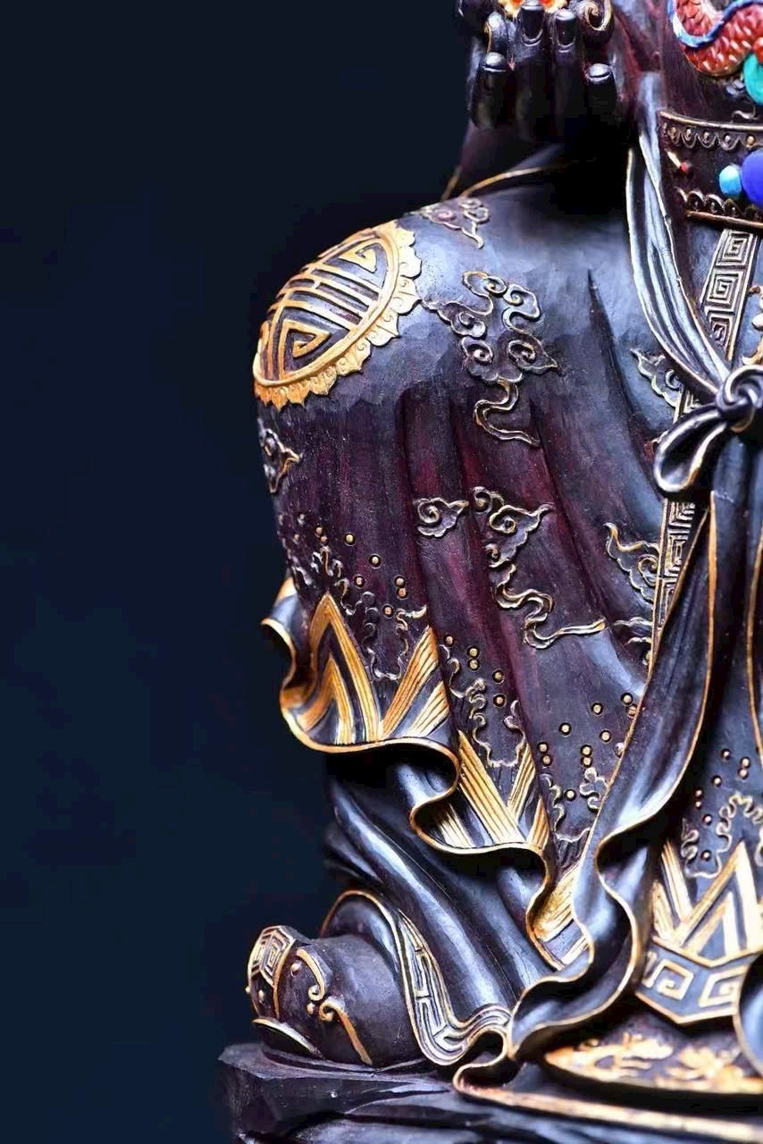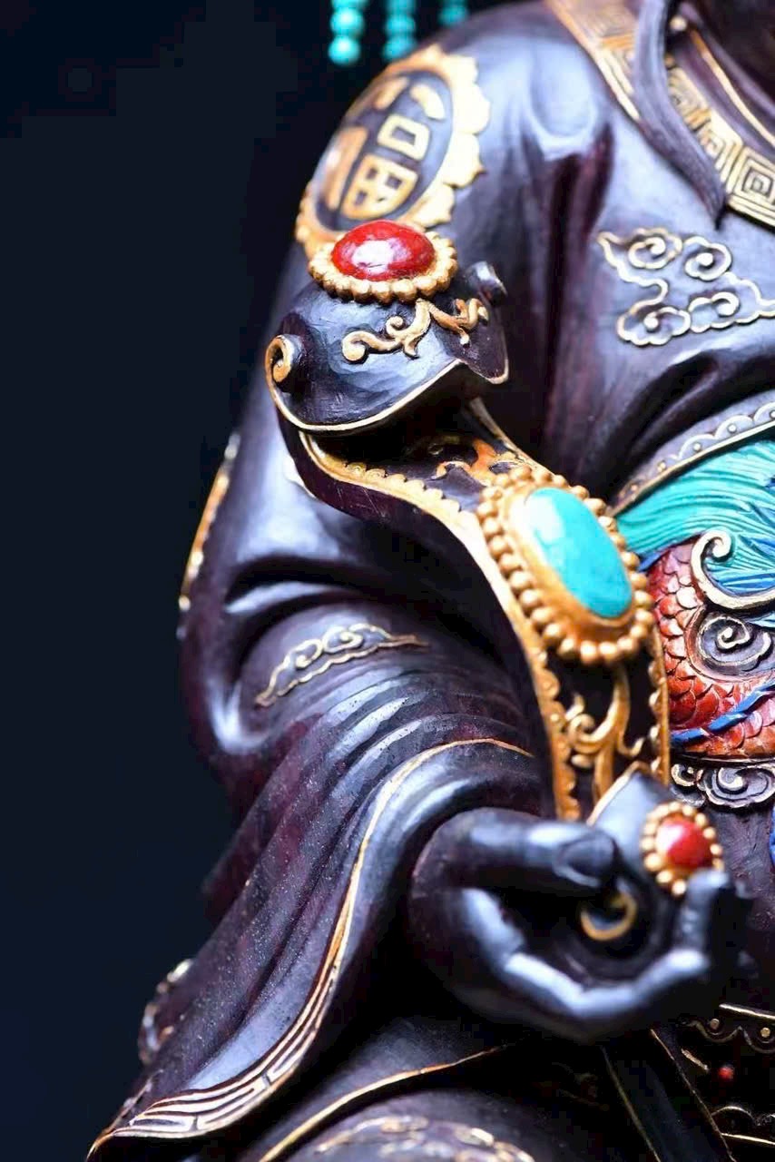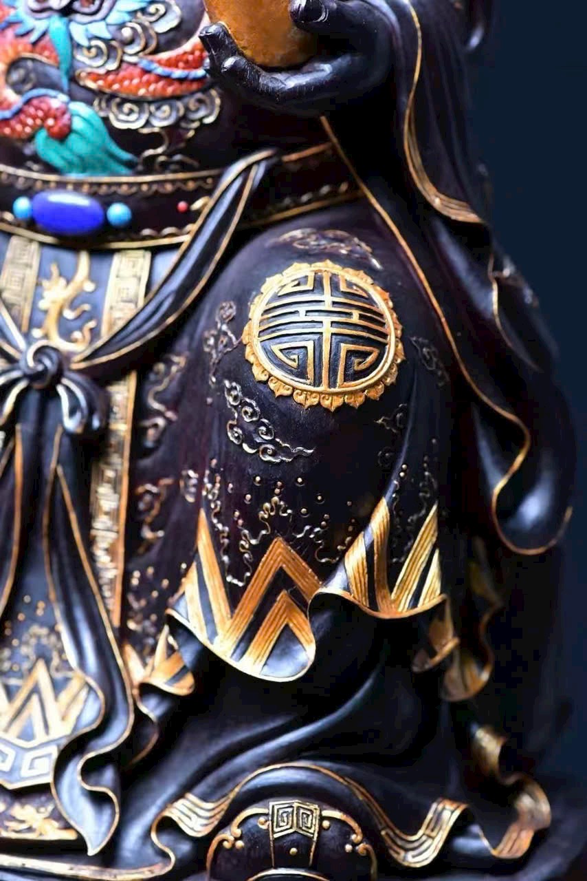 Chọn gỗ tử đàn mật độ cao, chạm nguyên khối. Tài Thần mang điềm lành, chiêu tài tấn lộc, nét mặt sinh động, thần thái hoan hỷ. Đồ phẩm tinh xảo, thích hợp thờ cúng trong gia đình.