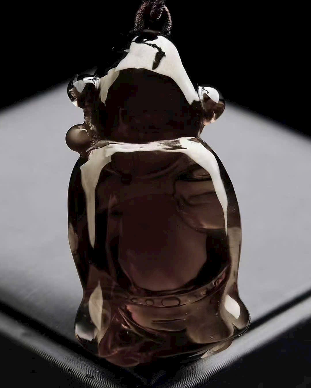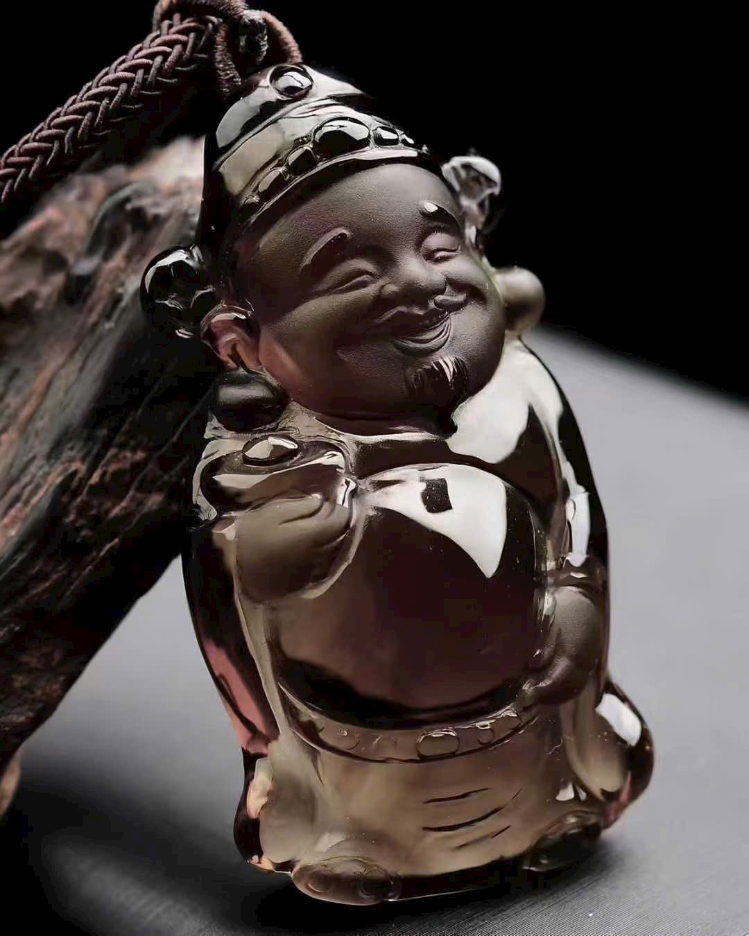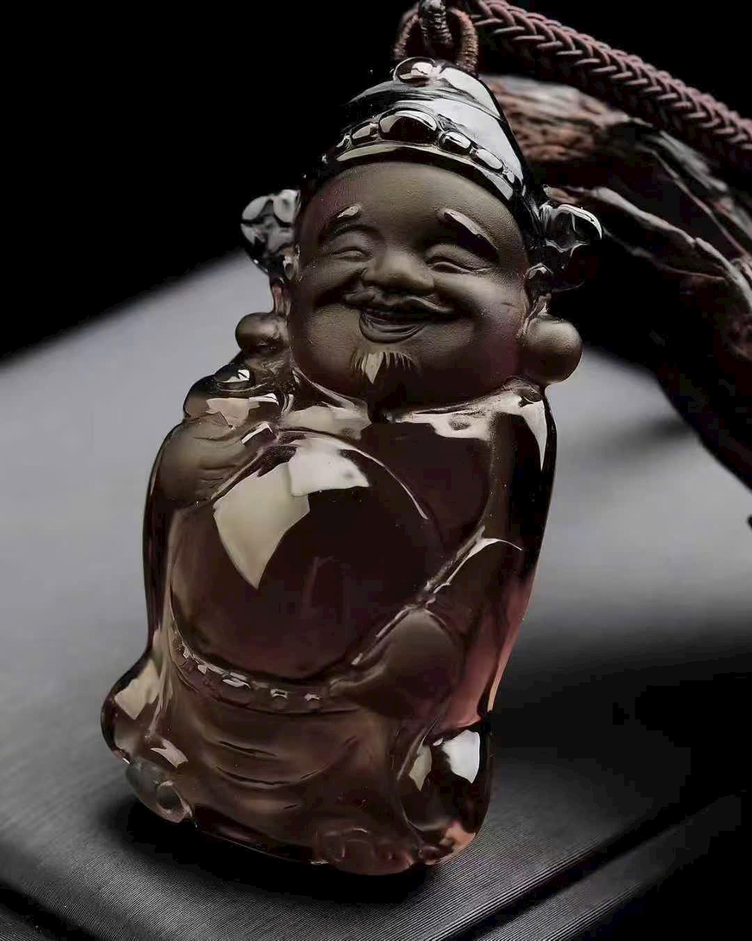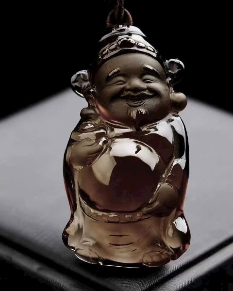 Tạo hình Thần Tài chạm khắc tinh xảo, thần thái sinh động. Mang ý nghĩa chiêu tài nạp phúc, hộ thân bình an, thuận lợi hanh thông. Thạch anh trà vàng thường được yêu thích bởi biểu trưng thu hút tài khí, hỗ trợ chuyển vận tích cực.